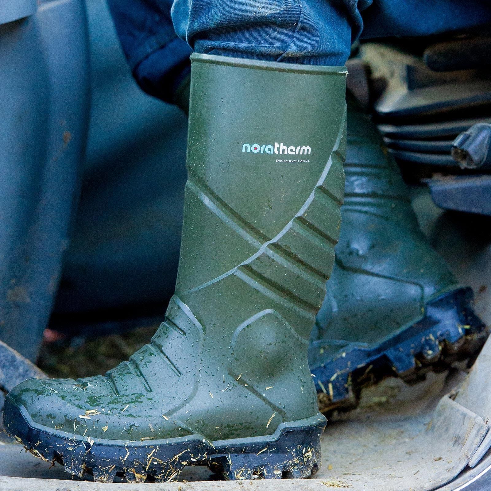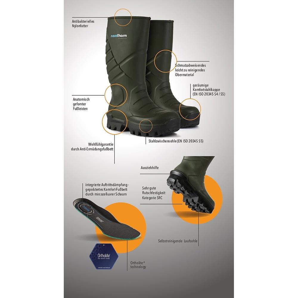Den stabila Noratherm S5-säkerhetsstöveln imponerar med sin bekväma känsla även under kalla dagar. Den kännetecknas av sin mycket goda rullrörelse tack vare flexiblen axel i vristen. Det nya Elastopan PU-systemet skyddar ännu effektivare mot många aggressiva ämnen och är dessutom lättare, mer hållbart och mer isolerande än gummi.