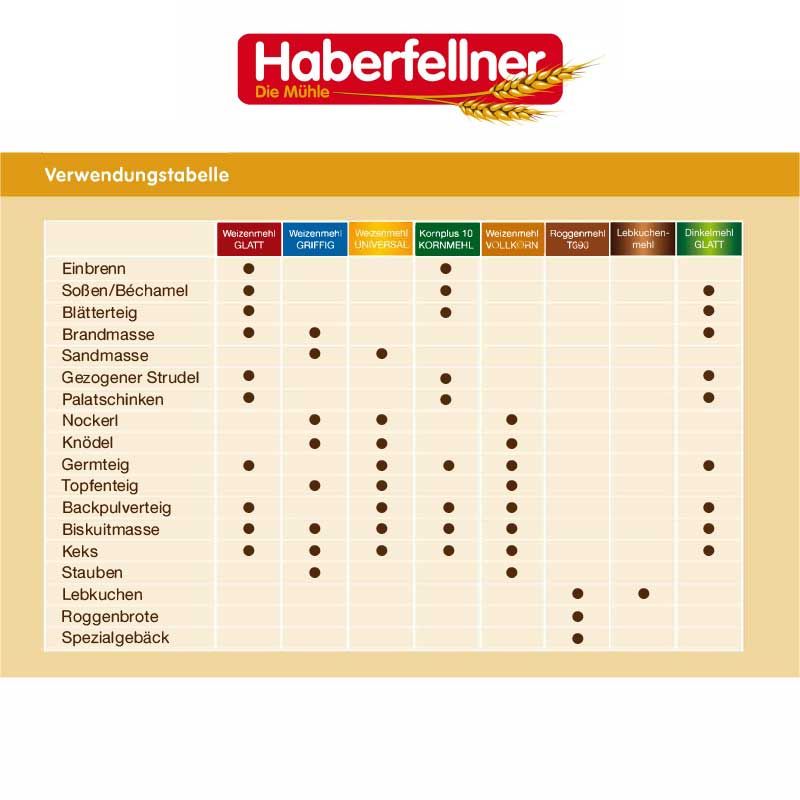 Haberfellner Speltmjöl typ 630 (enligt tysk typografi) / W 700 (enligt österrikisk typografi) är en av klassikerna bland hushålls- och kakmjöl och kan användas i nästan alla konventionella bak- och matlagningsrecept i stället för vetemjöl. Oavsett om det handlar om bakverk, kakor, pajer, nudlar, dumplings eller nötta brödbröd - dinkelmjölet är en riktig allroundare i köket! Endast den bästa österrikiska speltmalmen mals till speltmjölet typ 630 / W 700 smooth. Spelt är garanterat GMO-fritt och kontrolleras strikt med hjälp av bekämpningsmedel.