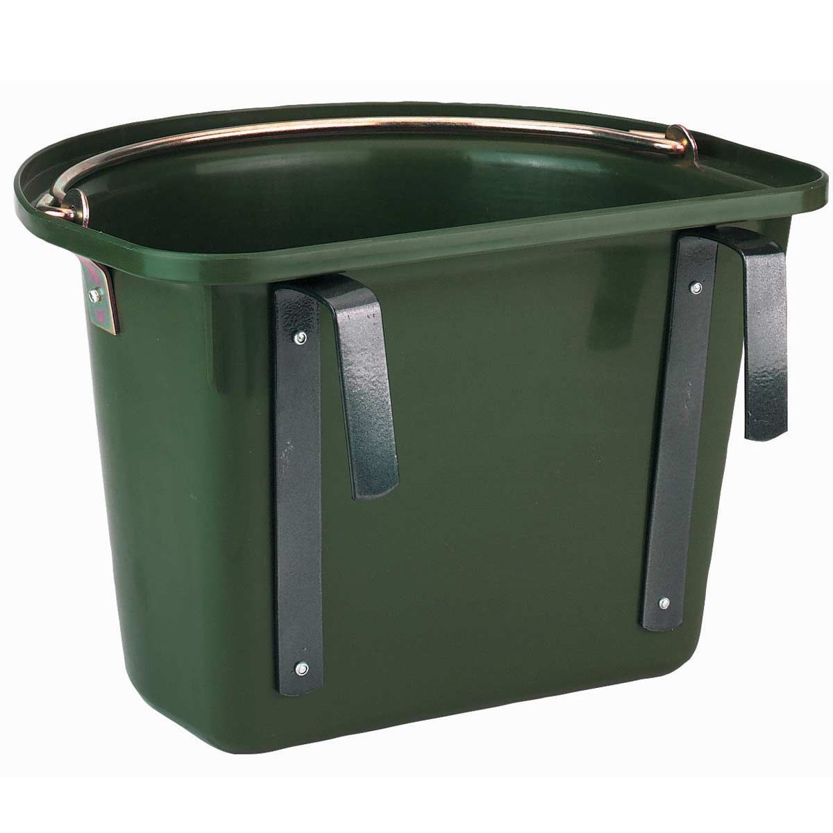 Den här robusta foderhinken med sina metallfästen är idealisk för att hänga i transportbilar eller häststallar. Fodertråget har ett extra bärhandtag i metall.
