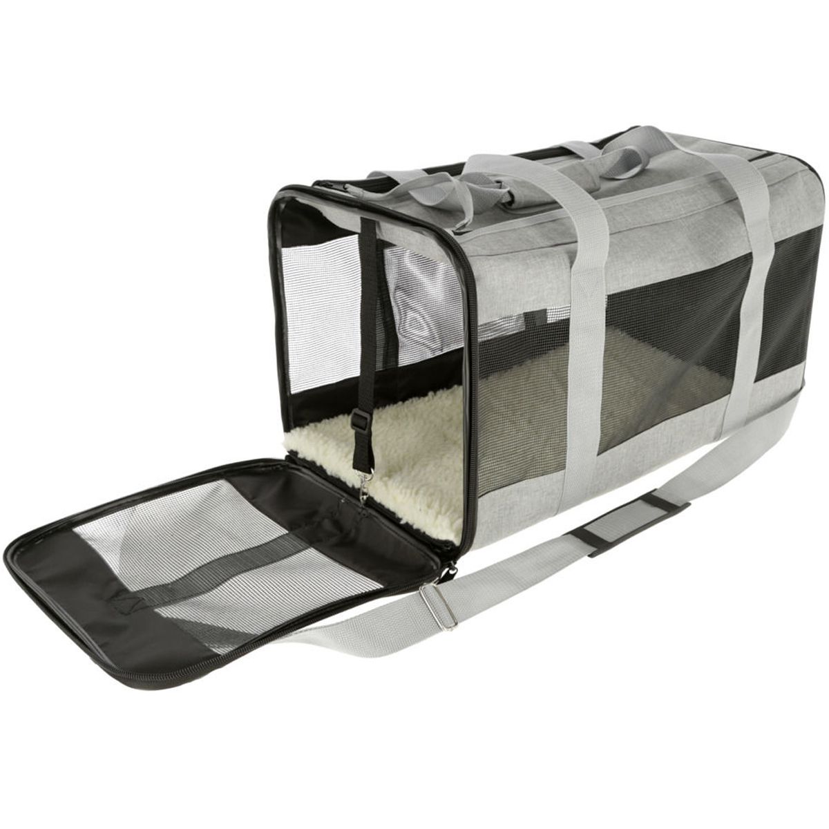 Denna moderna hundväska är ett riktigt blickfång på din hand! Utrustad med en löstagbar fuskpälsinlägg säkerställer den behaglig komfort. På insidan av väskan finns ett justerbart kort koppel som förhindrar att den hoppar ut. Den praktiska väskan från Kerbl kan användas som bärväska med den justerbara och avtagbara axelremmen samt med bärhandtagen. Generösa mesh-insatser säkerställer optimal luftcirkulation inuti påsen. För extra förvaringsutrymme har transportväskan två extra fickor där du kan förvara snacks eller hundavfallspåsar.