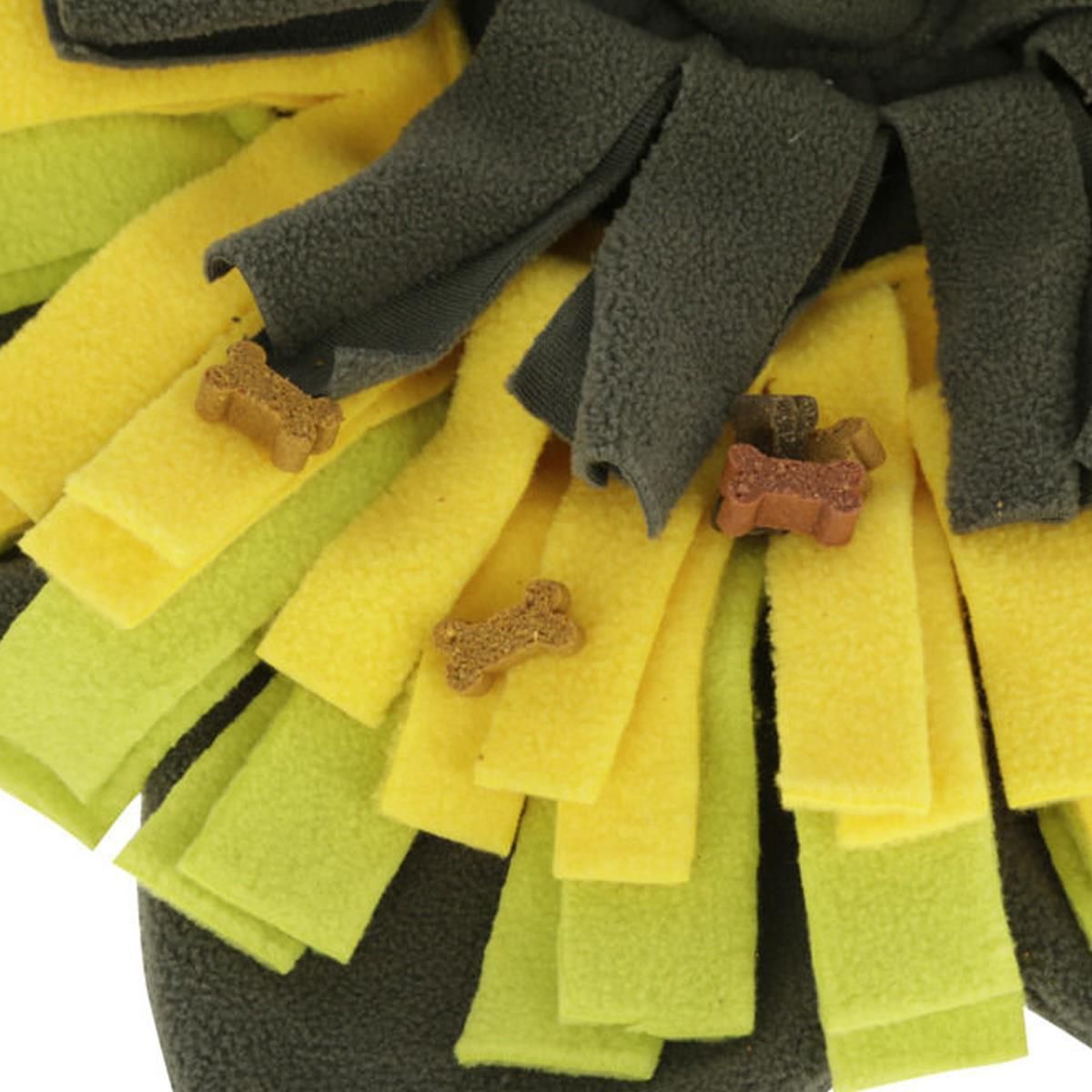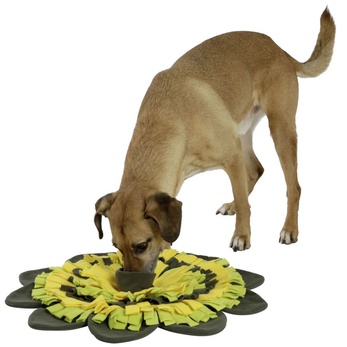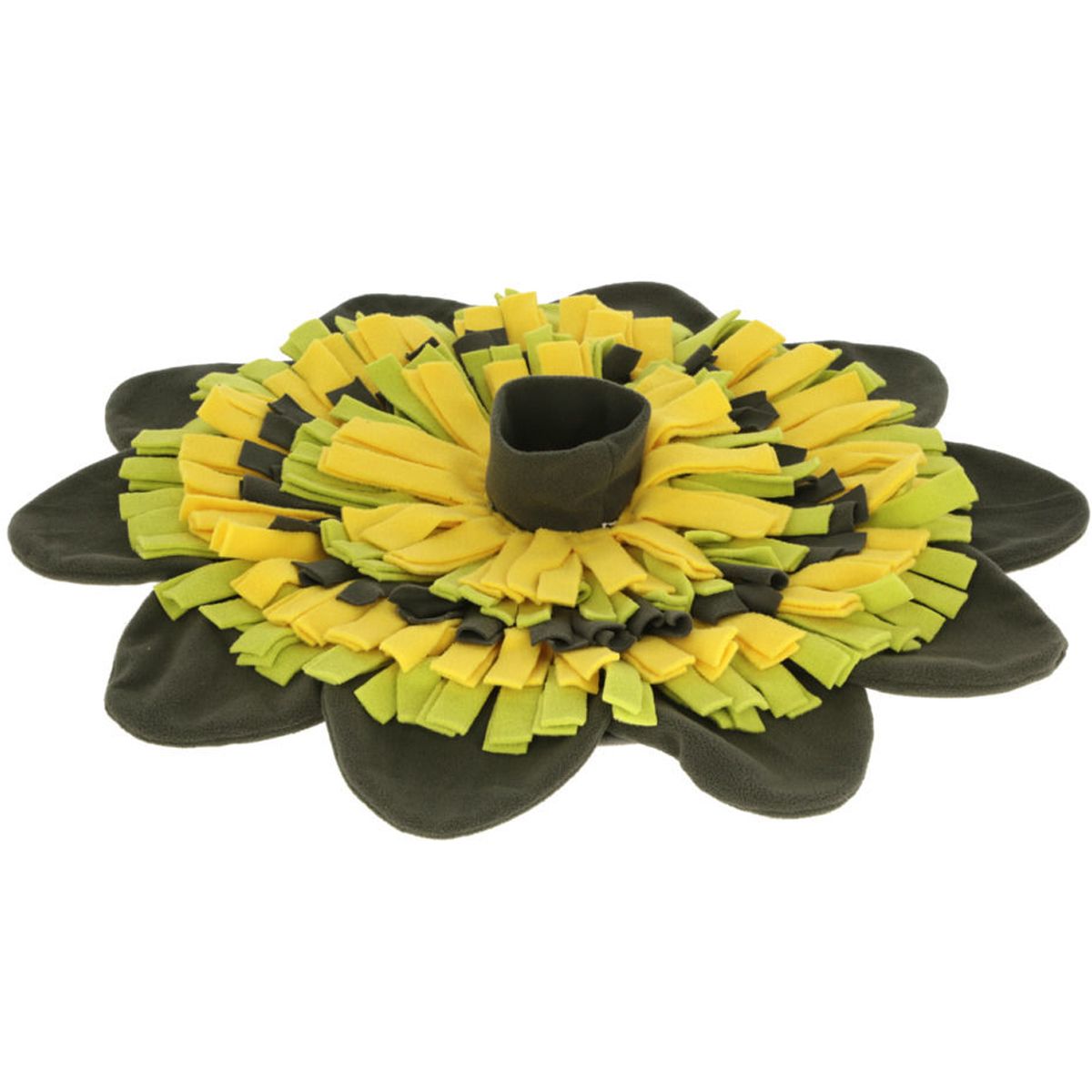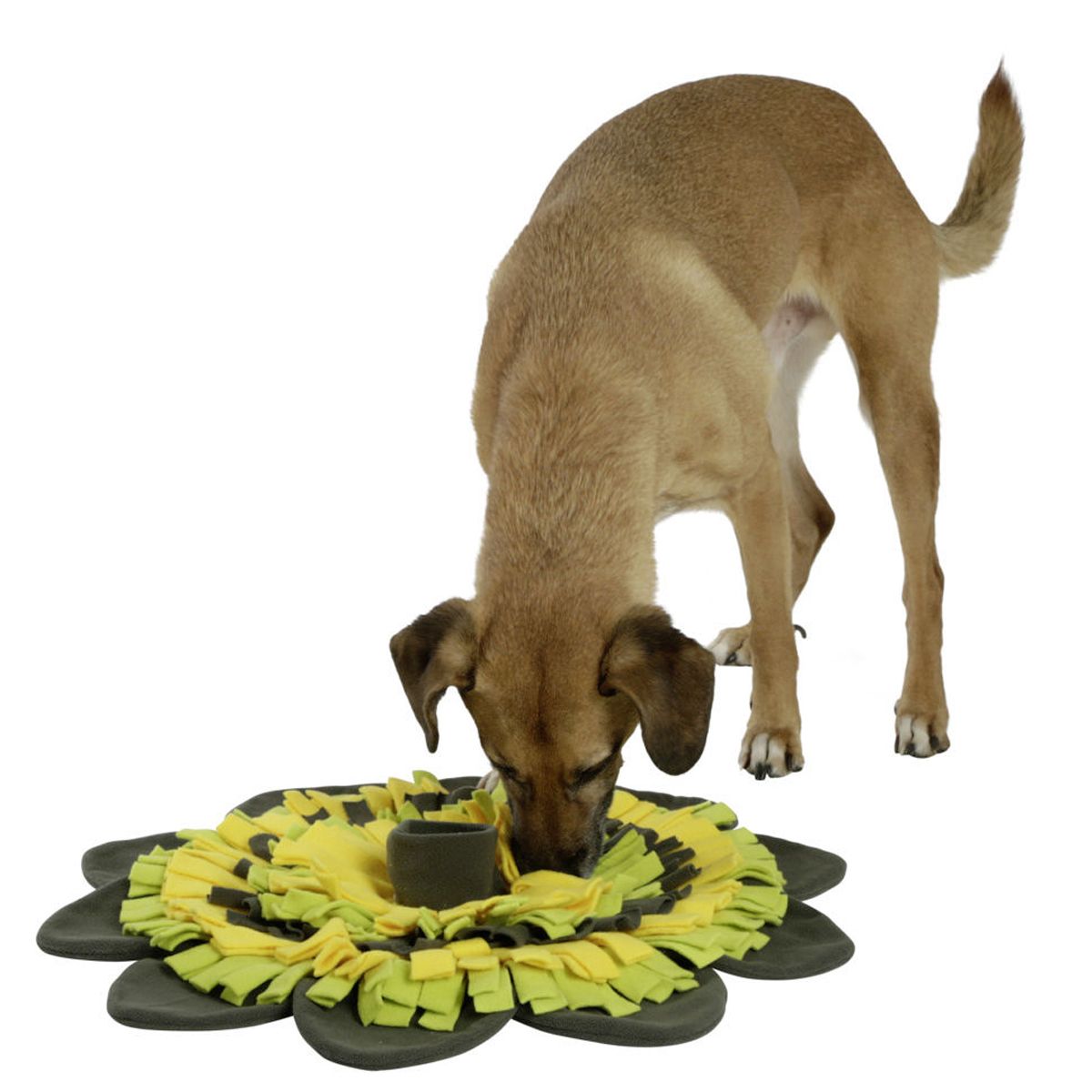 Denna speciella intelligensleksak för hundar och katter hjälper till att bryta vanan att äta hastigt och främjar djurets koncentration. Hund- och kattsnuffmattan erbjuder många olika alternativ för att gömma torrfoder, godsaker eller leksaker och hålla din hund sysselsatt i timmar. Botten på Sunflower sniffing mattan är försedd med en halkskyddsbeläggning och förhindrar halkning. Djuret nosar fram sina godsaker och minskar därmed stressen.