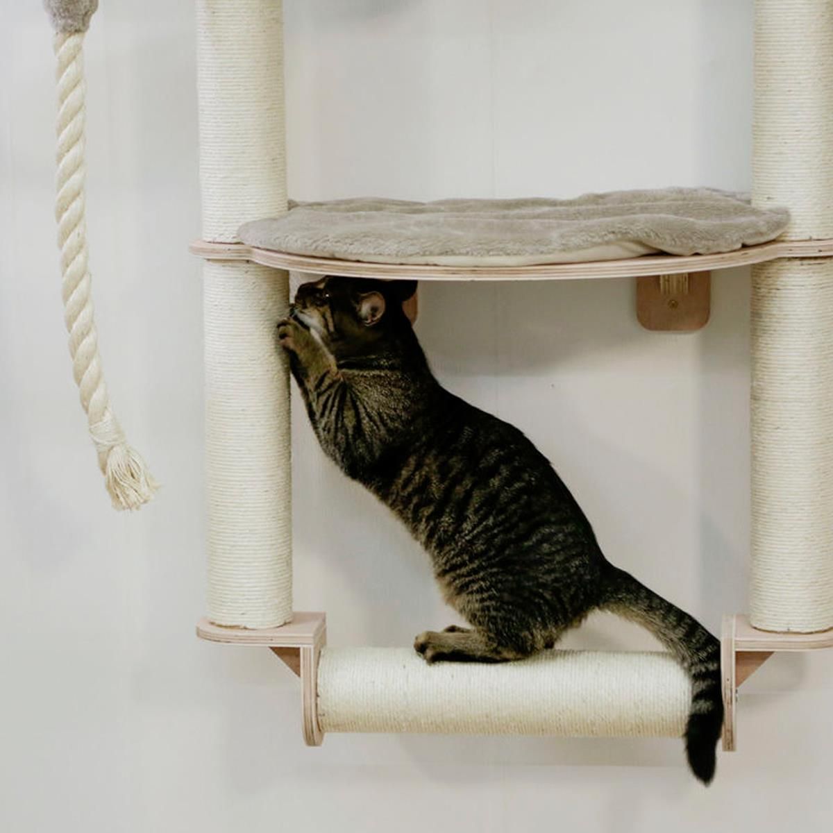 Den kreativa väggskrapstolpen består av flera komponenter. Förutom sex tjocka, långa sisalstammar ingår två liggplatser, en mysig hängmatta, en solstol och en utsiktsplattform med en mysig säng. Kuddarna kan tas av och tvättas i 30°C.