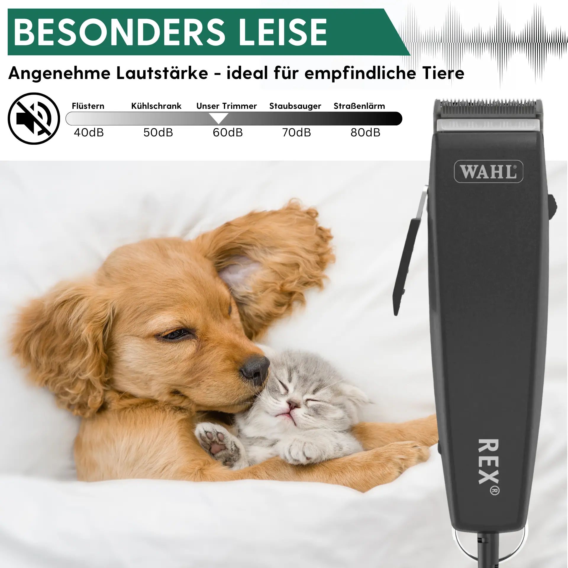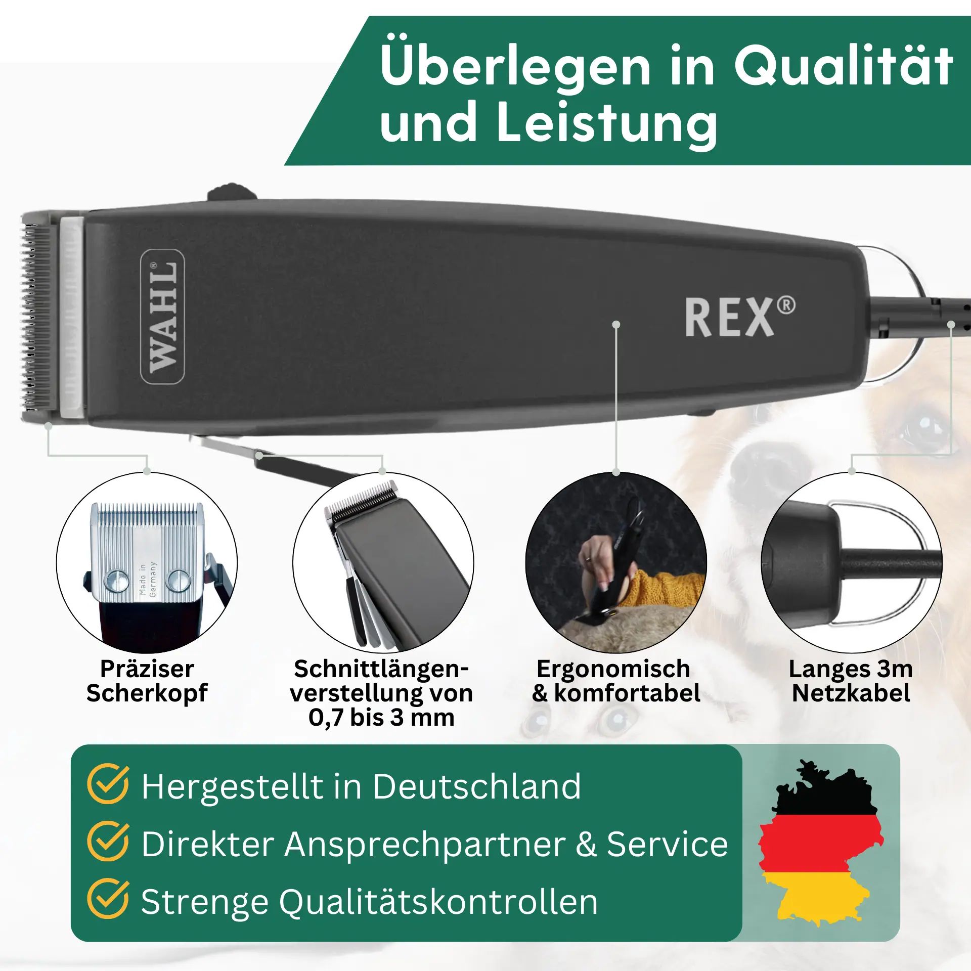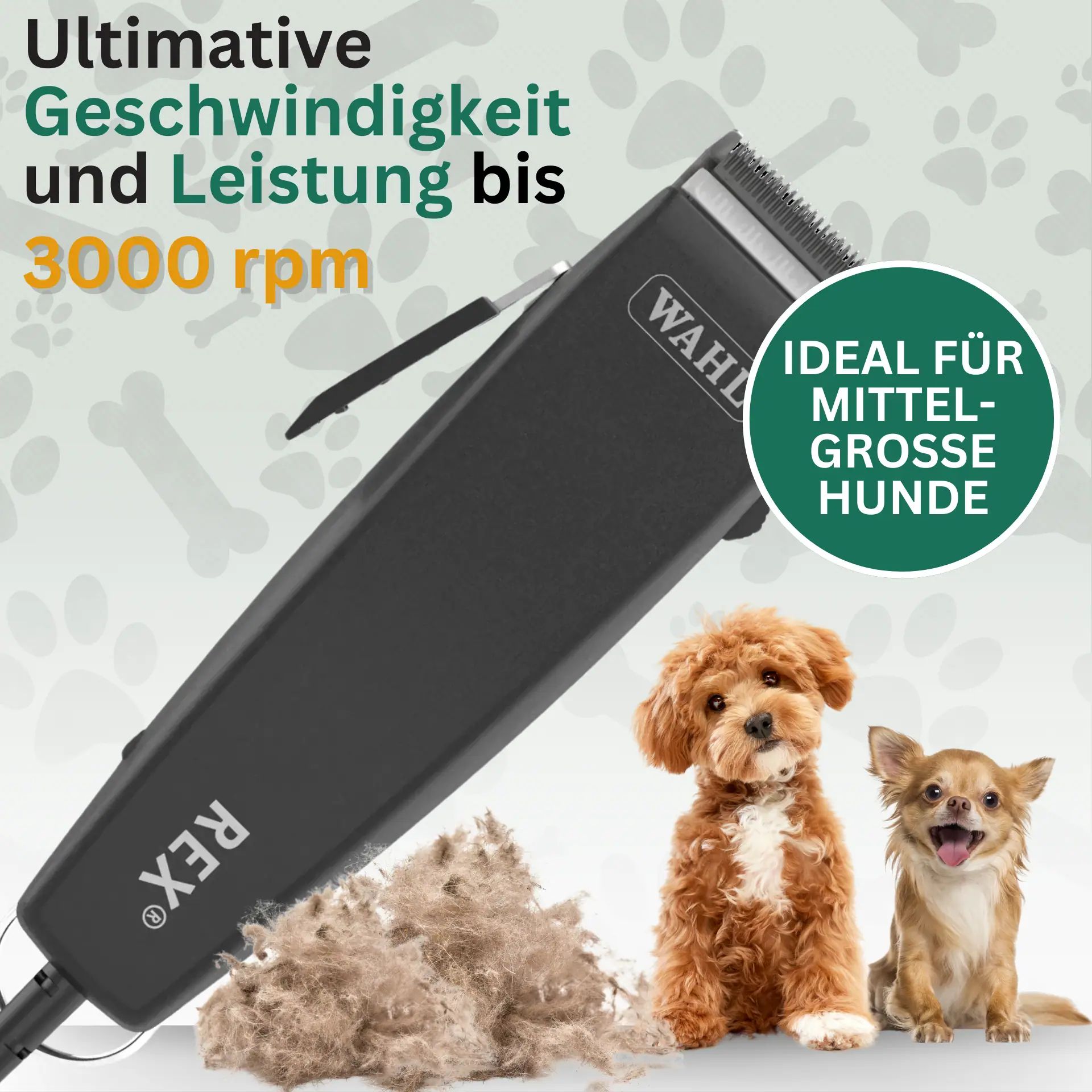 Wahl Rex klippare är idealisk för att klippa medelstora hundar. Jämfört med andra klippare går klipparen mycket smidigt och är särskilt tyst (60 dB), vilket gör att den är lämplig även för bullerkänsliga och nervösa djur. Tack vare en robust precisionsdrift och beprövad teknik garanteras hög klippkapacitet. Den behändiga Wahl Rex drivs med nätström och erbjuder tillräckligt med utrymme att röra sig under arbetet tack vare en 3 meter lång, flexibel nätkabel. Den är också ergonomiskt formad och ligger därför säkert i handen. Den optimalt genomtänkta viktfördelningen gör det möjligt att arbeta med låg trötthet.