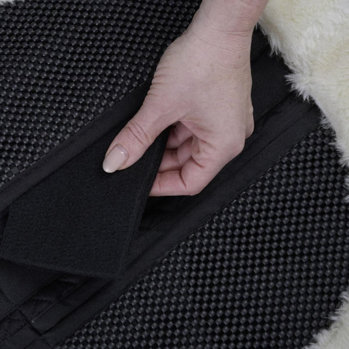 Du kan placera pälsdynorna direkt på hästens rygg eller mellan sadelduken och sadeln. Det här fluffiga sadelunderlaget är skuret i en anatomisk ryggform med extra tjock och pälsvänlig syntetpäls. Sadelkudden absorberar det tryck som ryttarens vikt ger på hästens rygg och kan användas för att ändra sadelns passform med hjälp av de medföljande inläggen.