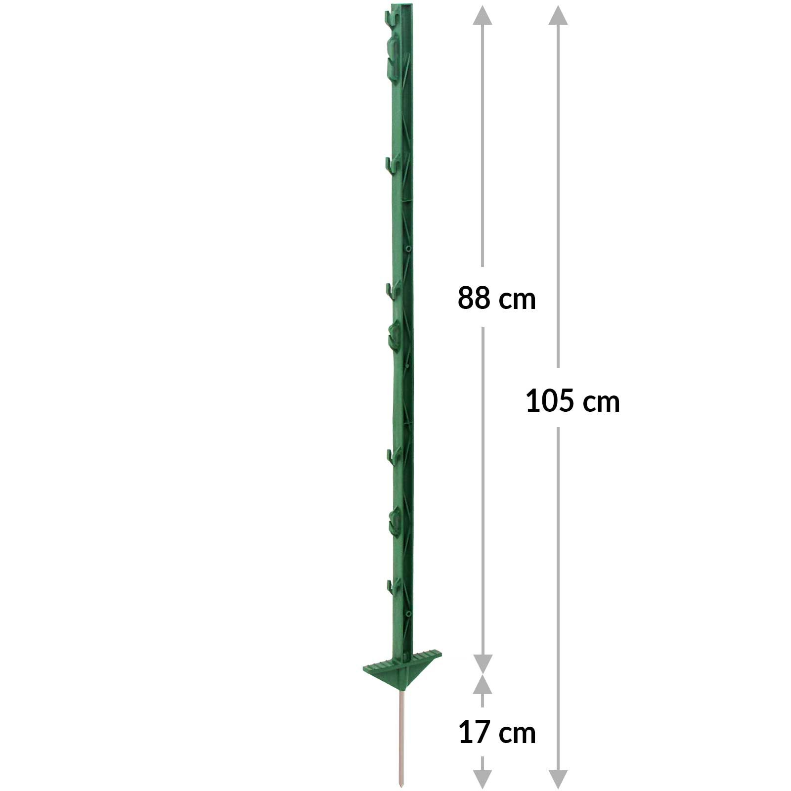 Stolpen är kompatibel med alla vanliga band, linor, strängar eller trådar och har dessutom ytterligare längsgående förstärkningar för extra stabilitet. Med 5 repöglor, 2 bandöglor (2 cm) och 1 bandögla (4 cm) ger stolpen ytterligare flexibilitet när du sätter upp ett elstängsel. Plastpålens totala längd är 105 cm, längden över marken är 88 cm.