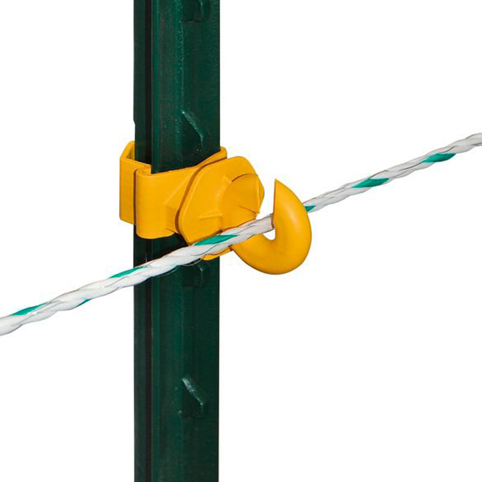 T-post-ringisolatorn är lämplig för att fästa tråd, trådtråd och rep upp till 6 mm och tejp upp till 10 mm bred på T-posten. För ledarmaterialet genom isolatorhuvudet utan verktyg och dra åt ledarmaterialet vid behov. Tack vare de mycket goda isoleringsegenskaperna hos ringisolatorn förhindras spänningsförluster från ledarmaterialet till T-stolpen och ditt stängsel blir säkrare.