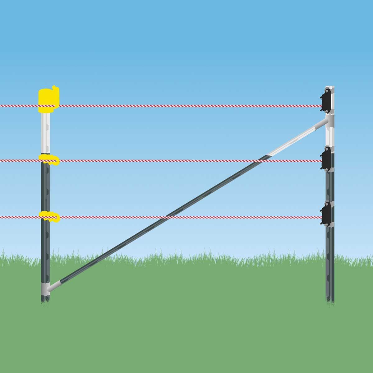 Vårt startset för staket är tillverkat av extremt stark, varmförzinkad metall för extra styrka och hållbarhet. T-stolparnas diagonala förbindelse garanterar en utmärkt spänning och stabilitet hos betesstängslet och hjälper dig att stänga in dina djur på ett säkert sätt.