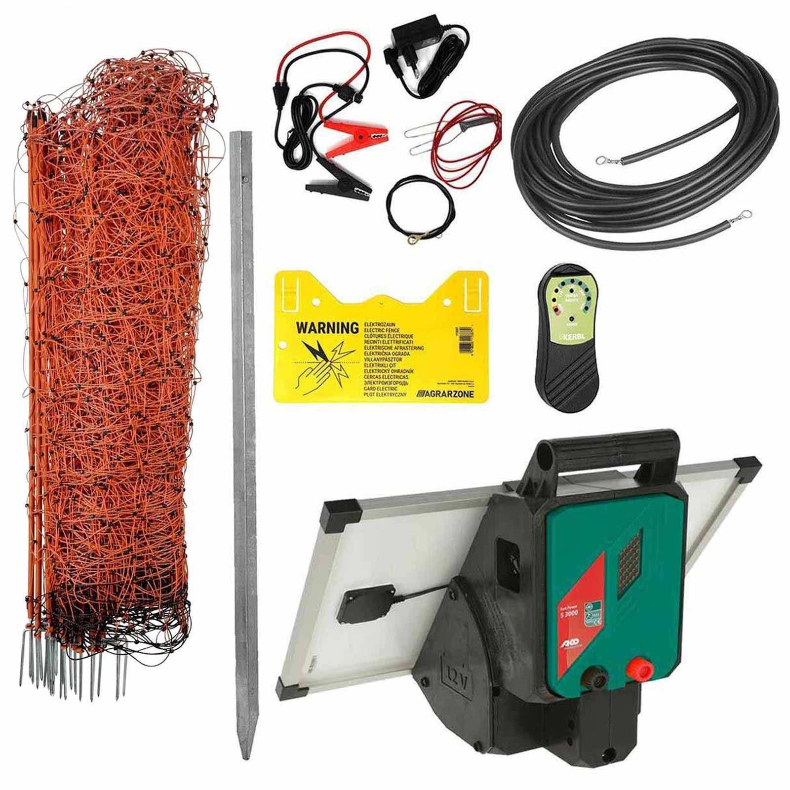 (inkl.: 1x fast monokristallin solcellsmodul 25 Watt, 1x jord-/monteringsspik i två delar, 1x 12 V AGM-batteri, 1x anslutningskabel för stängsel, 1x jordkabel). - 1x fårnät, 50 m, 90 cm, dubbla spikar, orangegult, elektrifierande