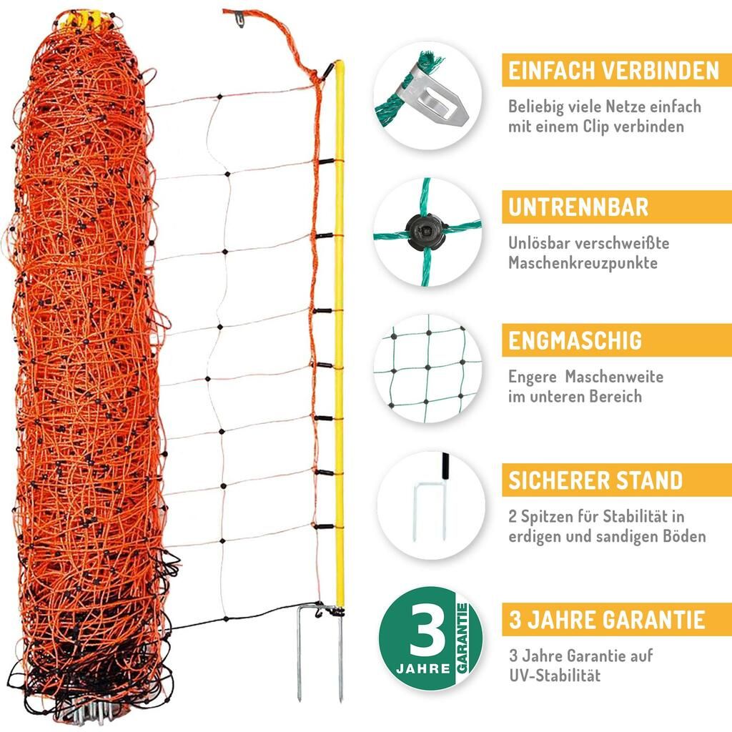 Fårstängelset innehåller ett 50 m långt nät med en höjd på 90 cm. Betesnätet har en ljus orange signalfärg, vilket fungerar som en naturlig avskräckning och bättre synlighet. Nätet hålls säkert på plats av 14 mycket stabila glasfiberstolpar med dubbla spikar. Den dubbla spetsen ger större stabilitet i jordiga och sandiga jordar jämfört med en enkel spets. Av de trådar som inte innehåller plast är de åtta främsta levande. Marksträngen är inte strömförande för att inte avbryta elflödet genom gräset. Vid behov kan du enkelt förlänga pilnätet med andra nät. Optimalt strömflöde säkerställs också när flera elektroniska nät är sammankopplade upp till en maximal längd av ca 500 m (utan vegetation).