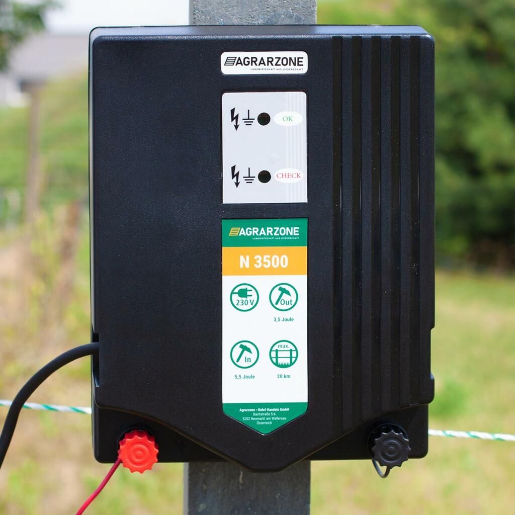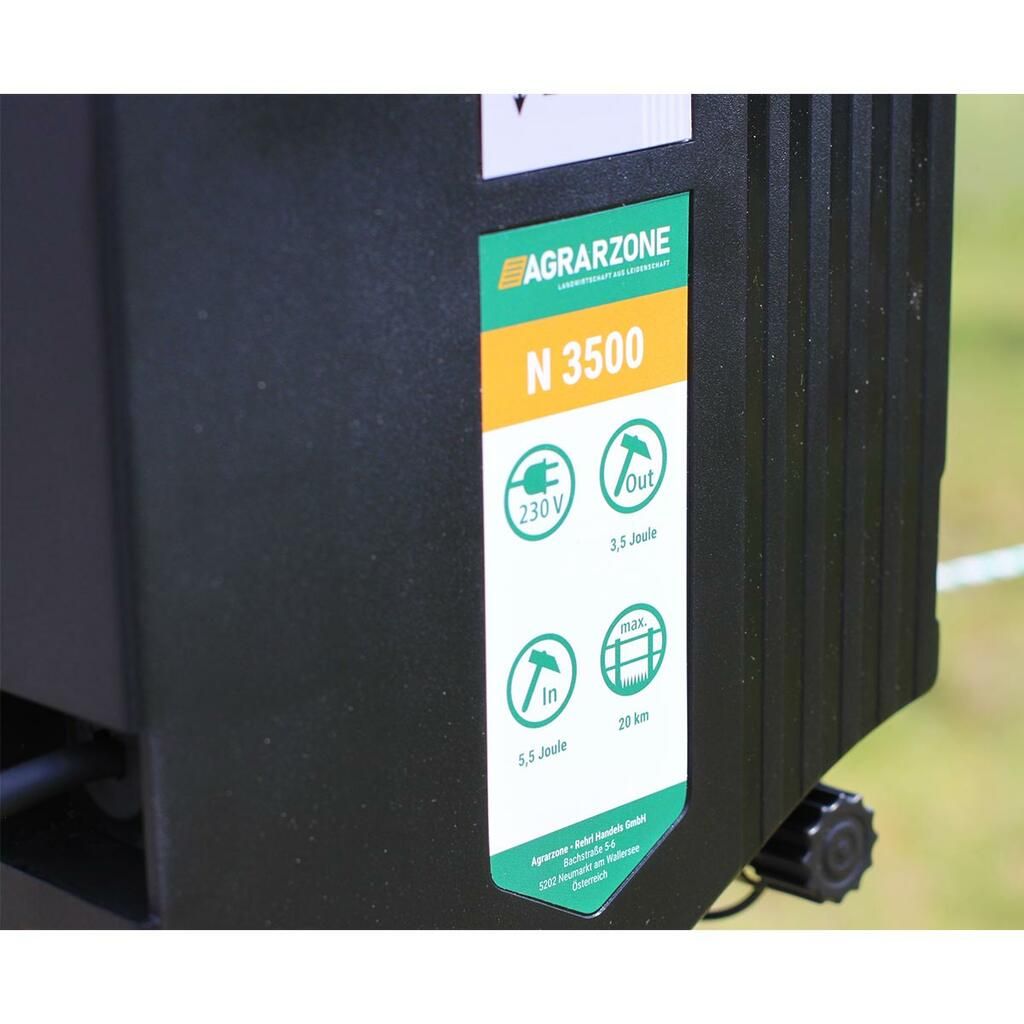 - 1x betesstängelseenhet N 3500 (inkl.: 1x anslutningskabel för stängsel, 1x jordkabel, 1x bruksanvisning)