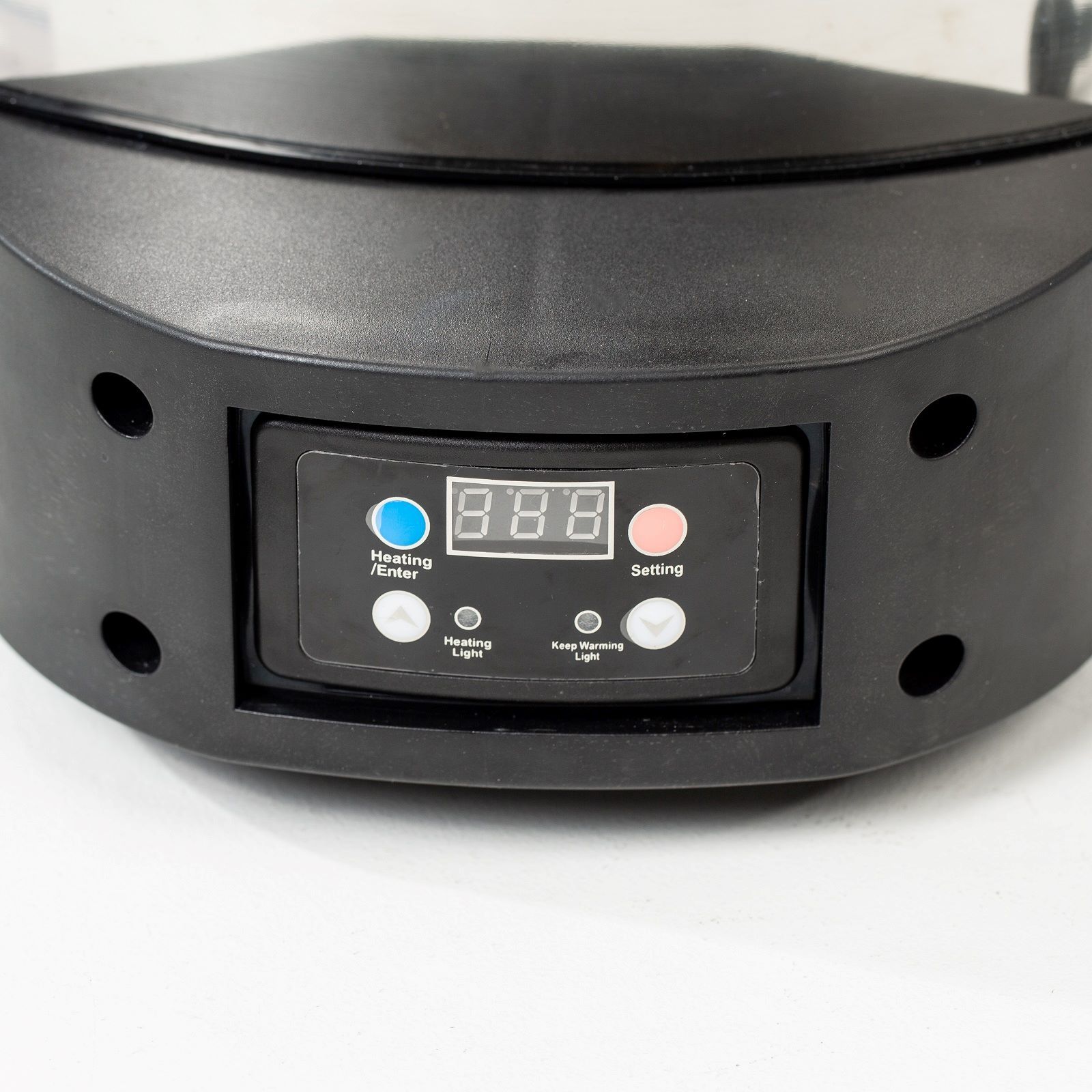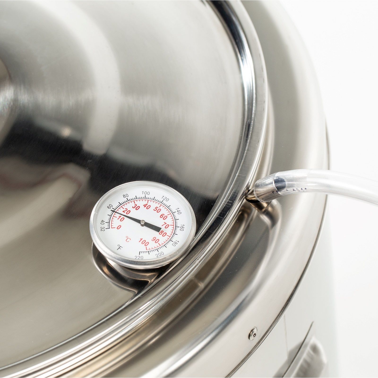 Den praktiska elektroniska styrningen gör det möjligt att ställa in vattentemperaturen (upp till max. 99 °C - beroende på önskad slutprodukt) och den önskade pastöriserings- eller produktionstiden . Värmeelementet på 2,5 kW värmer mjölken till max 90 °C och dödar därmed alla bakterier. Den temperatur som ställs in på elektroniken visar vattentemperaturen, inte medeltemperaturen. Du kontrollerar mediets temperatur med hjälp av en extra termometer .