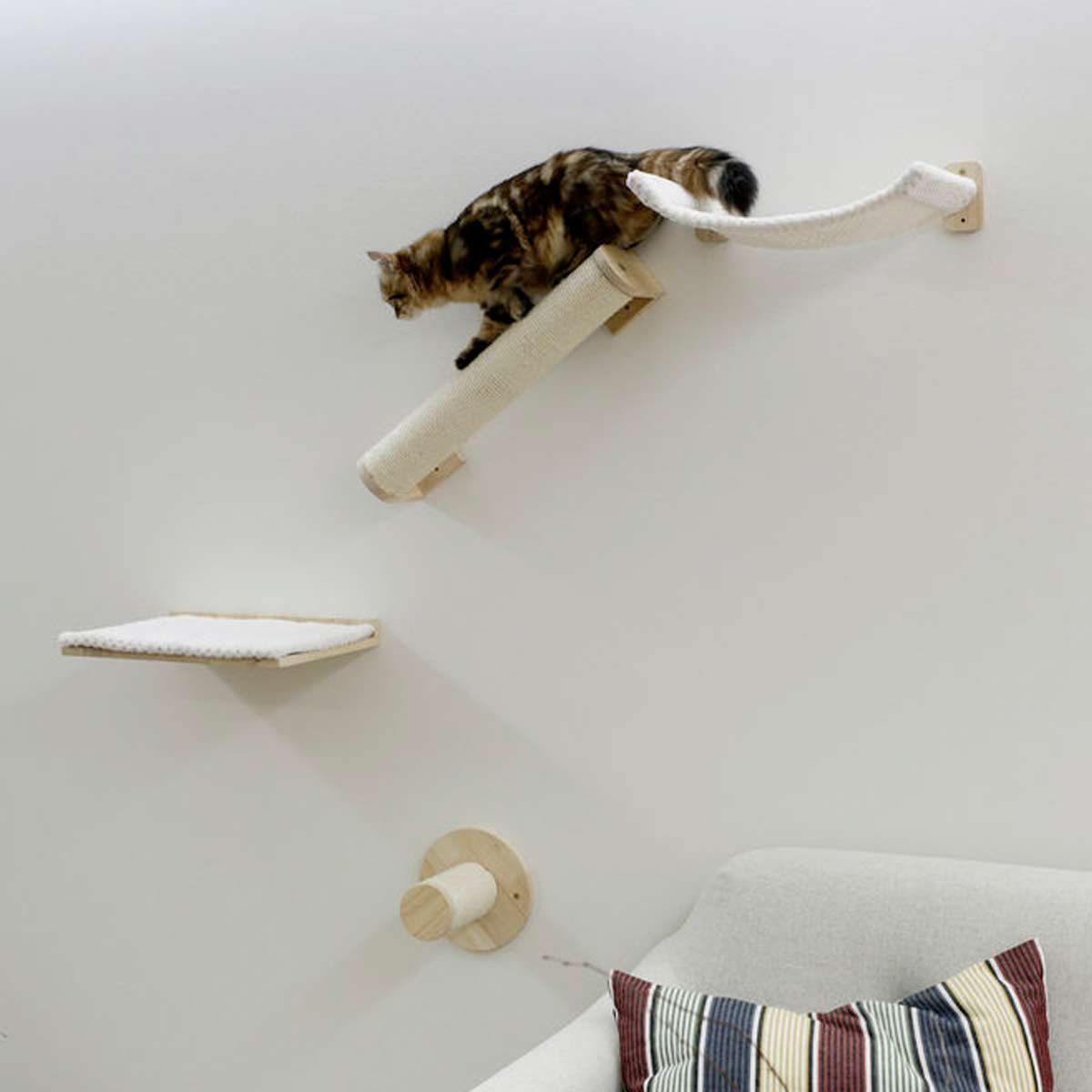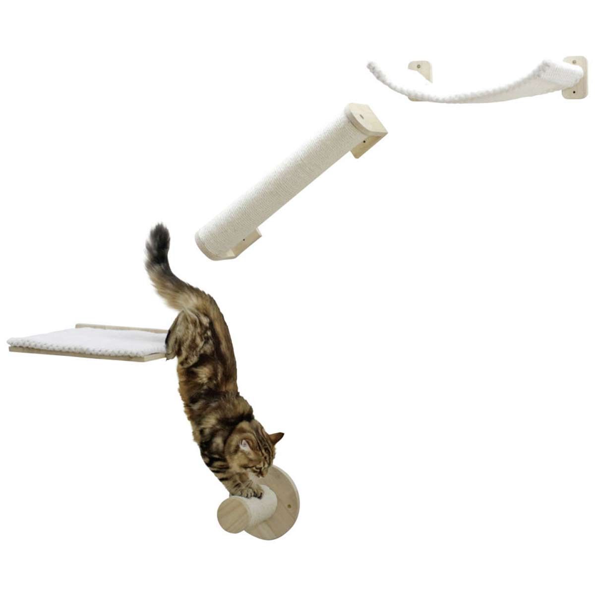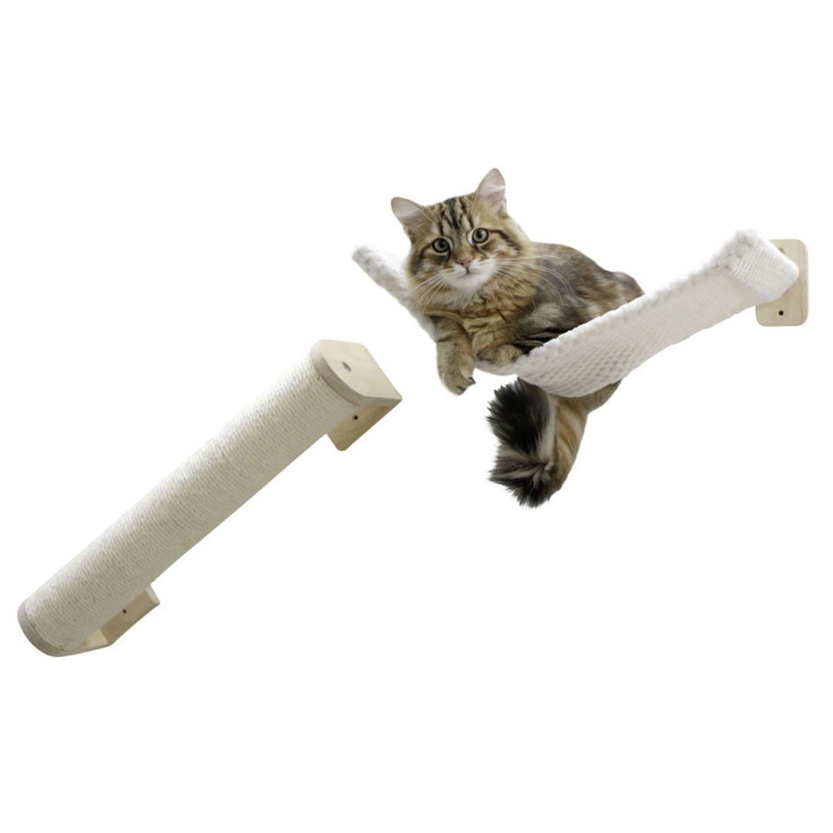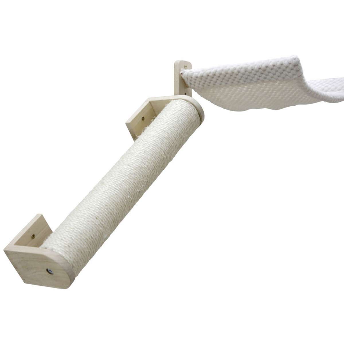 Skapa ett väggklätterparadis för din katt med Kerbls klätterväggsprodukter. I detta set får du en bekväm hängmatta att sova på, en sisalpelare som kan användas för att repa eller som ramp, samt en liggbräda med dynor och ett trappsteg.