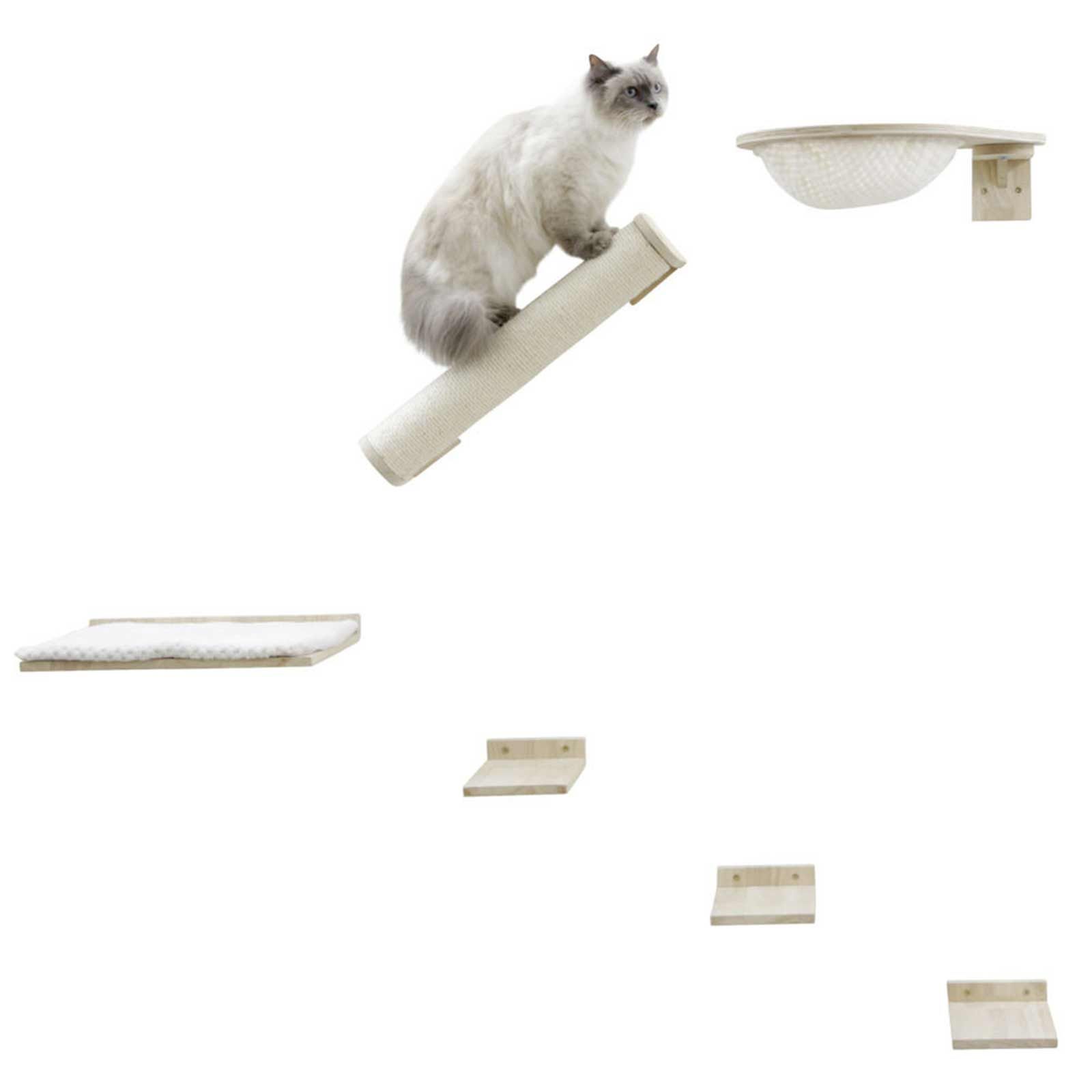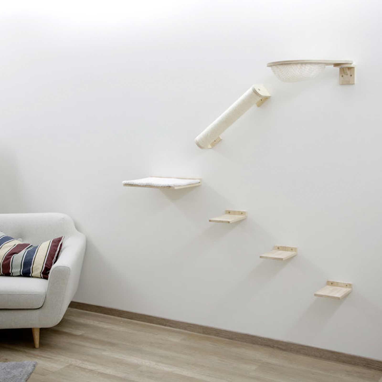 Designa en helt individuell klättervägg för ditt husdjur. Placera helt enkelt de 6 elementen efter din smak och ge din katt gott om möjligheter att klia och leka. I detta set får du en mysig hängmatta för att sova, en sisalpelare som kan användas för att repa eller som ramp, samt en säng med kuddar och ett trappsteg.