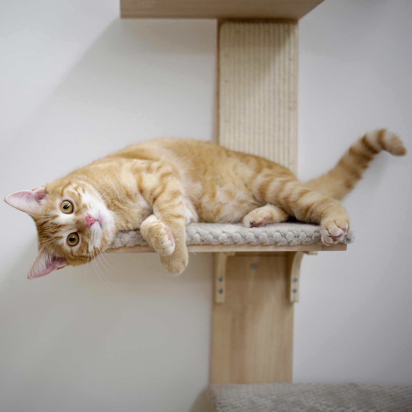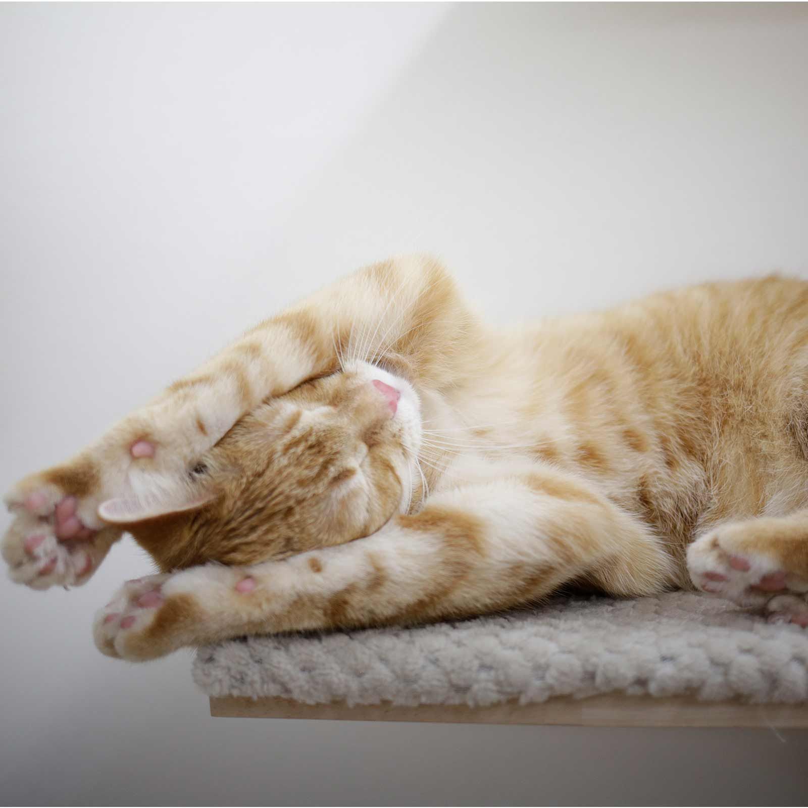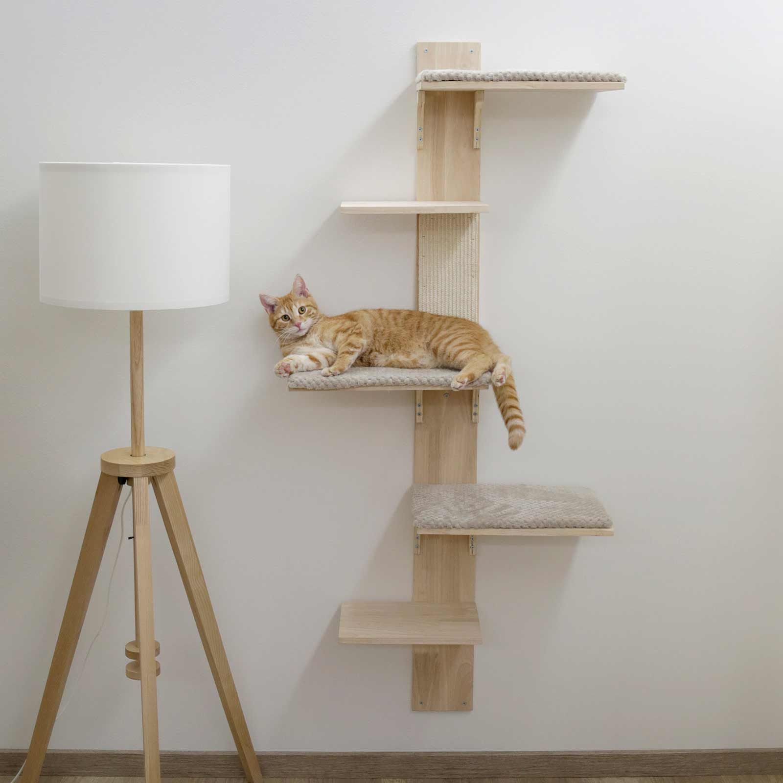 Den utrymmesbesparande och moderna designen av kattskrapstolpen erbjuder din katt många olika alternativ för att klättra, leka och sova. Att placera den på väggen ger mer ledigt utrymme på golvet och sparar samtidigt utrymme. Kuddarna går att ta av och kan tvättas i 30°C.