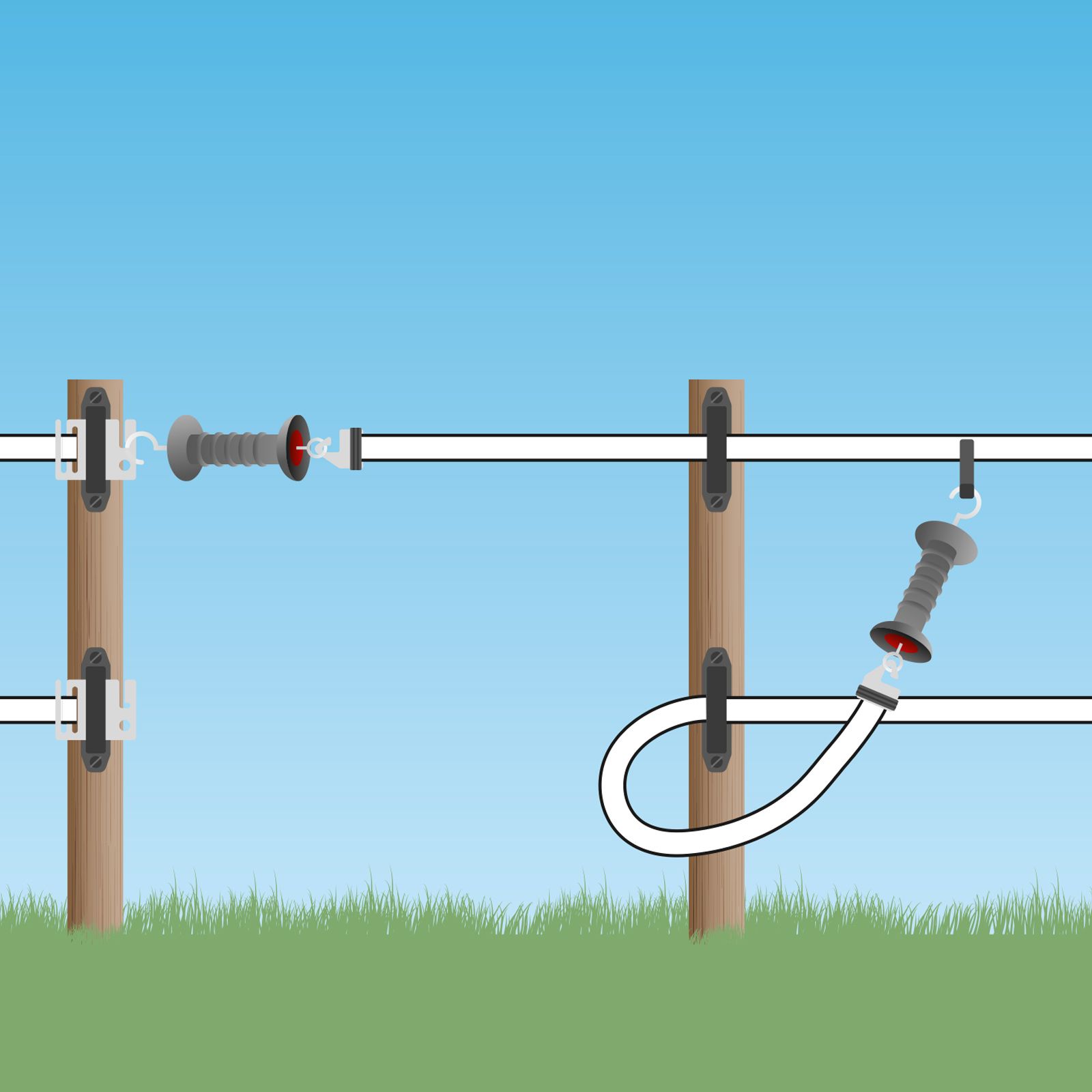 Det stabila grindhandtaget kan monteras på alla träpålar på kort tid. Litzclip-kontakten och den högkvalitativa anslutningsplattan i rostfritt stål garanterar utmärkt korrosionsbeständighet och lång hållbarhet. De professionella tejpisolatorerna med elektriskt ledande gummiblandning fixerar betesstängselbandet och grindhandtaget mycket försiktigt men tillförlitligt.