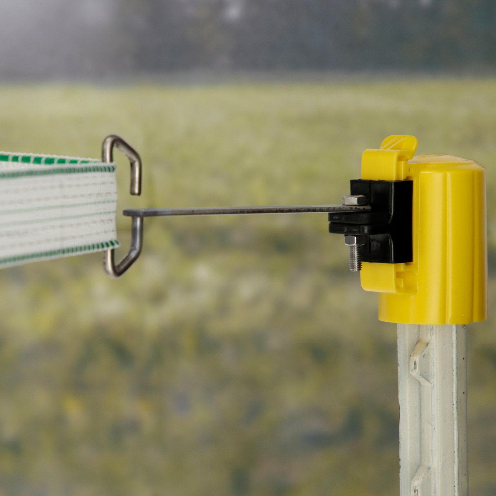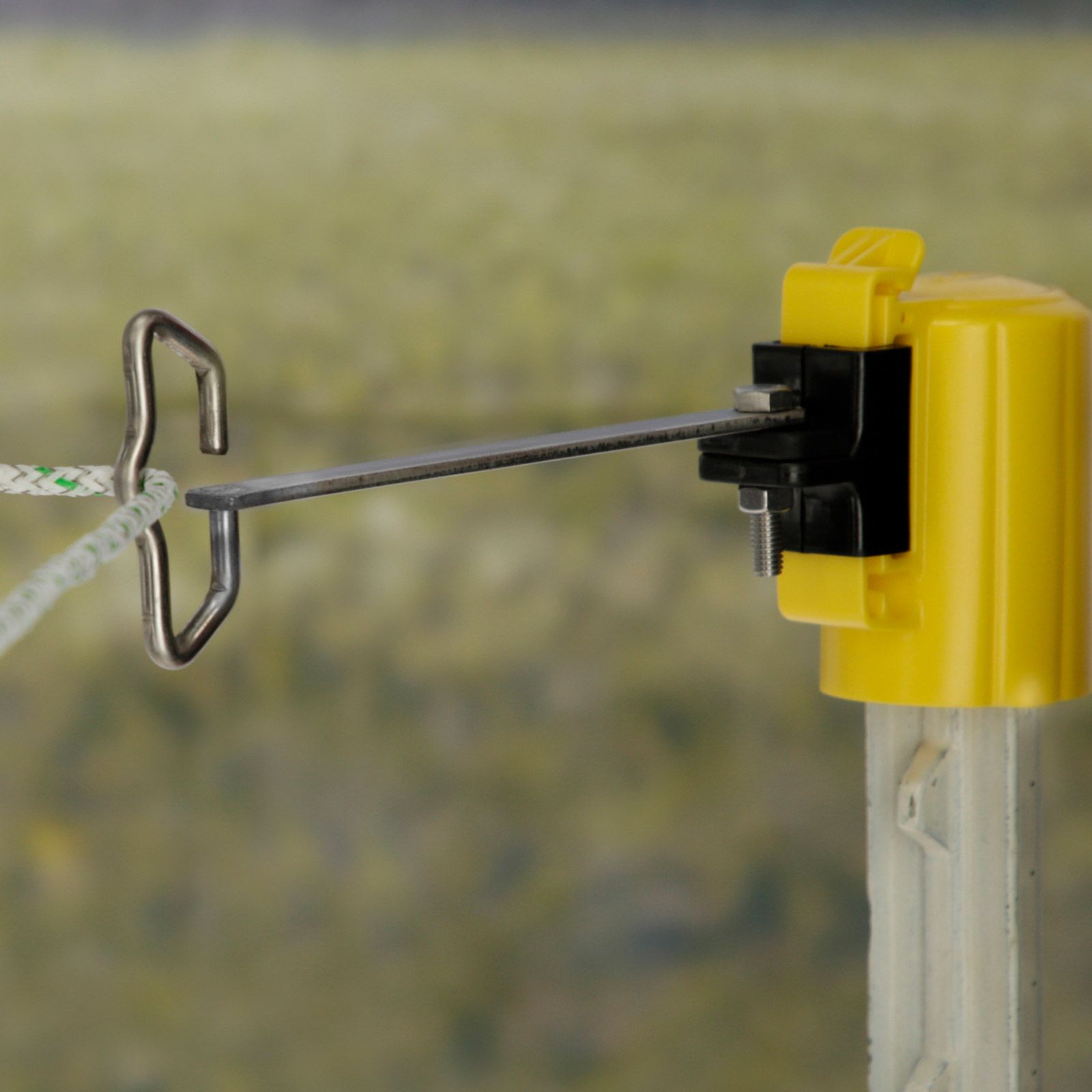 Den nya T-Post-huvudisolatorn för hörn är den idealiska lösningen för att förhindra att ledarmaterialet kommer i kontakt med de diagonala stödstolparna i hörnkonstruktionen. Olika ledarmaterial kan enkelt klämmas fast på isolatorn, t.ex. tråd, rep och stängselband upp till 40 mm bred. Genom att klämma fast ledarmaterialet i den 15 cm långa stödfästet får hörnen på ditt betesstängsel en betydligt högre stabilitet än med konventionella hörnisolatorer. Fästet är tillverkat av mycket högkvalitativt rostfritt stål och har rundade kanter, vilket skyddar stegens material och garanterar en lång livslängd.