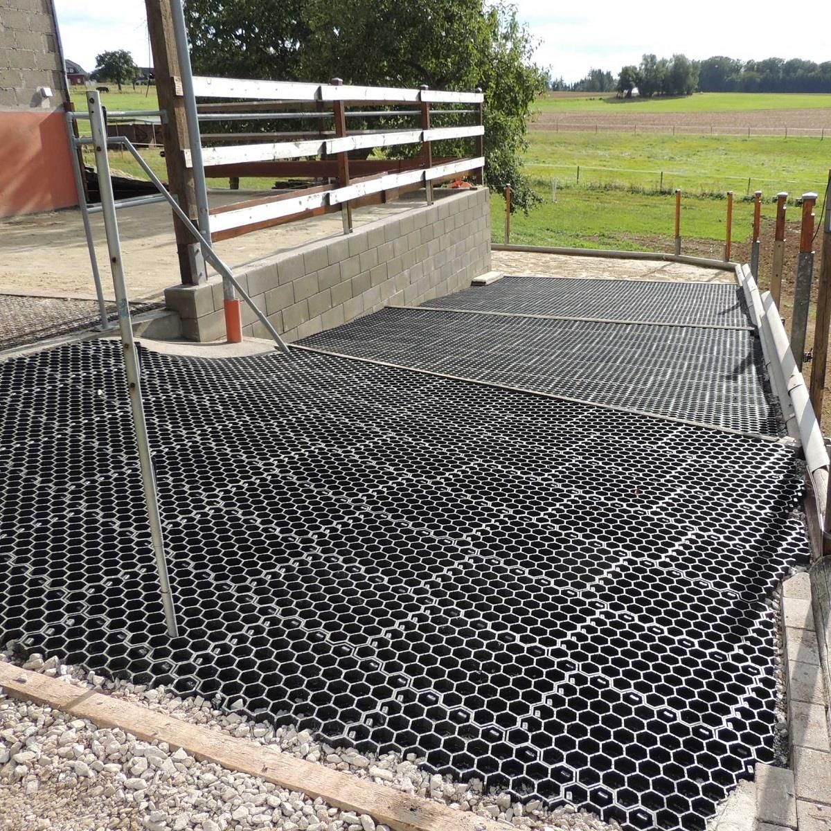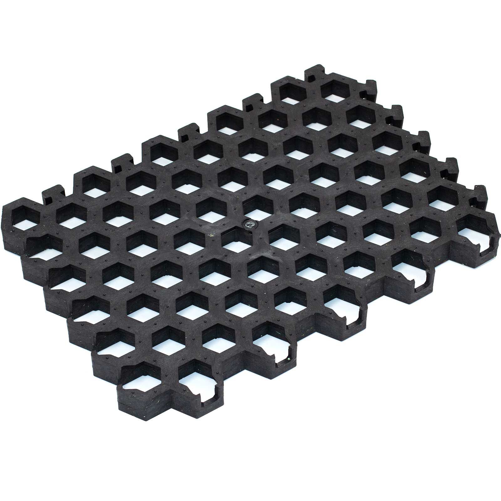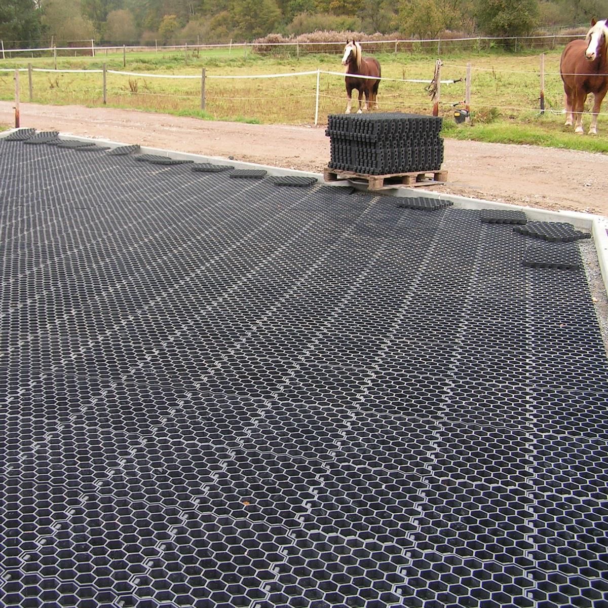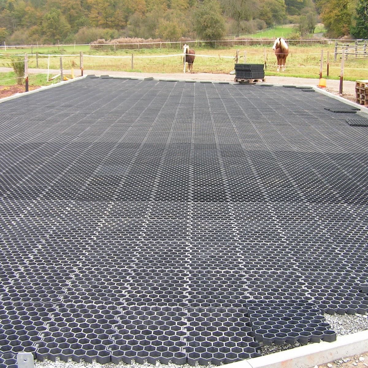 Paddockplattan i 50 x 40 x 4 cm i svart är perfekt för många olika användningsområden när det gäller markförstärkning utan tätning. Tack vare sin höga stabilitet är den perforerade mattan idealisk för ridhus, longeringsringar, löparbanor, paddockar osv. Vatten kan tränga igenom paddockgallren, men det skapas ingen ojämnhet och det är inte möjligt att sänka sig djupt ner i mjuk mark. Det innebär att du kan ge dina hästar och andra djur säker motion i alla väderförhållanden och under alla årstider. De starka ~ 5 mm-stängerna och frost- och UV-beständigheten gör paddockplattan hållbar och mycket robust.