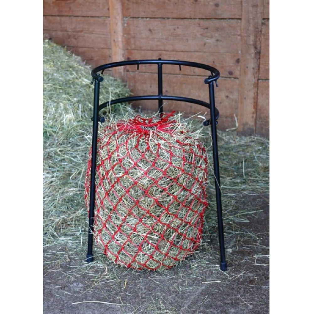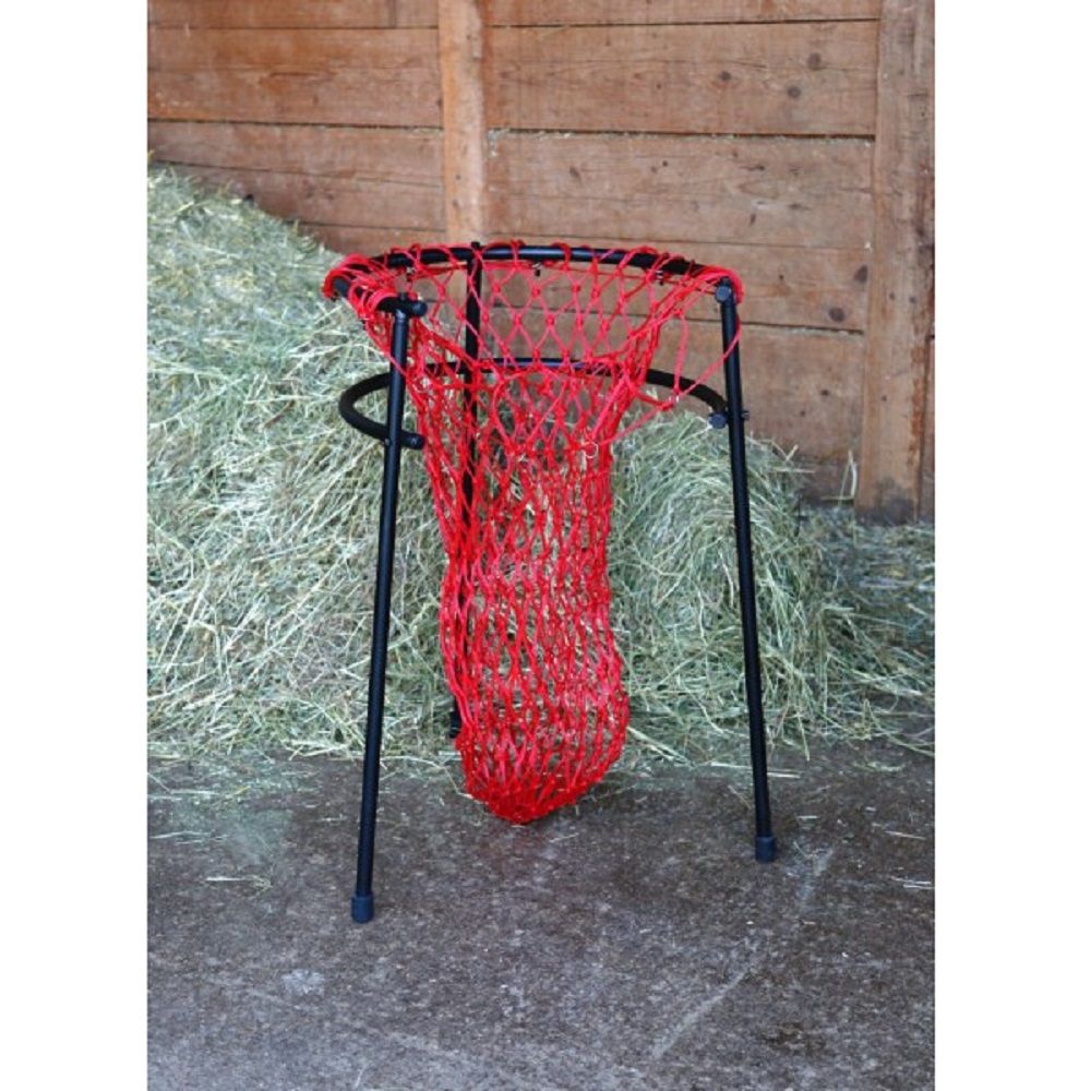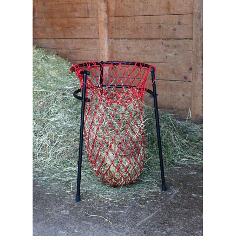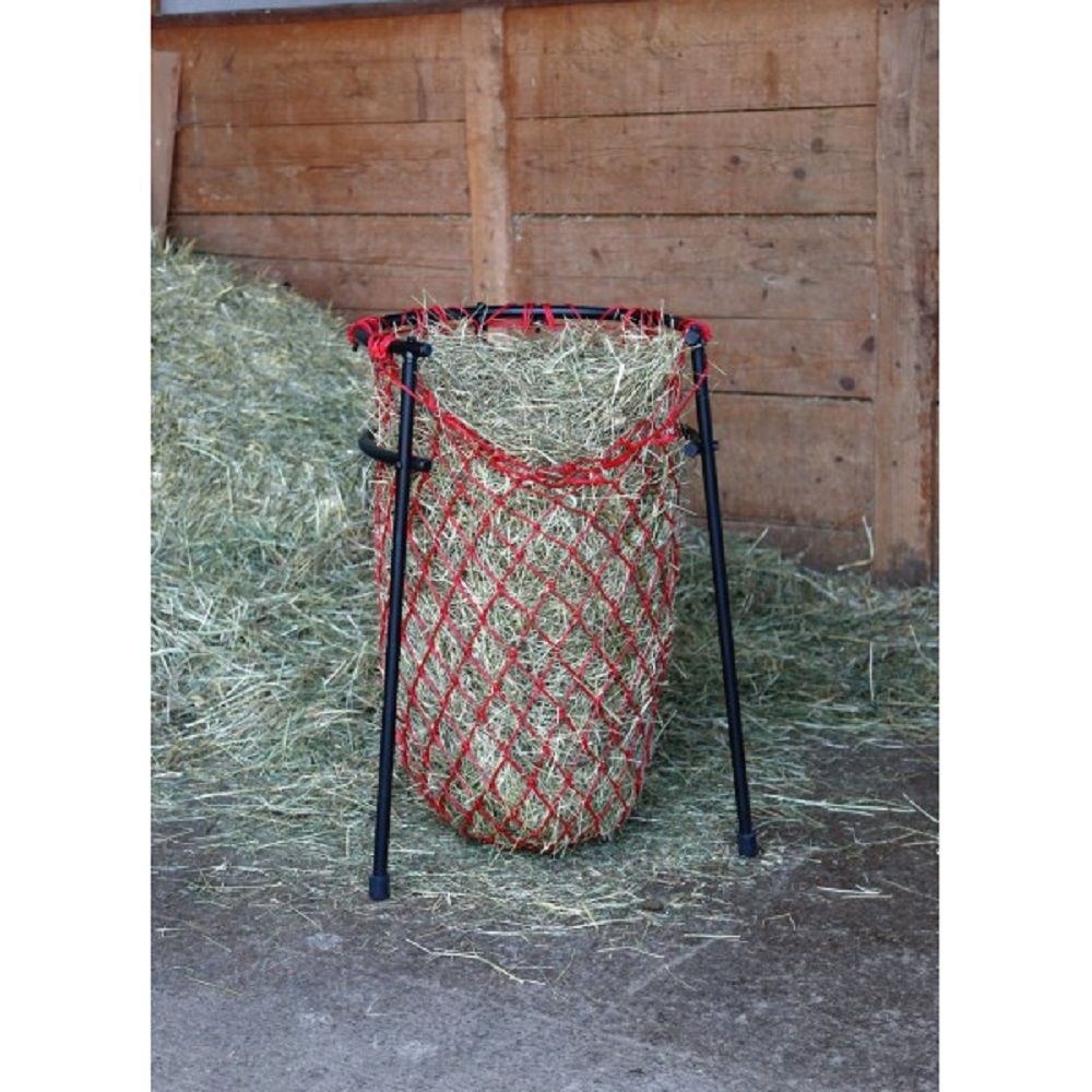 Hjälpmedlet för fyllning av hönät är ett praktiskt hjälpmedel i stallet för fyllning av hönät. Benen garanterar enkel hantering och gör det möjligt att placera fyllningshjälpmedlet på ett flexibelt sätt. Hönätet kan hängas in i stallkonstruktionen, så att båda händerna är fria att fylla hö i hönätet utan problem. Hjälpmedlet för fyllning av hönätet är öppet på sidan så att det fyllda hönätet lätt kan tas bort utan att fastna.