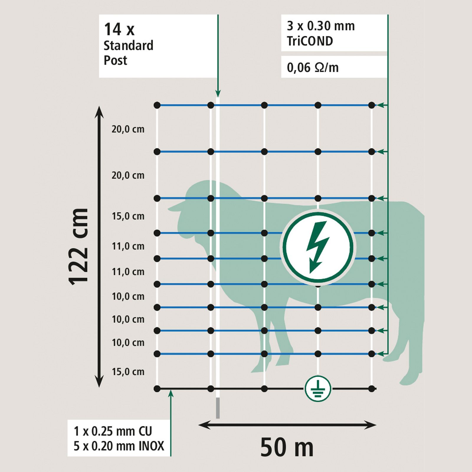 Det helt omarbetade, nya Wolf Net Maxi är den perfekta kompromissen mellan användarvänlighet och effektivt skydd för dina betande djur. Det elektroniska nätet har totalt 9 TriCOND-rader med 0,30 mm vardera. TriCOND-ledare är 5x starkare än konventionella ledningar och ger optimal ledningsförmåga. De integrerade vertikala stöttorna med galvaniserade bottenspetsar, som har testats i flera år, garanterar en utmärkt stabilitet för nätet även i kuperad terräng. Vargnätets knutpunkter är svetsade mycket tätt, vilket förhindrar att nätet hänger ihop och garanterar lång hållbarhet. Tack vare en speciell +/- princip kan WolfNet Maxi anpassas till din individuella praktiska situation. I svåra markförhållanden kan en förstärkt jordsträng eventuellt anslutas för jordning längs hela nätets längd, vilket till exempel är fallet vid mycket sandiga eller jordiga jordar.