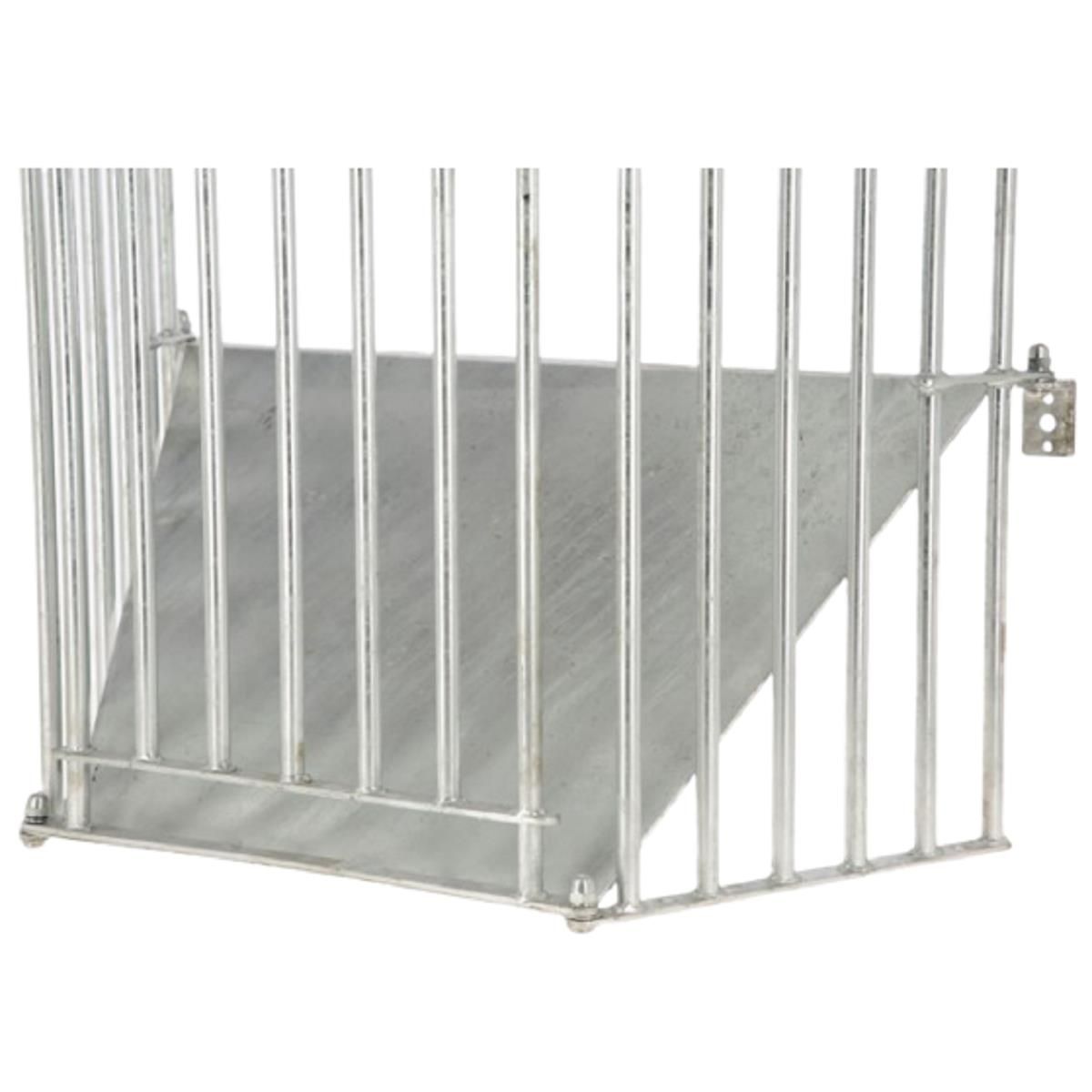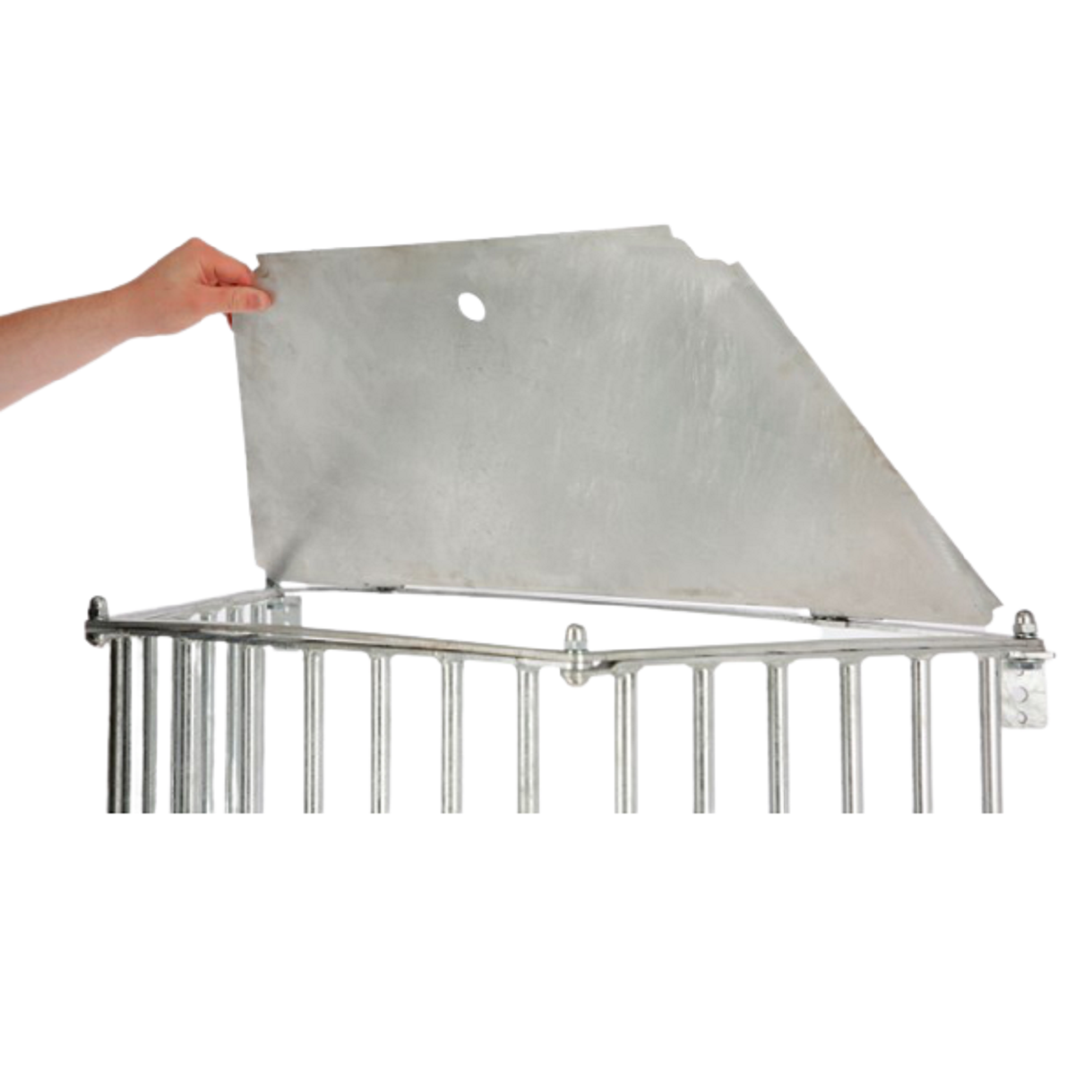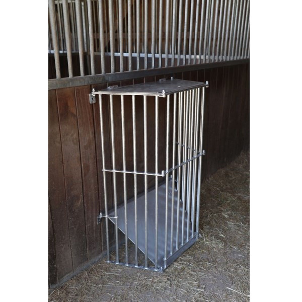 Stallväggens höhylla är idealisk för att främja långsam och artanpassad utfodring! På grund av rutnätets avstånd på 5 cm är hästarnas foderintag långsamt men jämnt och kan därmed bidra till djurens välbefinnande. Det långsamma foderintaget bör förhindra beteende- och matsmältningsproblem. Den lutande bottenplattan ser till att höresterna glider nedåt, så att inget damm samlas i höhyllan och små rester kan lätt tas bort när man muddrar ut. Den horisontella öppningen i botten underlättar också en grundlig rengöring av höhyllan. Det gångjärnsförsedda locket på toppen av höhyllan gör det möjligt att snabbt fylla på och fylla på hö. Hösthållaren lämpar sig för ca 14 kg hö, men detta varierar beroende på konstruktion och pressning.