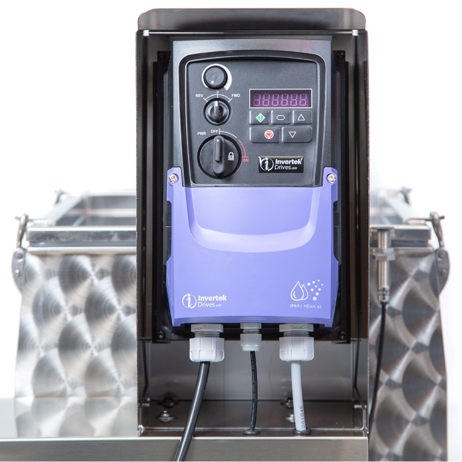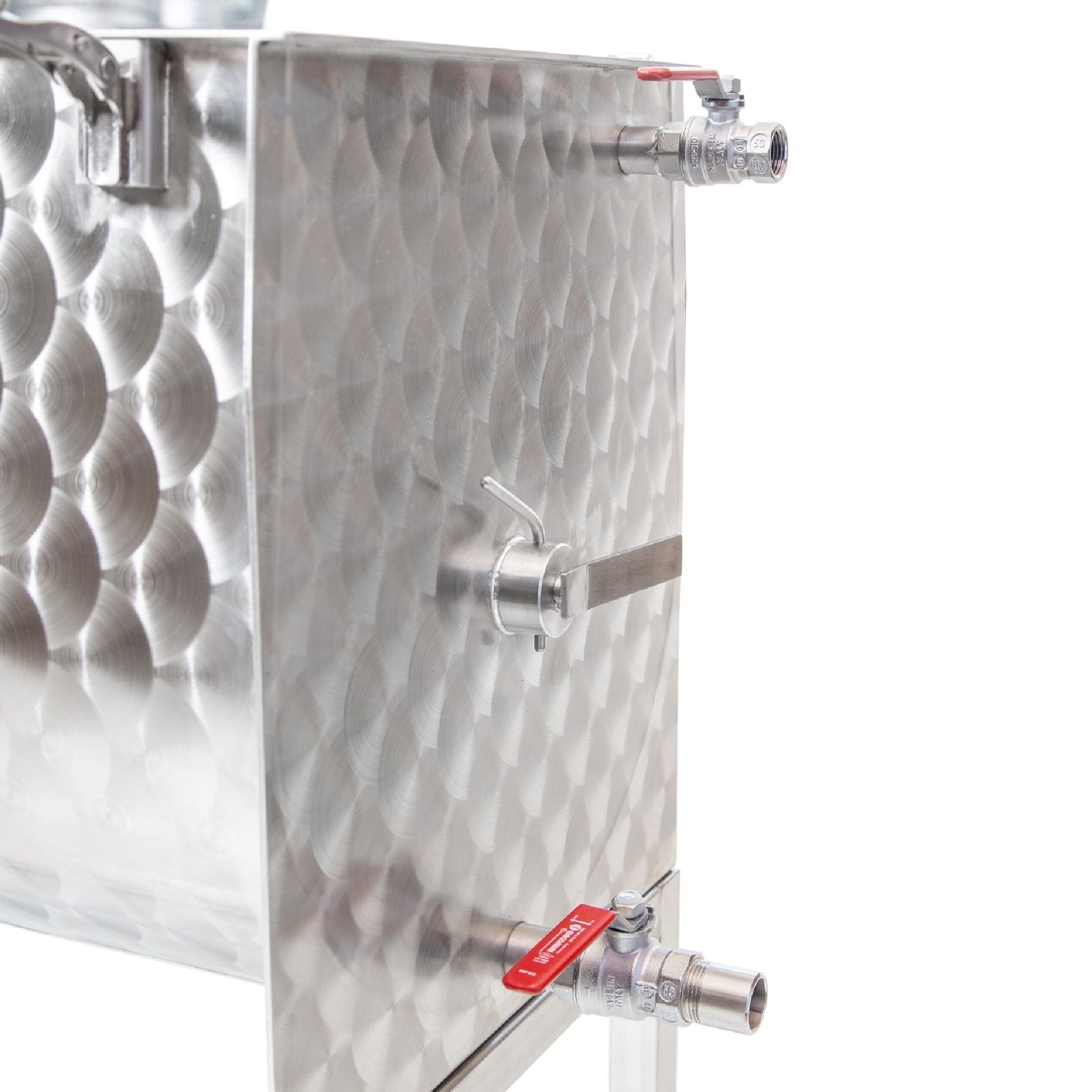 Den här maskinen behöver bara 20-35 minuter för en process, beroende på gräddens temperatur och fetthalt. För att starta omrörningen hälls 10-25 liter grädde i den rostfria gräddbehållaren, max. upp till omrörningsaxeln. Kokningsprocessen kan följas genom det unika, extra stora visningslocket. När locket öppnas under drift förhindrar det automatiska säkerhetsstoppet olyckor. Kortare eller längre karvtider är möjliga tack vare den flerstegade 750 W, 230V-motorn. Den kärnmjölk som bildas under karvningen tappas helt enkelt bort med den separata avloppskranen, därefter tvättas smöret och den högkvalitativa produkten är klar.
