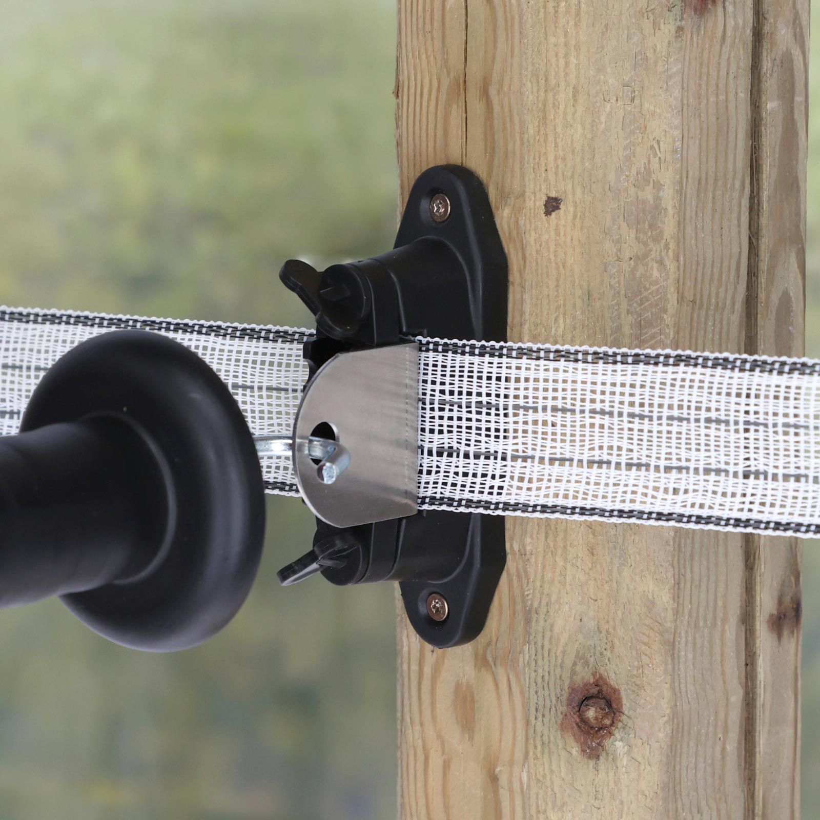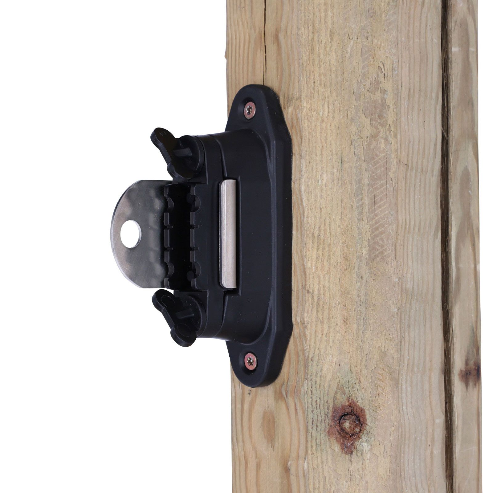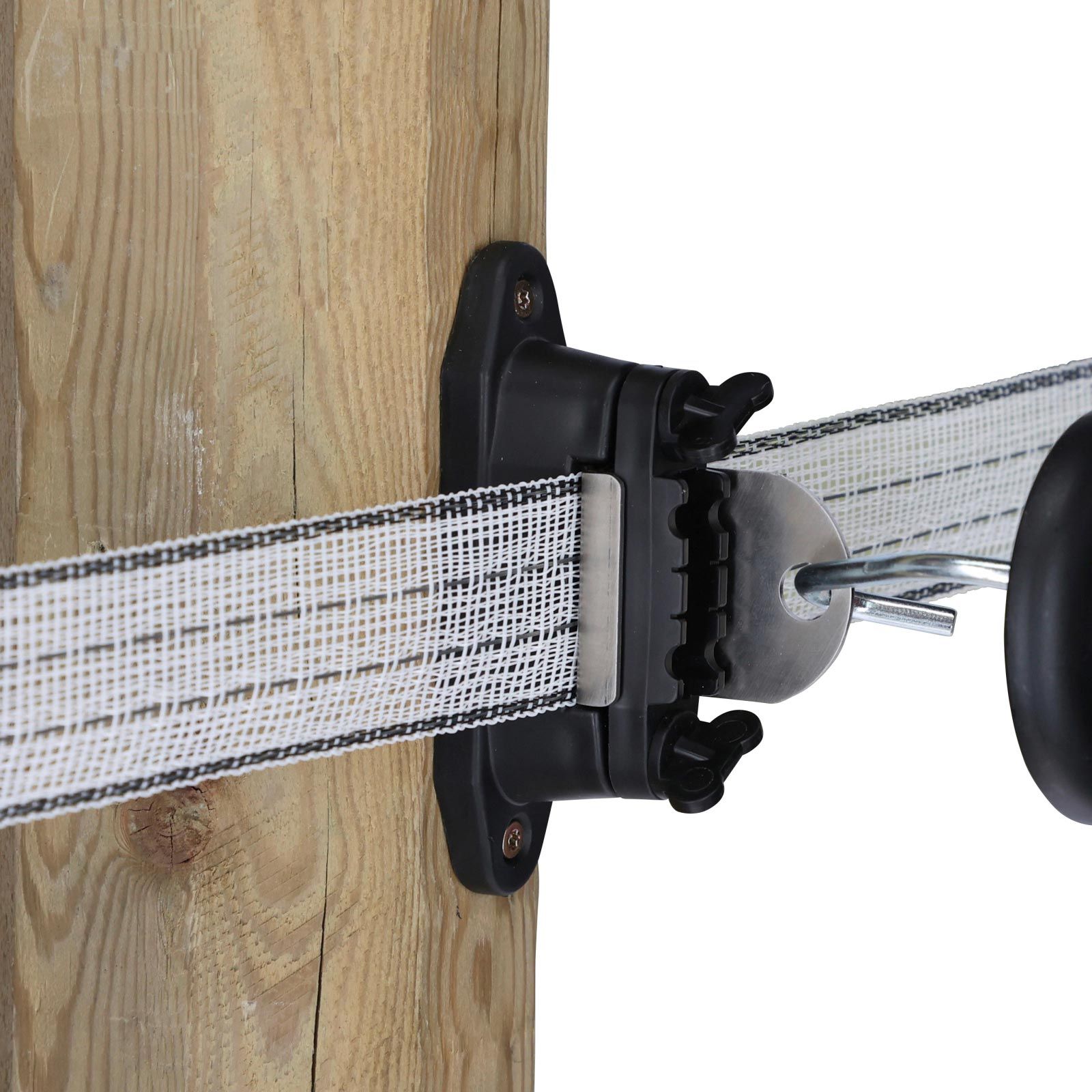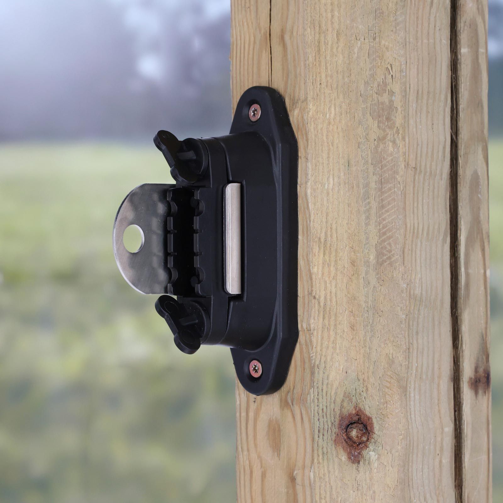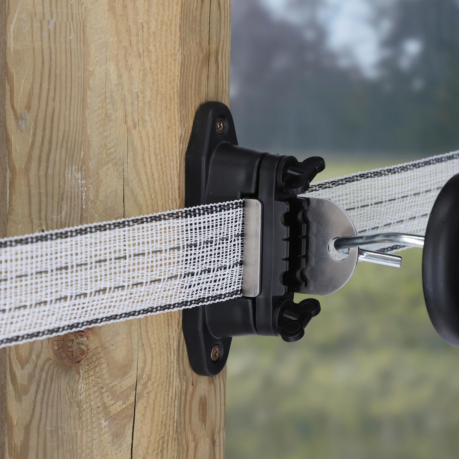Ako Kombi Isolator Profi gör det enkelt att genomföra T-separationer vid insatsen. Isolatorn är också idealisk som hörnisolator med en efterföljande grind. Den robusta anslutningsplattan i rostfritt stål används för att hänga upp grindhandtag. Ledarmaterialet kan fortsätta att löpa bakom den rostfria stålplattan och behöver inte avbrytas. Samtidigt kan band, rep och strängar spännas upp mycket enkelt och säkert. Utmärkt elektrisk kontakt garanterar maximal ledningsförmåga mellan stegens material och målhandtagen. Monteringen på trästolpen går snabbt och enkelt genom att skruva eller spika.