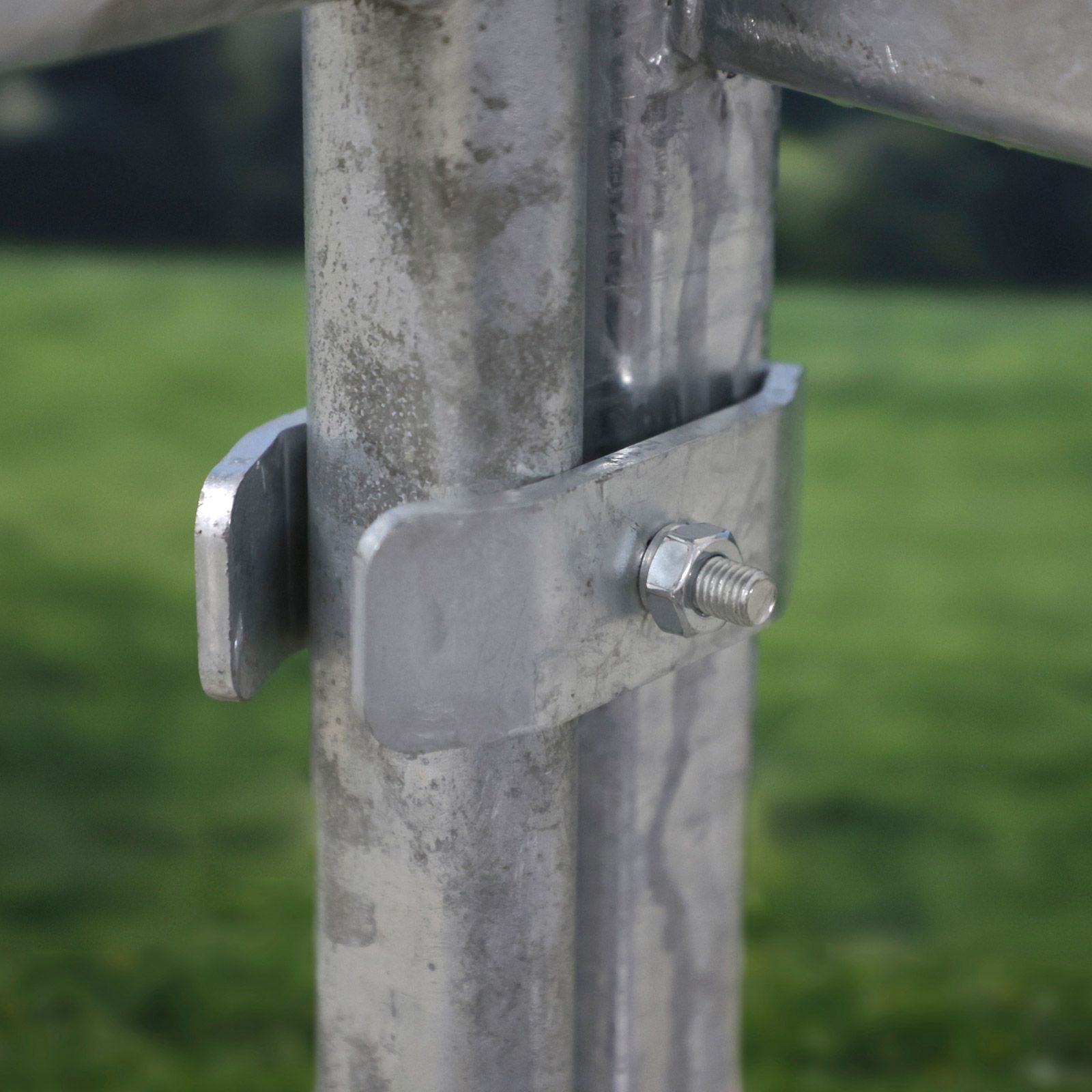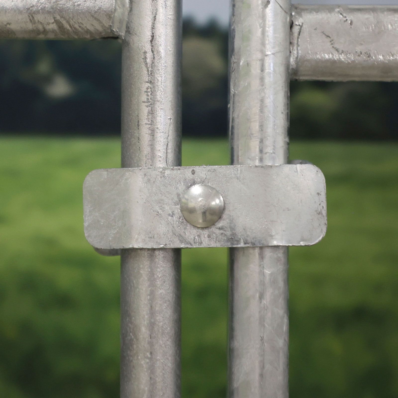 Den här kontakten används för att sammanfoga två betespaneler (platta ovala rör). Anslutningen passar för alla betespaneler med eller utan grind och gör det också möjligt att ansluta betespaneler över hörn. Kopplingen är tillverkad av hållbar, varmförzinkad metall. Den kan enkelt monteras på panelerna utan verktyg. För en optimal anslutning av två paneler är det bäst att använda två kontakter.