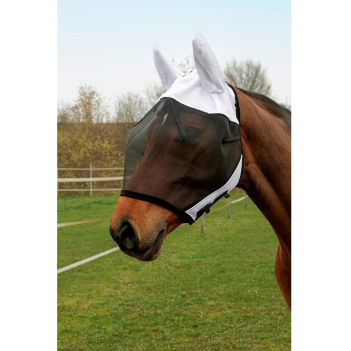 Flugmasken är tillverkad av ett rivbeständigt och tättmaskigt polyesternät. Ett elastiskt kantband säkerställer en perfekt passform för huvudet. Kardborreknäppen gör det enkelt att fästa flugmasken på hästens huvud.