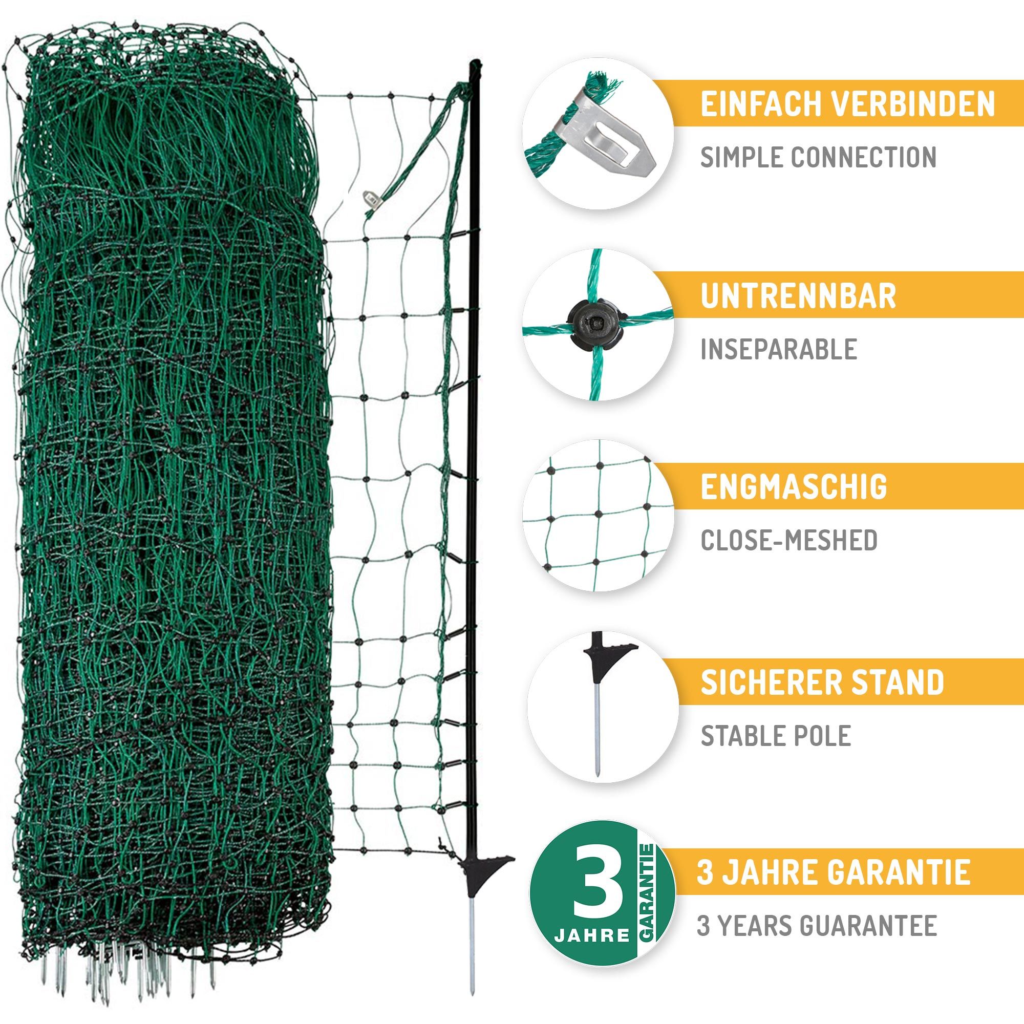 Med Agrarzone Poultry Net Premium Fiber kan du förvänta dig ett robust och lätt betesnät för fjäderfähållning. Hönsnätet övertygar med sina robusta glasfiberstolpar, som har en betydligt högre stabilitet jämfört med plaststolpar och dessutom är lättare och mer hållbara. Det stabila hönsnätet är lätt att sätta upp, utvidga och demontera. Hönshägn utan el kan enkelt utökas med andra nät eller en grind för beteshägn. Betesnätet kan sättas upp och tas ner på några sekunder, vilket gör det perfekt för korta betesperioder. Den kan enkelt rullas ihop och förvaras för att spara utrymme.