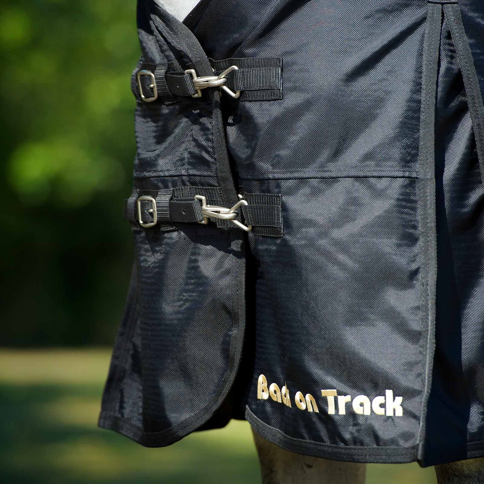 Back on Track-regnetäcket 1680D är perfekt för användning i dåligt väder tack vare det vattentäta tyget, den dubbla justerbara frontstängningen, kramarna, tvärbanden och svansluckan. Regntäckans insida är utrustad med det välkända Welltex-tyget. Små smälta keramiska partiklar stimulerar blodcirkulationen. Utsidan är tillverkad av extra slitstark 1680 denier ballistisk nylon. Regntäcket finns i storlekarna 125 - 165 cm.