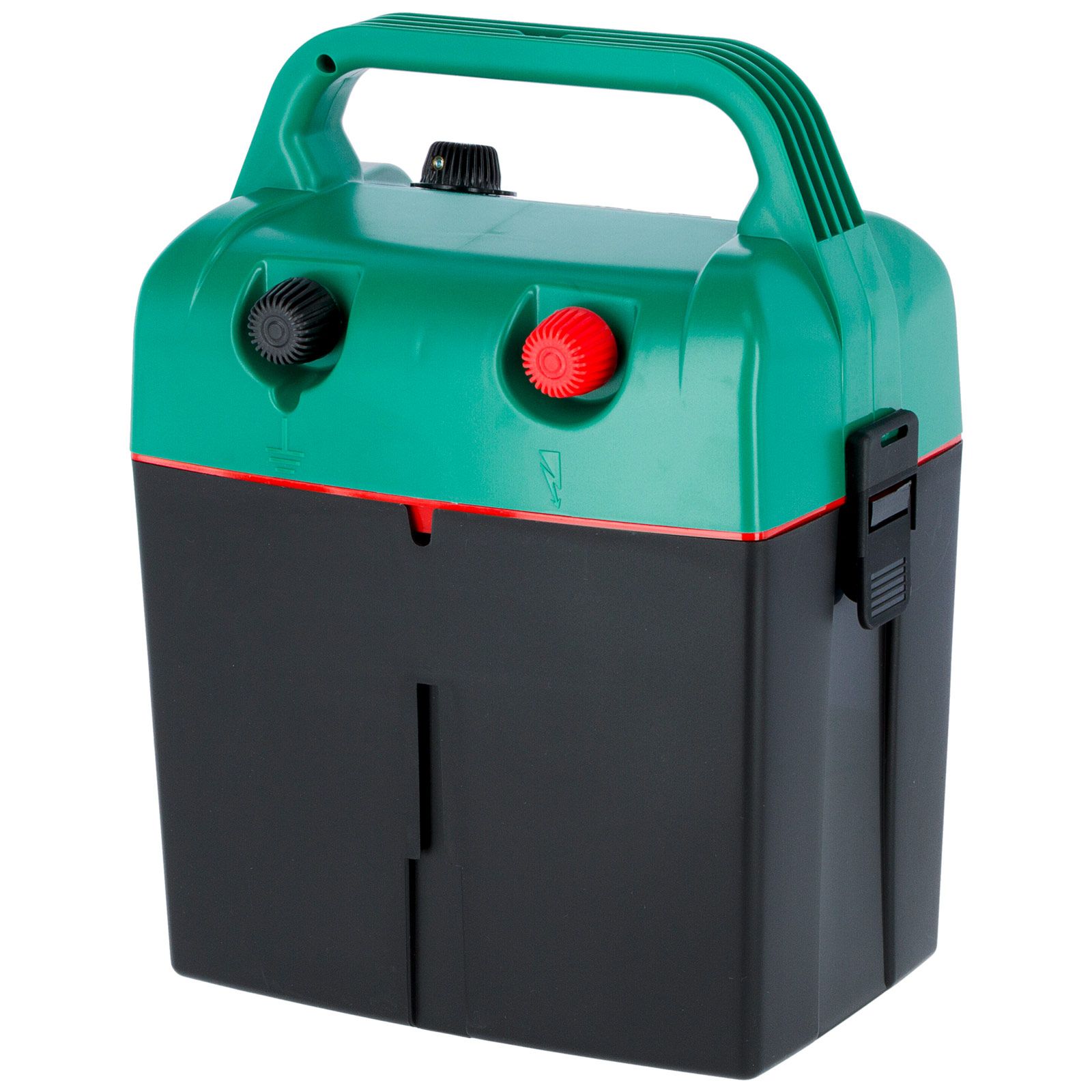 Den batteridrivna universalenheten är lätt att använda tack vare den optimala inriktningen av vridknappen och displayerna. Med den manuella vridknappen kan slagstyrkan justeras i 5 steg. Detta innebär att strömförbrukningen kan regleras effektivt och anpassas till respektive stängselförhållanden. En färgad LED-lampa med flera nivåer (grön, gul, röd) gör det möjligt att visuellt kontrollera stängselströmmen. Batterispänningen visas på en separat display (lysdioden blinkar rött när 9-voltsbatteriet eller det uppladdningsbara 12-voltsbatteriet är tomt). Det robusta höljet har utvecklats speciellt för användning i fält, är extremt tåligt mot brott och har en hög motståndskraft mot väder och vind. Det ergonomiska bärhandtaget gör den mobila 9-volts batterienheten lätt att transportera.