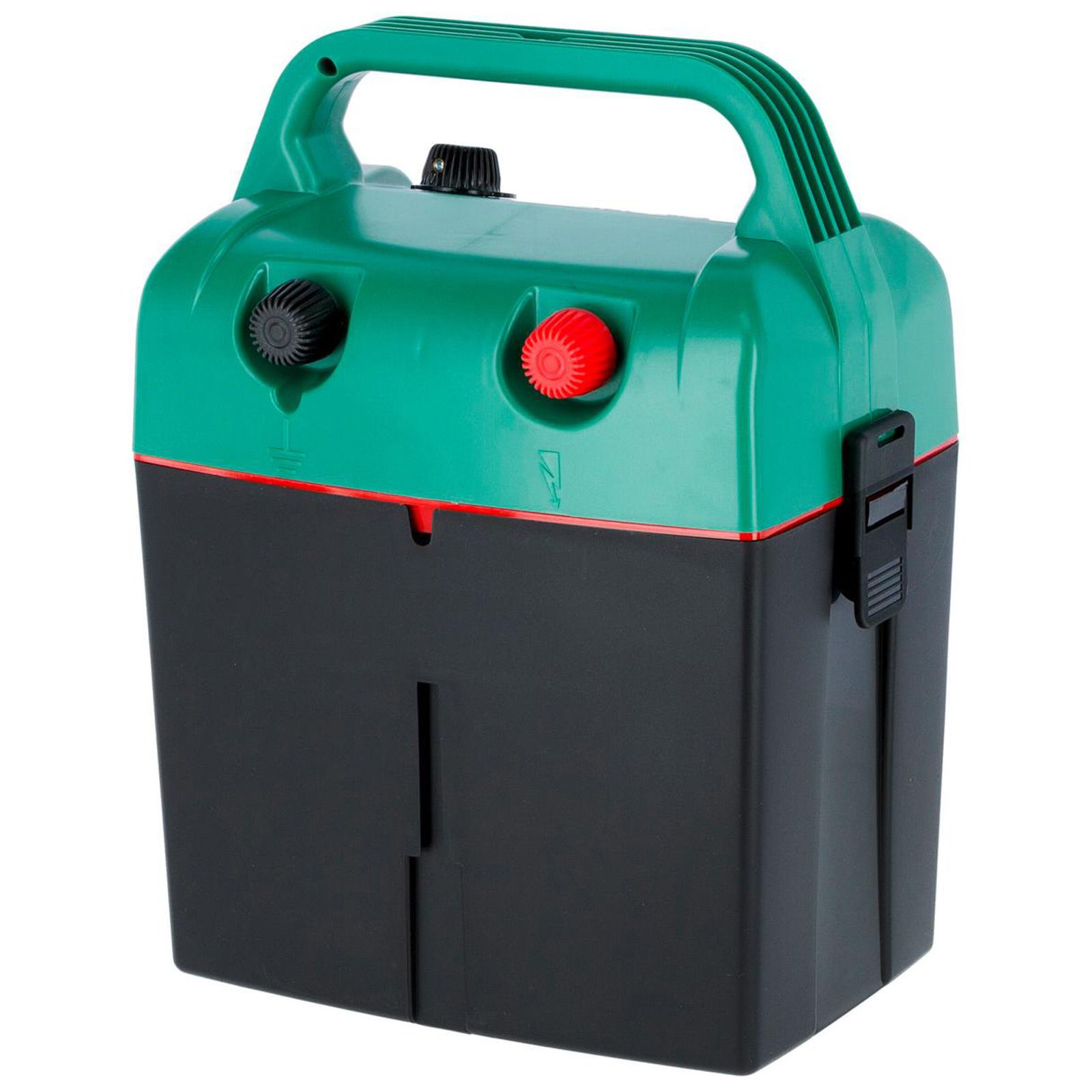 Den batteridrivna universalenheten är lätt att använda tack vare den optimala inriktningen av vridomkopplaren och displayerna. Med den manuella vridknappen kan slagstyrkan justeras i 5 steg. Detta innebär att strömförbrukningen kan regleras effektivt och anpassas till respektive stängselförhållanden. En färgad LED-lampa med flera nivåer (grön, gul, röd) gör det möjligt att visuellt kontrollera stängselströmmen. Batterispänningen visas på en separat display (lysdioden blinkar rött när 9-voltsbatteriet eller det uppladdningsbara 12-voltsbatteriet är tomt). Det robusta höljet har utvecklats speciellt för användning i fält, är extremt tåligt mot brott och har en hög motståndskraft mot väder och vind. Det ergonomiska bärhandtaget gör den mobila 9-volts batterienheten lätt att transportera.