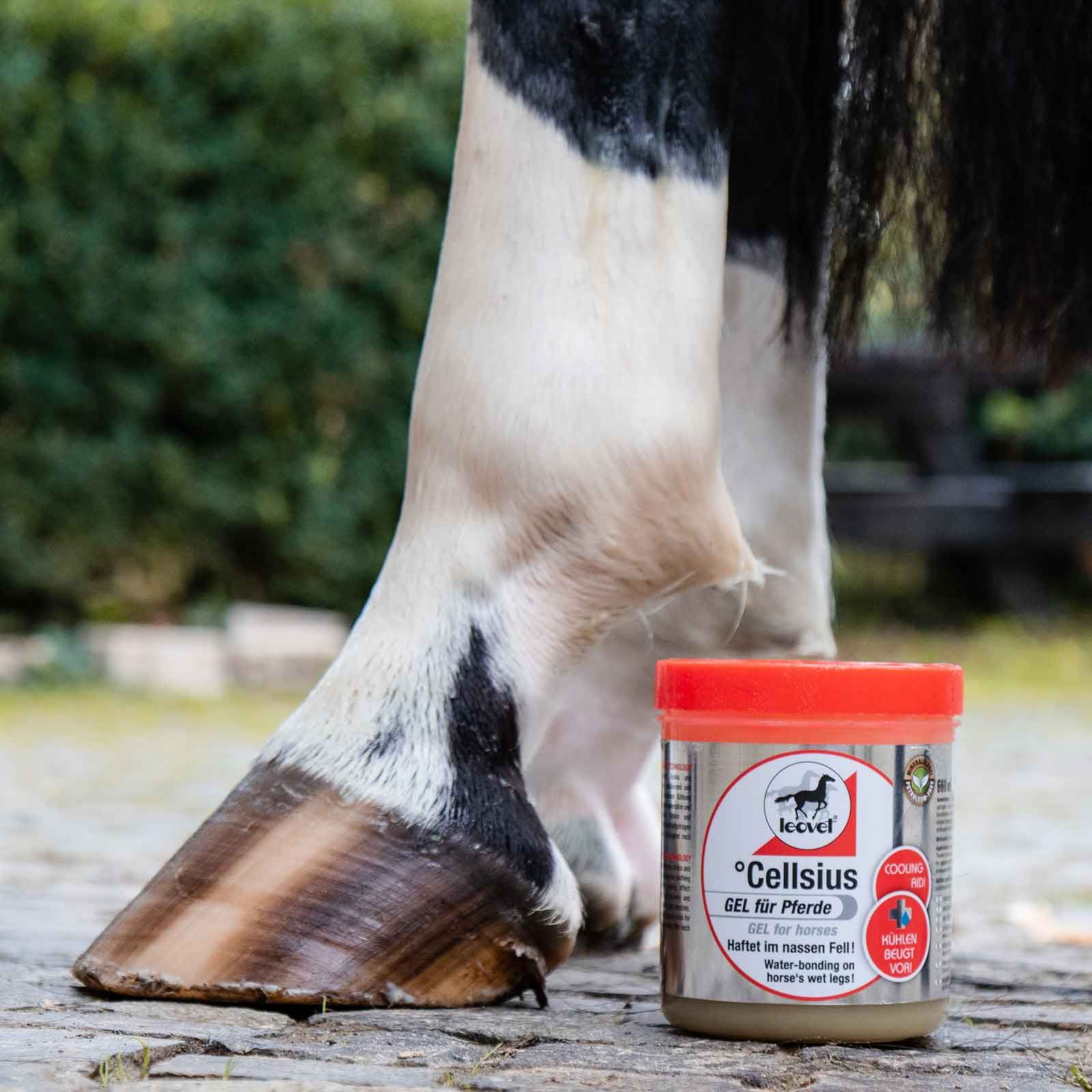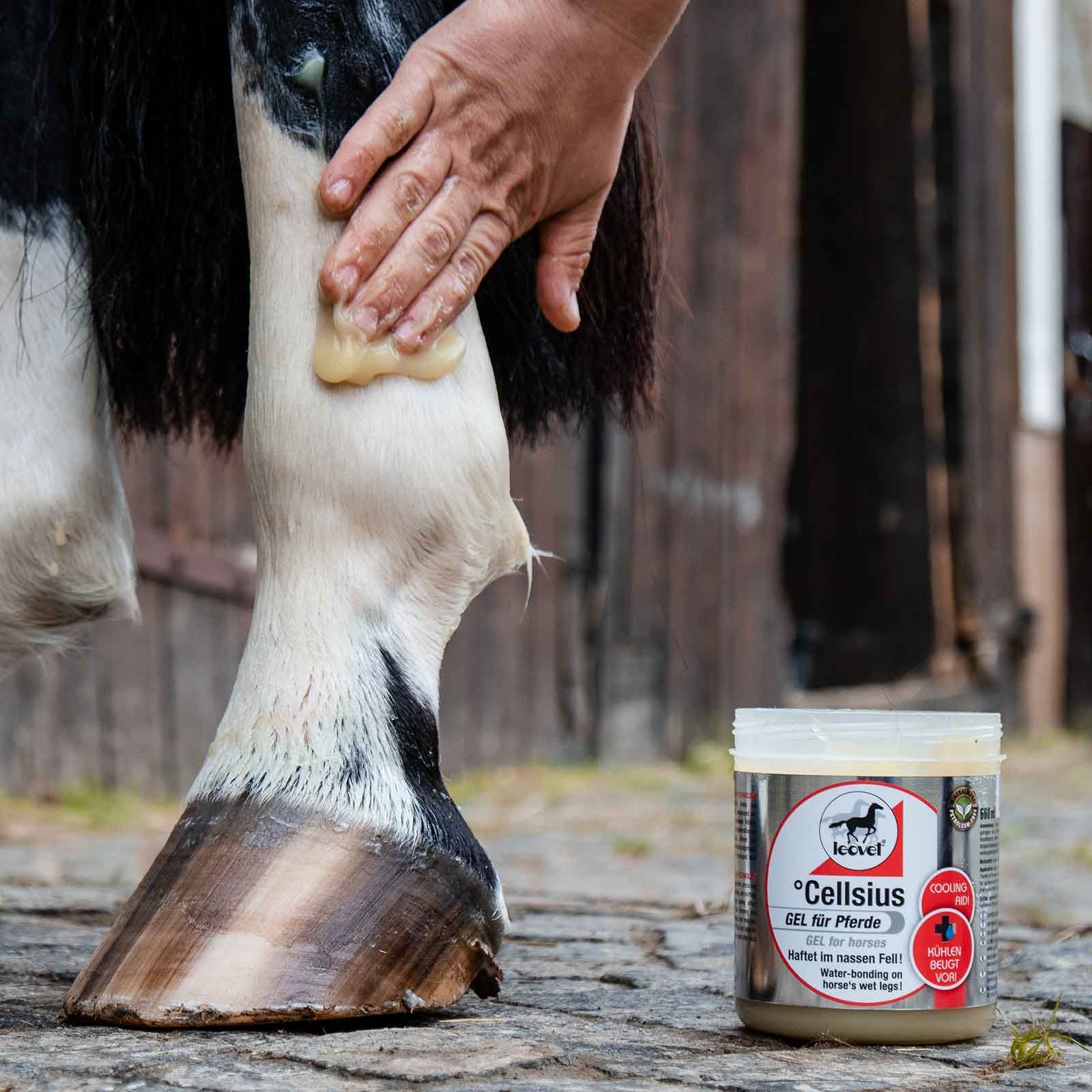 Leovet Cellsius Gel lagrar den kylning som uppnås genom att hästens ben kortvarigt spolas ner med vatten. Hästkylningsgelen kan appliceras på det våta hästbenet direkt efter spolningen och fäster på samma sätt som en kylande hylsa. Den starka långvariga kylningen främjar aktivt en snabb regenerering och vitaliserar stressade ligament, senor och muskler. De naturliga ingredienserna trollhassel, rökelsextrakt, arnica och rosmarin har en sammandragande, vitaliserande och lugnande effekt.