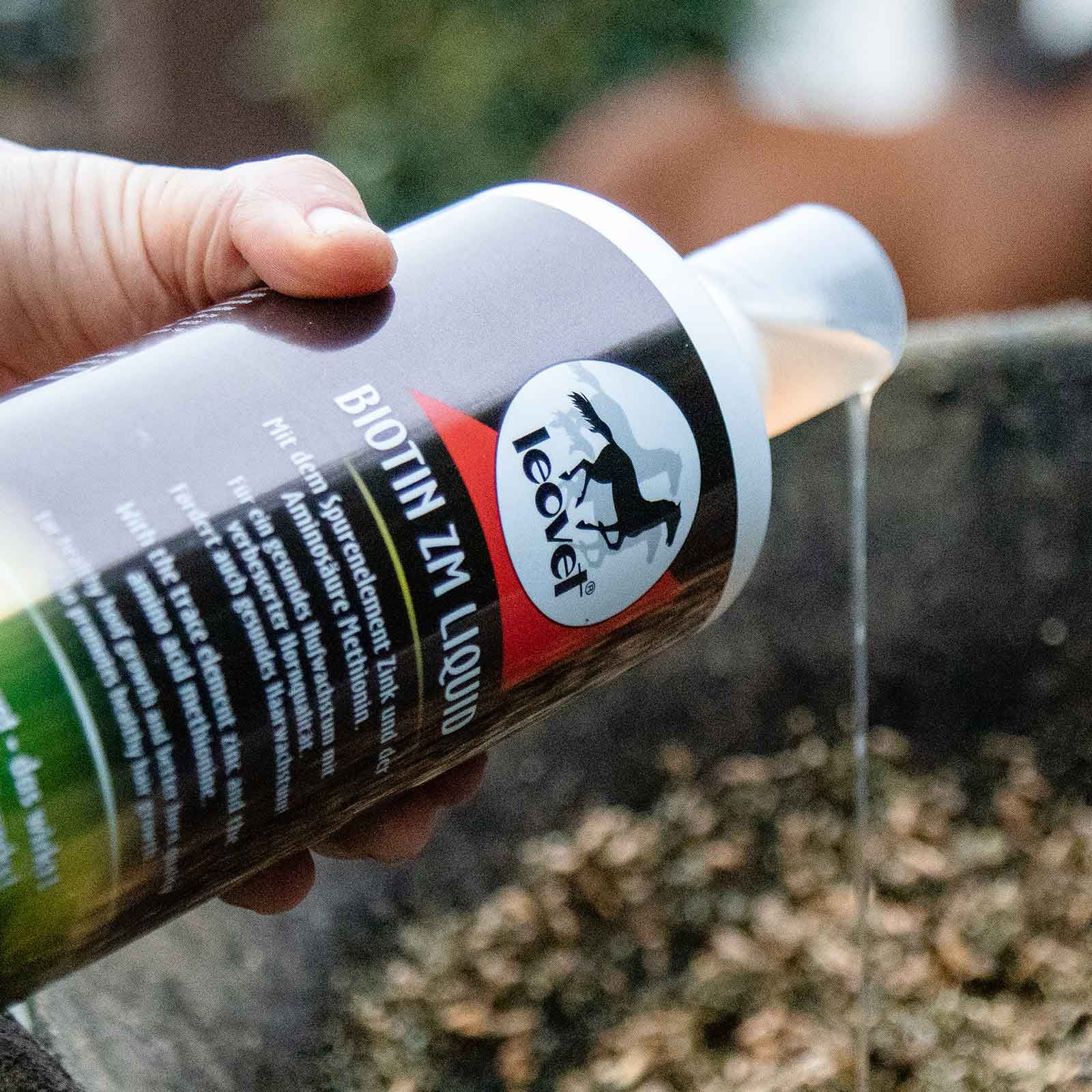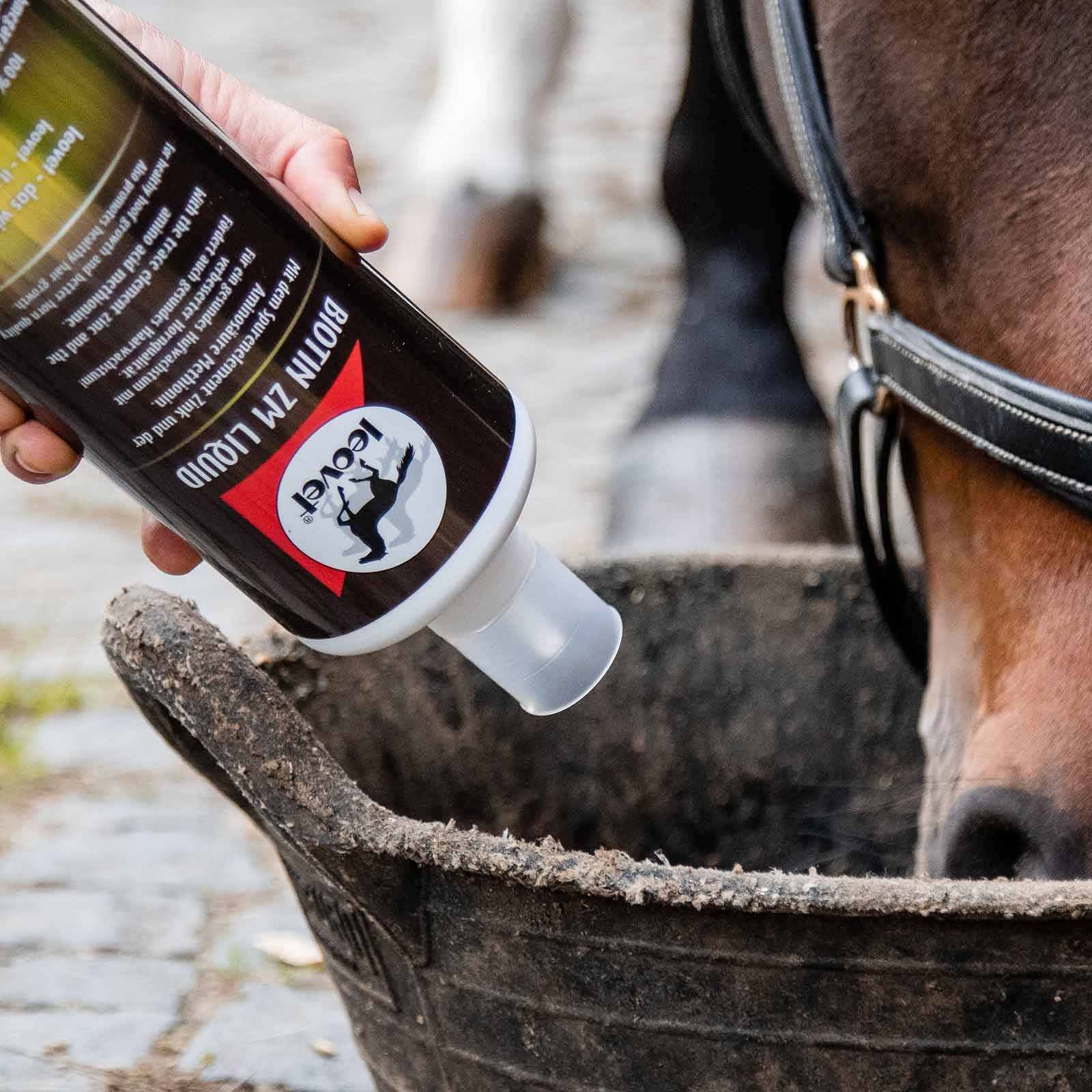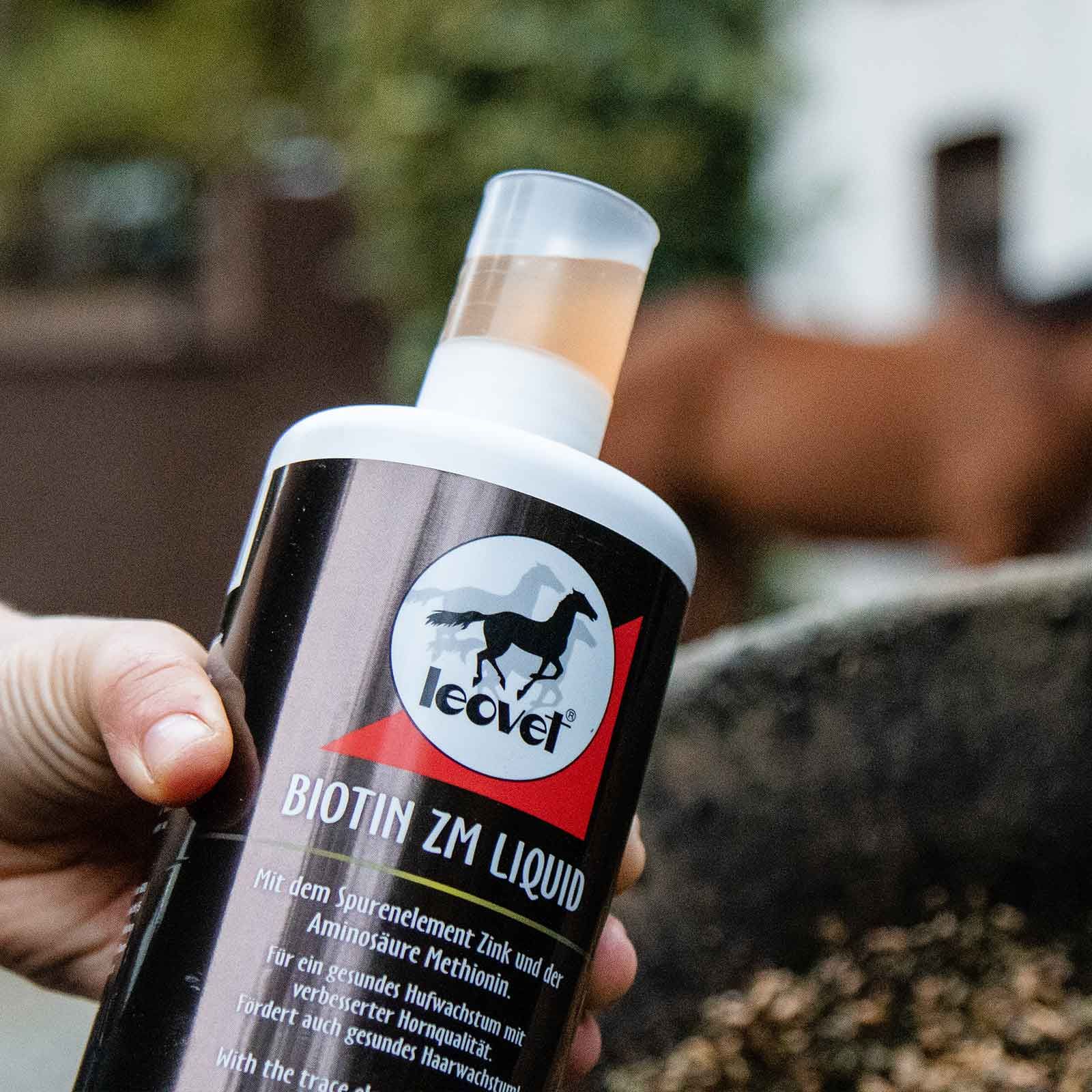 Biotin anses vara hovvitaminet för hästar och innehåller värdefulla näringsämnen för hästens hud, päls och hovar. Leovet Biotin ZM flytande för hästar fungerar genom sina ingredienser metionin och zink. Den kan användas för sköra, spruckna, utbrutna och dåligt växande hovar. De aktiva ingredienserna aktiverar keratinbildningen i hoven och gör att starkt och friskt horn växer tillbaka snabbare. Hornets kvalitet förbättras därför avsevärt. Den ingående zinken är också bra för immunförsvaret & celltillväxten. Pälsförändringen stöds av biotinet och hudens motståndskraft stärks.