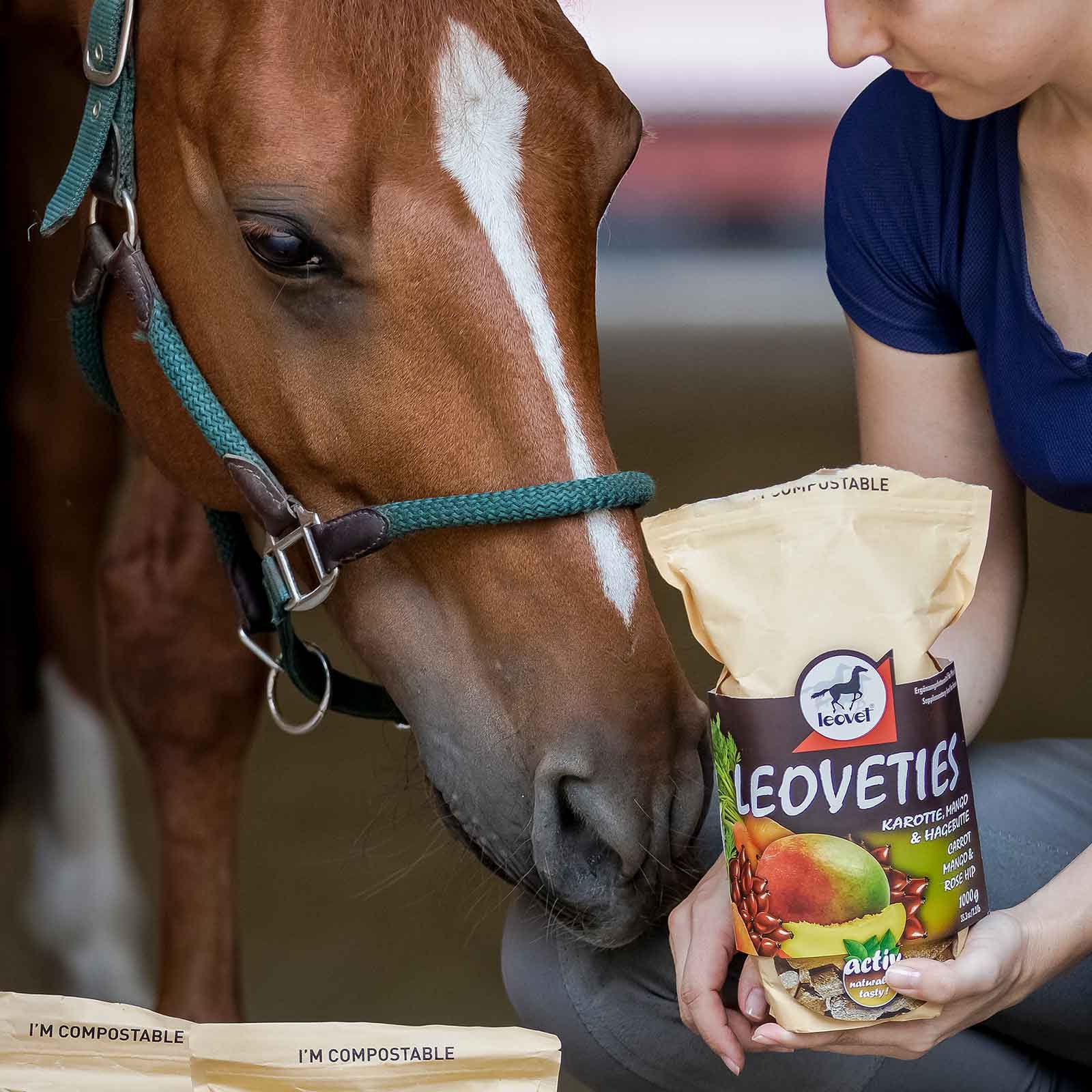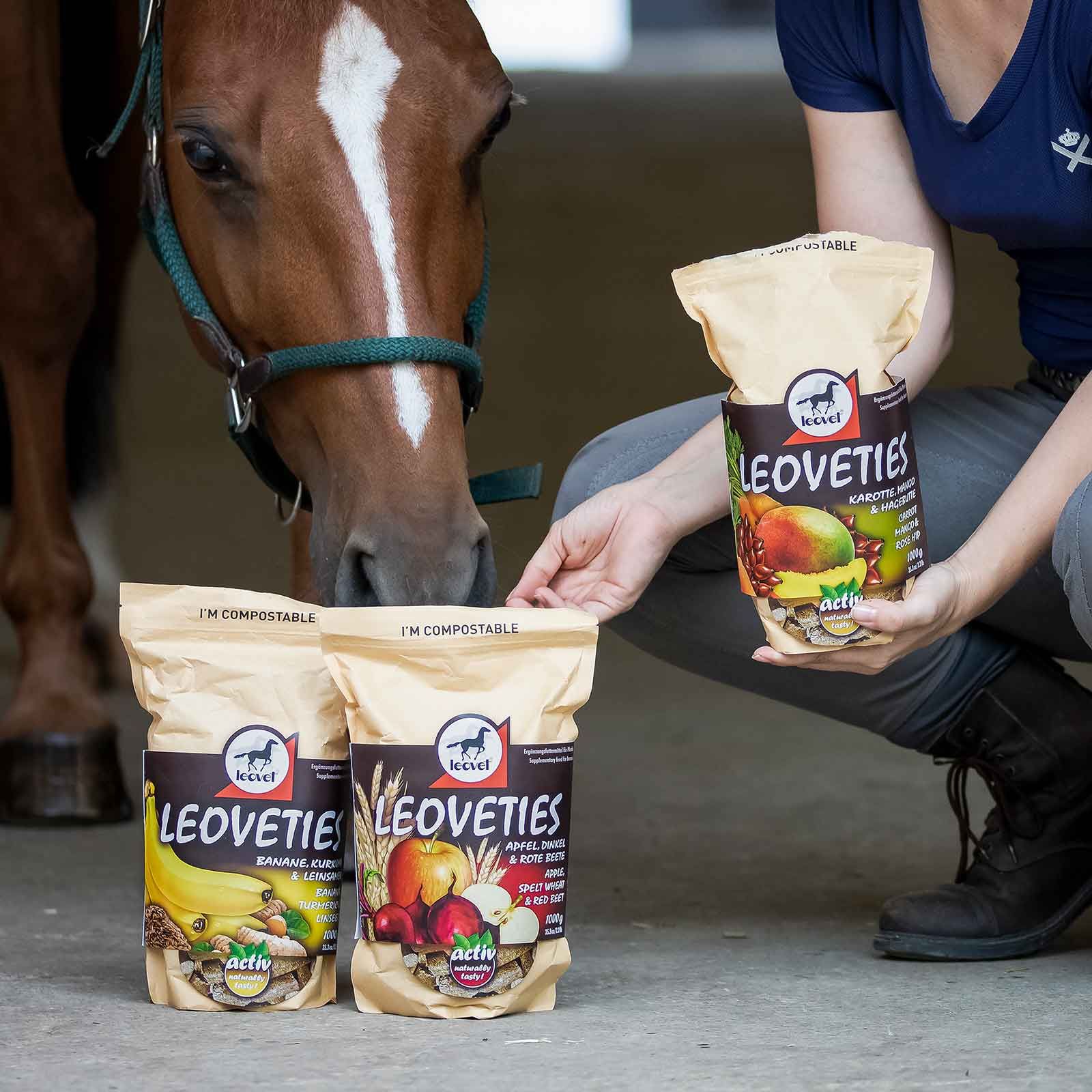 Leoveties-godiset från Leovet är en hälsosam belöning för hästar. Morötter innehåller värdefull betakaroten som ger en vacker, glänsande päls, frisk hud och starka hovar. Mango har en vitaliserande och balanserande effekt. Nypon innehåller värdefulla vitala och mineraliska ämnen i koncentrerad form och är därför bra för immunförsvaret. Ingredienserna blandas försiktigt vid låg temperatur för att skapa de läckra Leoveties hästgodisarna.