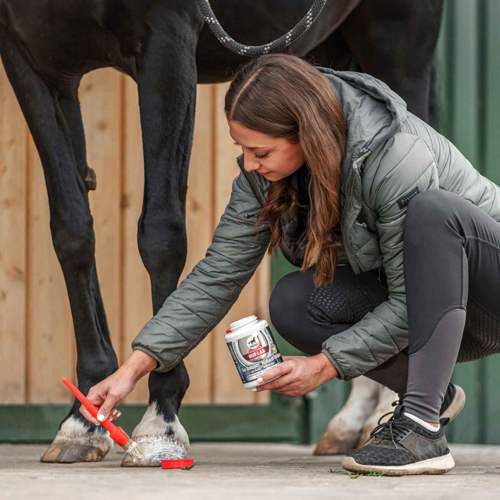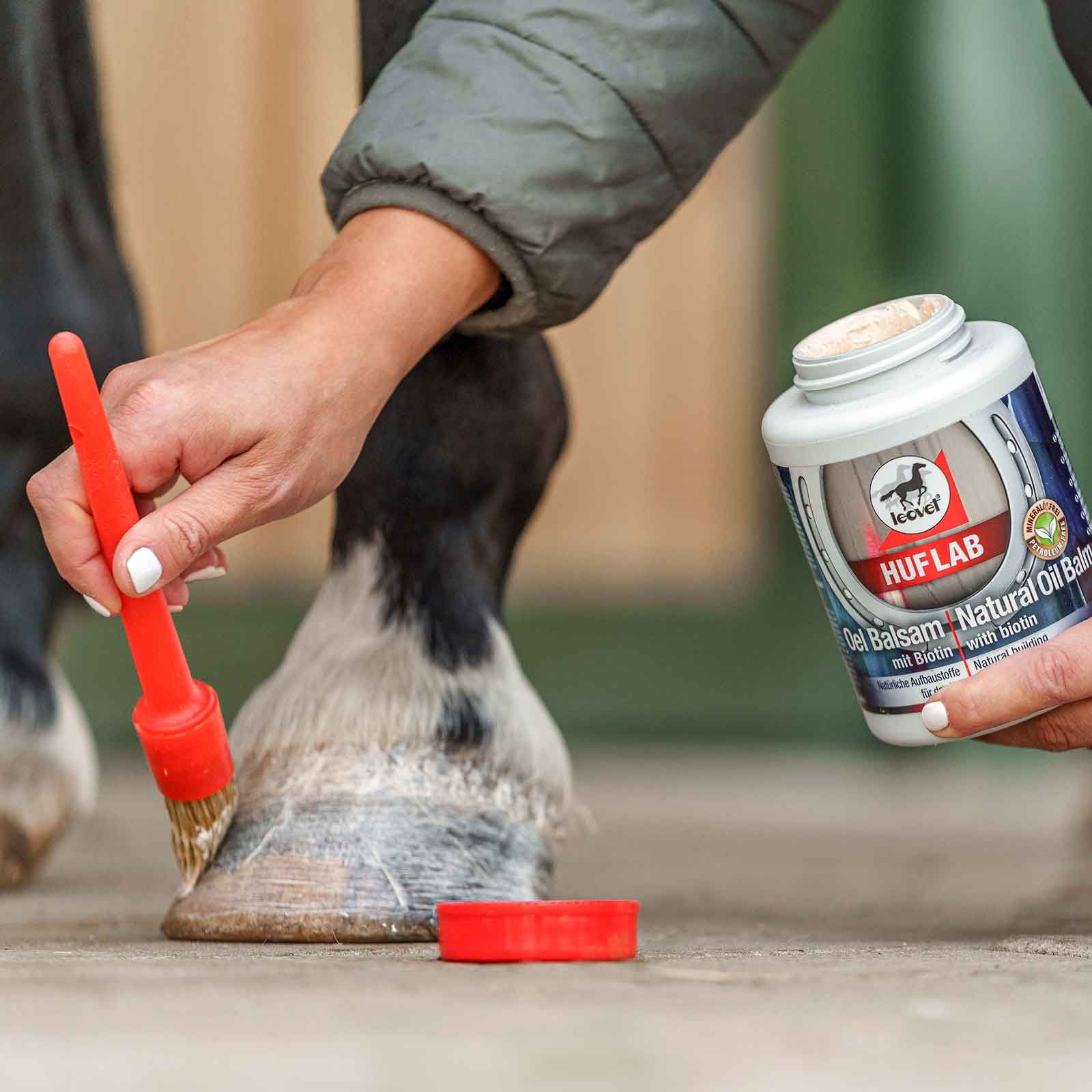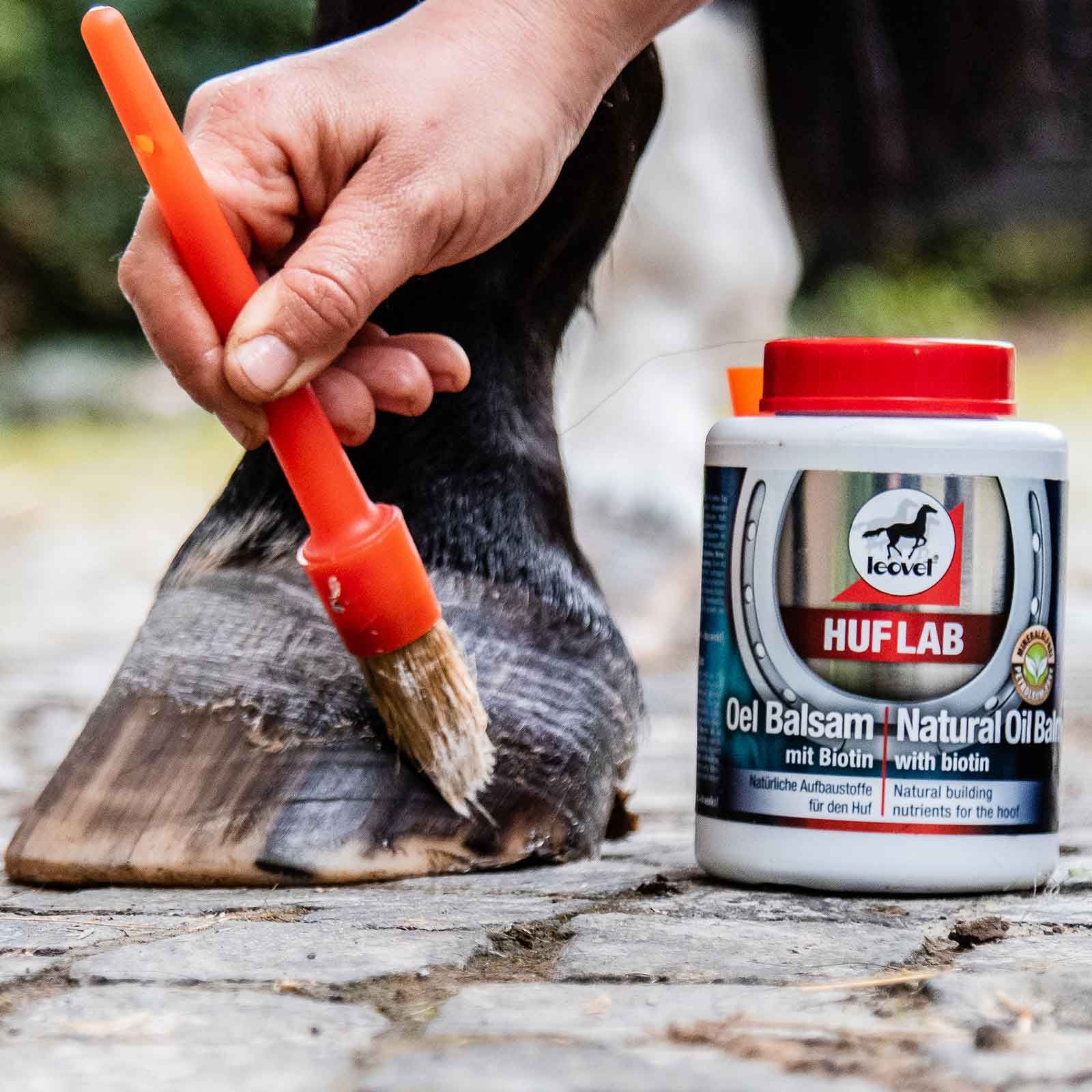 Leovets nya naturliga hovbalsam med borste för varje dag. Det krämiga hovbalsamet med naturligt närande oljor ger fasta och elastiska klövar. Det ingående biotinet är en av de vattenlösliga B-vitaminerna är känd för sin skyddande funktion av hud & hår. Det har en positiv effekt på horntillväxten och hoven stärks avsevärt. Med HUFLAB Oil Balm transporteras fukt djupt in i hornet. HUFLAB Oil Balm absorberas snabbt i kapillärerna och förbättrar hornets kvalitet avsevärt. För vackra glänsande hovar! Innehåller inget petrolatum, inga mineraloljor och inga parabener!