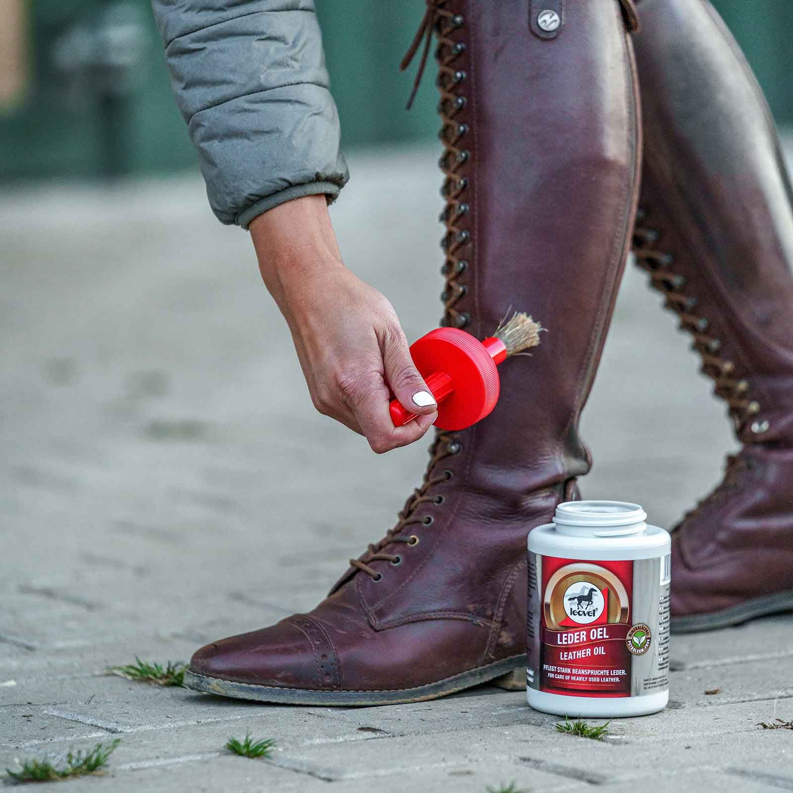 I bästa fall kan läderoljan även appliceras på svåråtkomliga områden med den integrerade borsten.