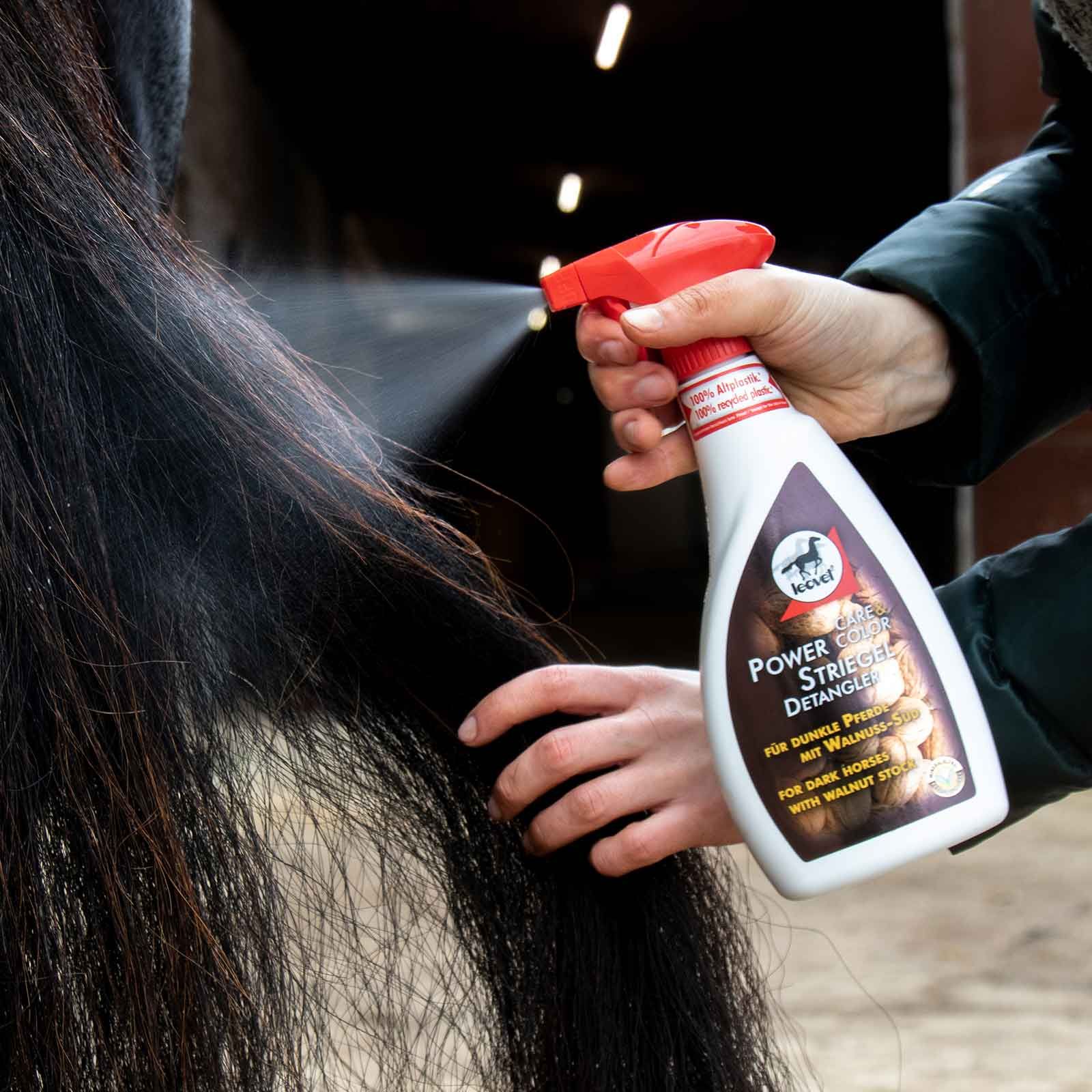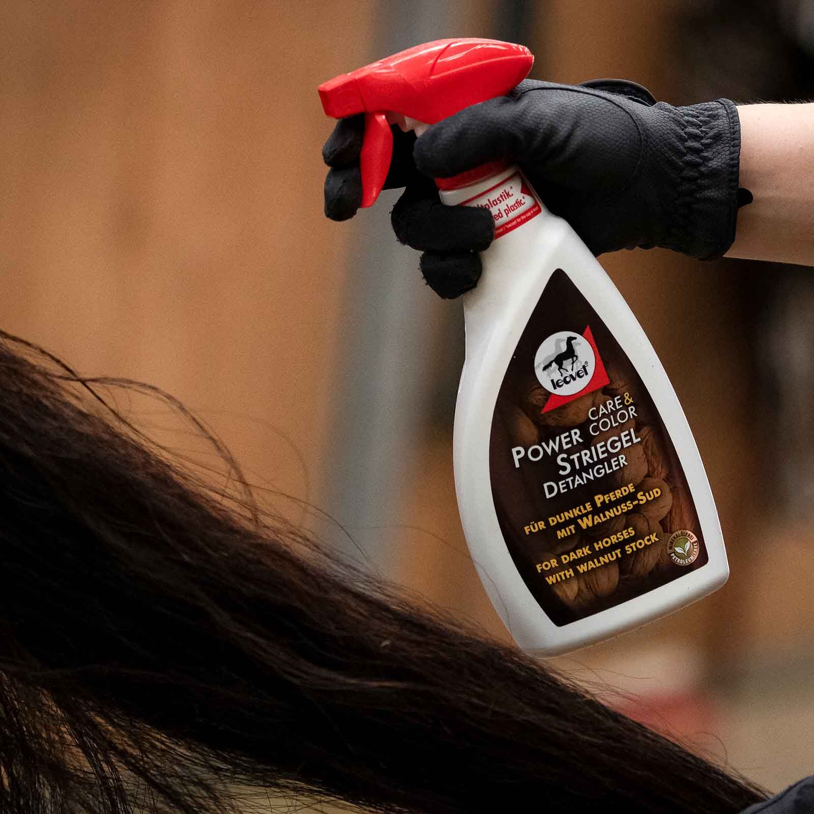 Leovet Power Striegel Walnut ger mörka hästar en stark glans, massor av volym och säkerställer snabb kamning av manen och svansen. Det medföljande UV-filtret skyddar även pälsen och långhåret från att blekna. Leovet Mane Spray framhäver hästens naturliga färg och avslöjar färgpigmenten i briljans.