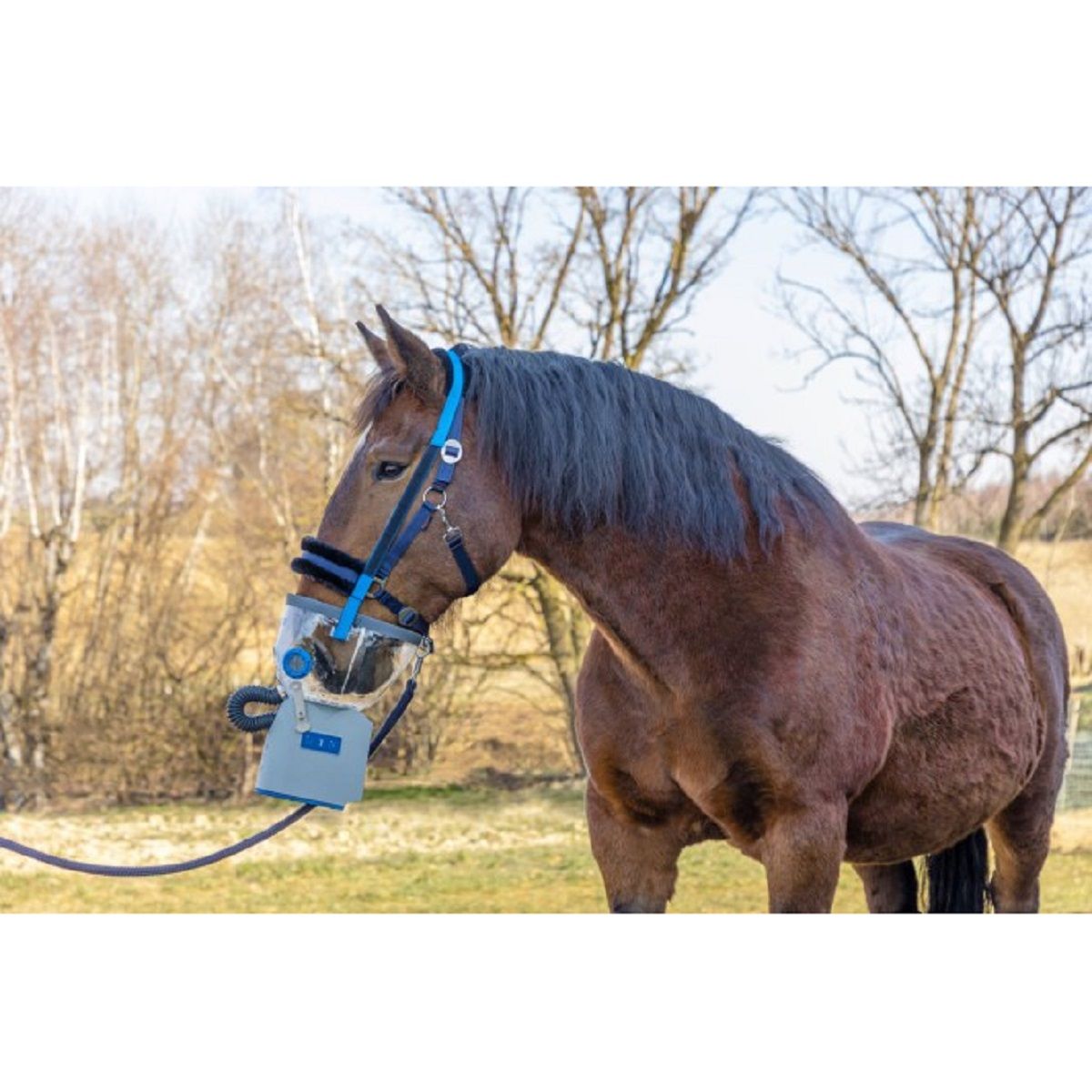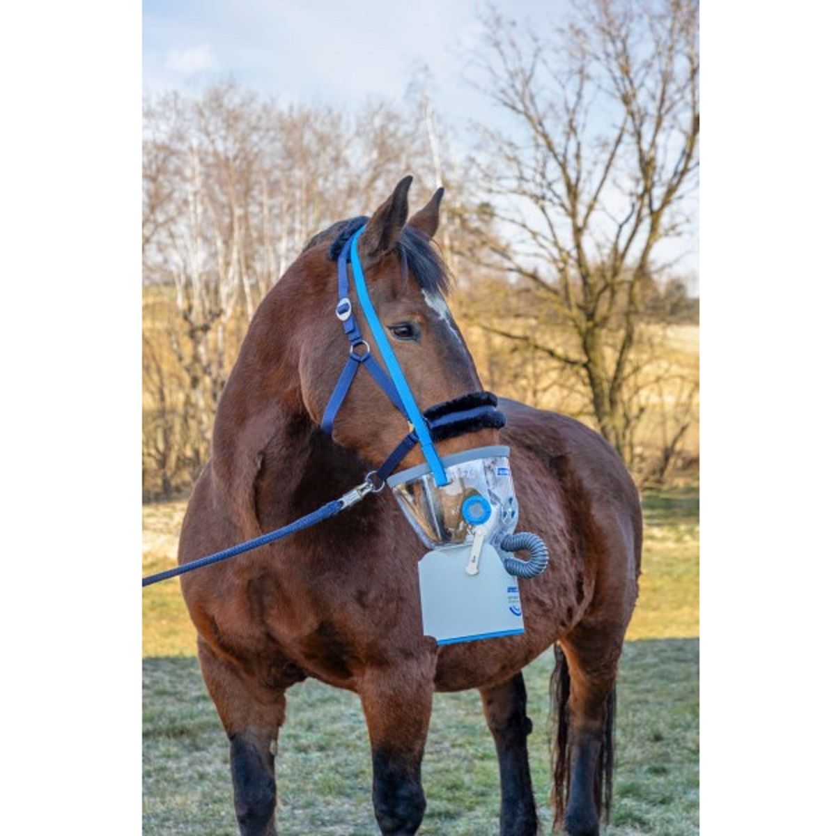 Den mjuka, avtagbara tätningsringen omsluter hästens mun och förseglar ordentligt under terapiprocessen. Överflödigt producerat slem kan enkelt avlägsnas från uppsamlingsbassängen i botten. Återflödesventilen förhindrar oönskat återflöde av de nebuliserade preparaten. Inhalationsmaskens friskluftsventil säkerställer individuell reglering av friskluftstillförseln. Sidoventilerna för utblåsning av andningsluften är avtagbara och lätta att rengöra.