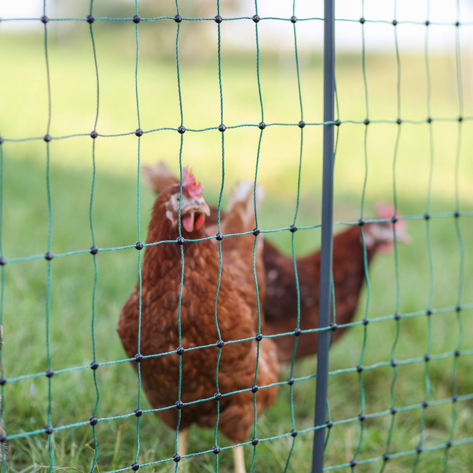 De 106 cm höga stolparna i betesstängslet är tillverkade av höghållfast termoplast med långa glasfiberfibrer. Denna kombination ger extremt god stabilitet och styvhet. Det glasfiberförstärkta materialet garanterar maximal UV-beständighet och hållbarhet. I motsats till konventionella stolpar är de nya Premium-stolparna betydligt styvare och mindre känsliga för böjning vid dragbelastning, vilket särskilt gäller i början och slutet av nätet och i hörnen. Detta innebär att hönshägnets tillförlitliga och upprättstående ställning kan garanteras - även under krävande väderförhållanden. Stolparna innehåller var och en en huvudisolator och en jordstoppare för ett särskilt säkert grepp. Den förstärkta översta strängen på hönsnätet förhindrar dessutom att det hänger ihop. En plasttätning vid varje korsningspunkt för maskorna, som är oåterkalleligt svetsad, säkerställer också de goda hattningsegenskaperna.