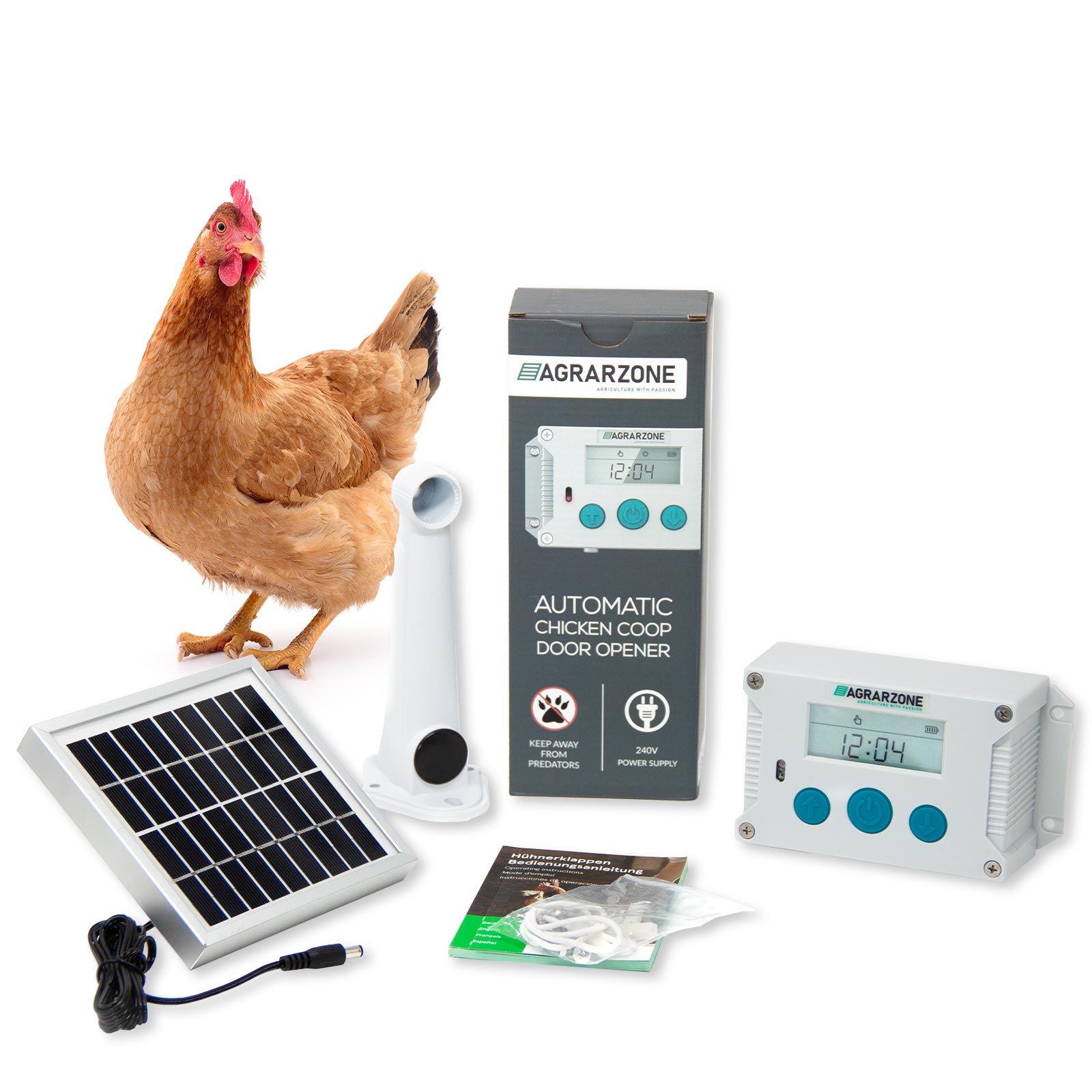 Fjäderfäklaffen har flera funktioner för att öppna eller stänga klaffen. Fjäderfäklappen öppnar den vertikala skjutdörren till ditt fjäderfä- eller kycklinghus med ljussensor när det blir ljust och stänger dörren igen när det blir mörkt. Kycklingdörren kan också styras med en timerfunktion. En kombination av ljussensor- och timerlägena är också möjlig. Öppnings- och stängningsfunktionen kan också manövreras direkt på enheten.