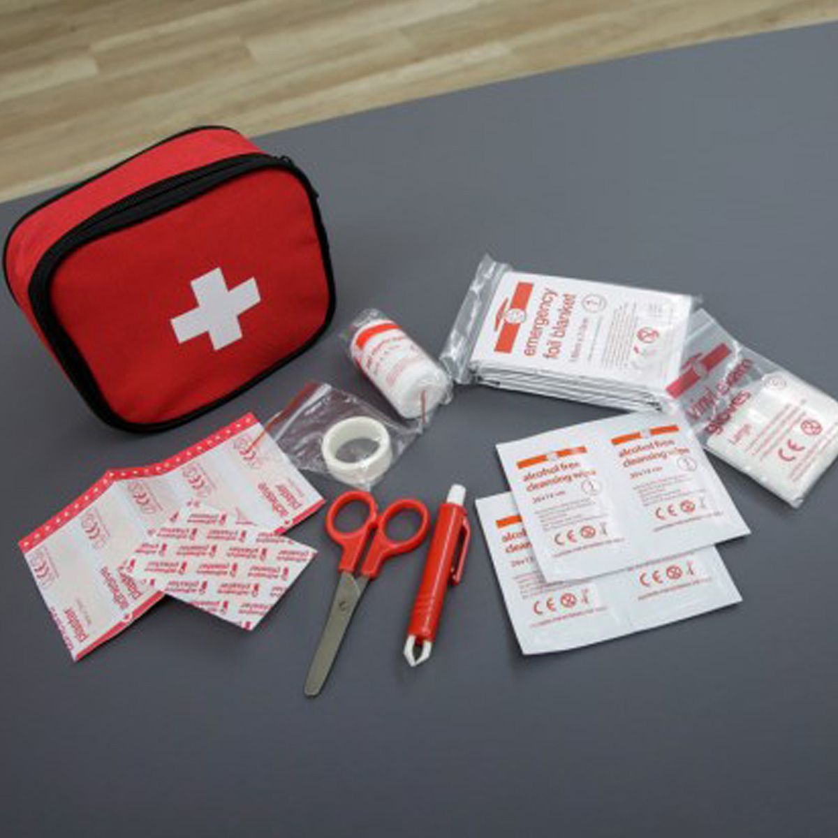 Första hjälpen-väskan innehåller grundläggande utrustning för snabb första hjälpen-behandling av små sår och skador. Första hjälpen-kitet innehåller plåster, handskar, tejp, rengöringsdukar, bandagesaxar, tickpincetter, gasbinda och en räddningsfilt. De viktigaste verktygen för snabb första hjälpen finns alltså i detta praktiska mini-förbandskit.
