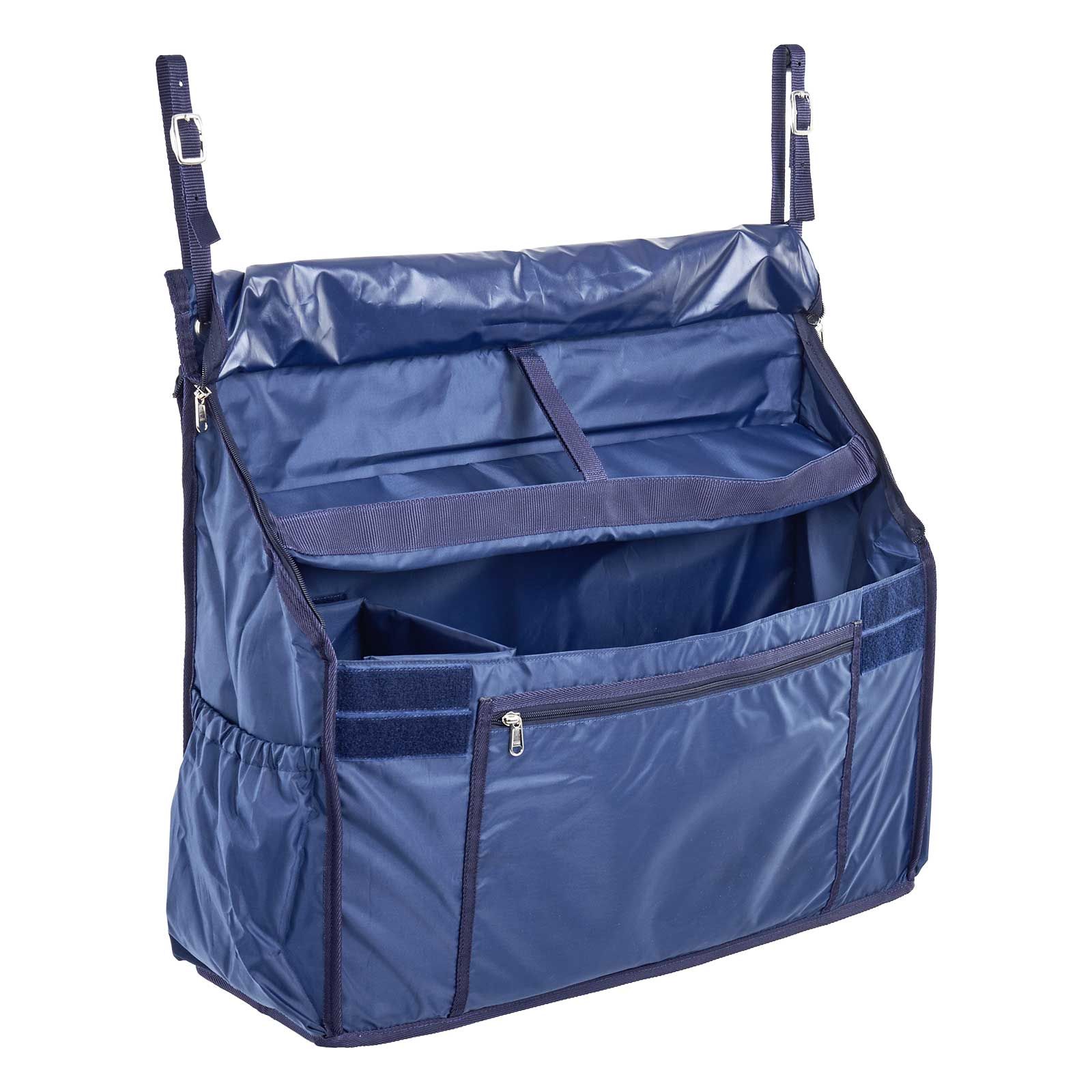 Den eleganta stallväskan är en mycket robust hängande väska för snygg och ordnad förvaring av många tillbehör i stallet. Filtar, bandage, stövlar, klockor, putsutrustning, sprayer, krämer och mycket mer kan förvaras i den praktiska boxväskan. Stallväskan kan fästas flexibelt, snabbt och utan att lämna några rester på t.ex. stängerna på stallfronten. För att förhindra att damm kommer in i väskan kan smutsskyddet stängas med dragkedjor och kardborreband. Busse boxväska har en rymlig insida med förstärkta väggar, justerbar skiljevägg och förvaringsfack. Praktiska ytterfack erbjuder ytterligare förvaringsutrymme för mindre tillbehör.