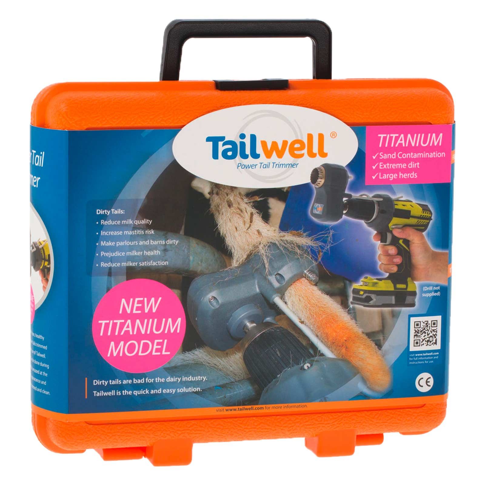 Tailwell 2 Tail Trimmer är den logiska vidareutvecklingen av den framgångsrika modellen från Nya Zeeland. Tailwell 2 utvecklades för att göra det tråkiga arbetet med att trimma svanshår lättare för mjölkkor. Det är viktigt att ta bort svanshår från kor som är förorenade av avföring och urin för att få en optimal hygien för besättningen, mjölken och mjölkaren. Titanium-versionen kännetecknas av extrem hållbarhet tack vare bladens högkvalitativa titannitridbeläggning. Den är därför särskilt lämplig för stora hjordar eller djur som ligger på sand. Det är inte nödvändigt att klippa håret i förväg, även om det är kraftigt nedsmutsat eller krystat. TailWell 2 Titanium arbetar extremt tyst och behöver bara några sekunder per svans - perfekt även under mjölkningsprocessen!
