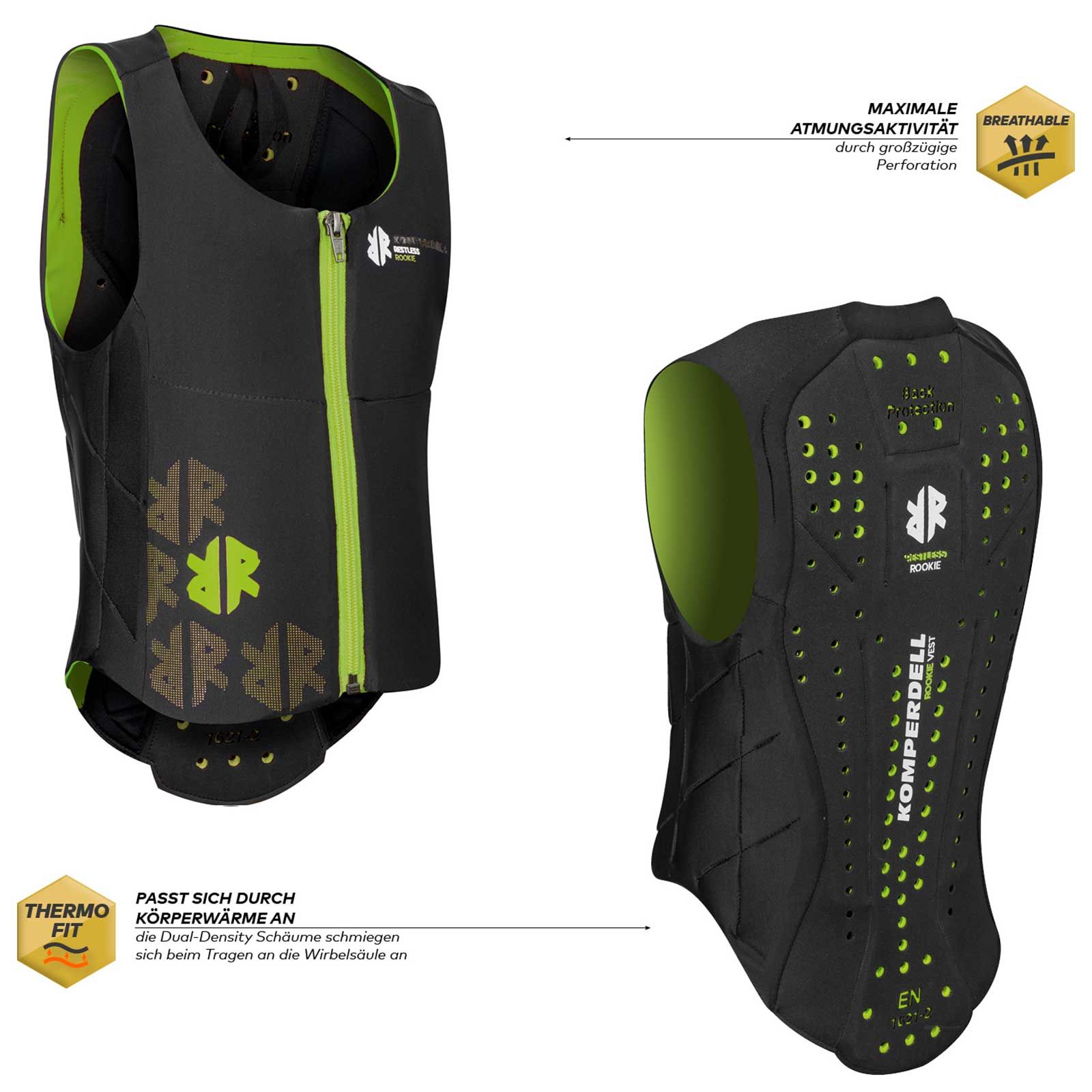 Det EN 1621-2 - nivå 1 testade ryggskyddet med revbensskydd erbjuder optimal rörelsefrihet och behaglig komfort tack vare den lätta konstruktionen och den smala designen. Komperdell ryggskydd för barn har också en chic design för pojkar och flickor. Den kontinuerliga perforeringen av skyddszonerna garanterar maximal andningsförmåga. Komperdells säkerhetsväst är utrustad med en dragkedja framtill, vilket gör den lätt att ta på och av.