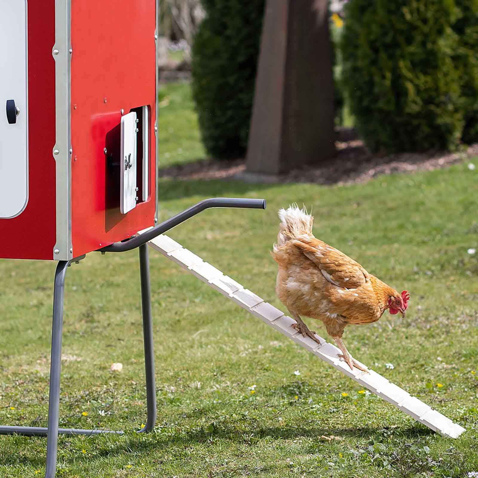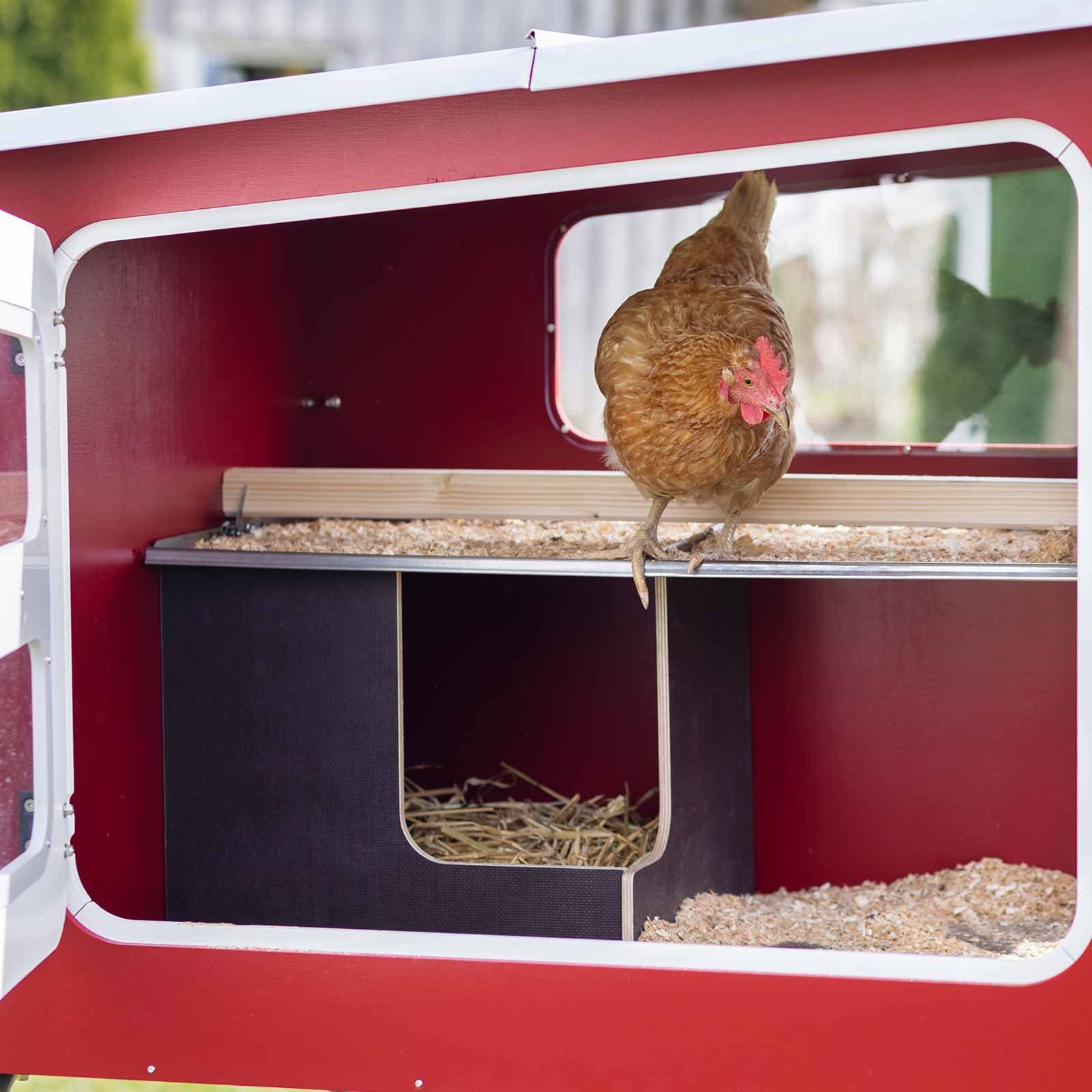 Hönshuset Mobile Coop har en hönsstege och en sittpinne som dina fjäderfävänner älskar att sitta på. Avfallsfacket under sittbrunnen gör att du inte behöver byta strö på detta område varje dag. Avfallsbrädan kan tas bort och rengöras hygieniskt tack vare den högkvalitativa beläggningen i rostfritt stål.