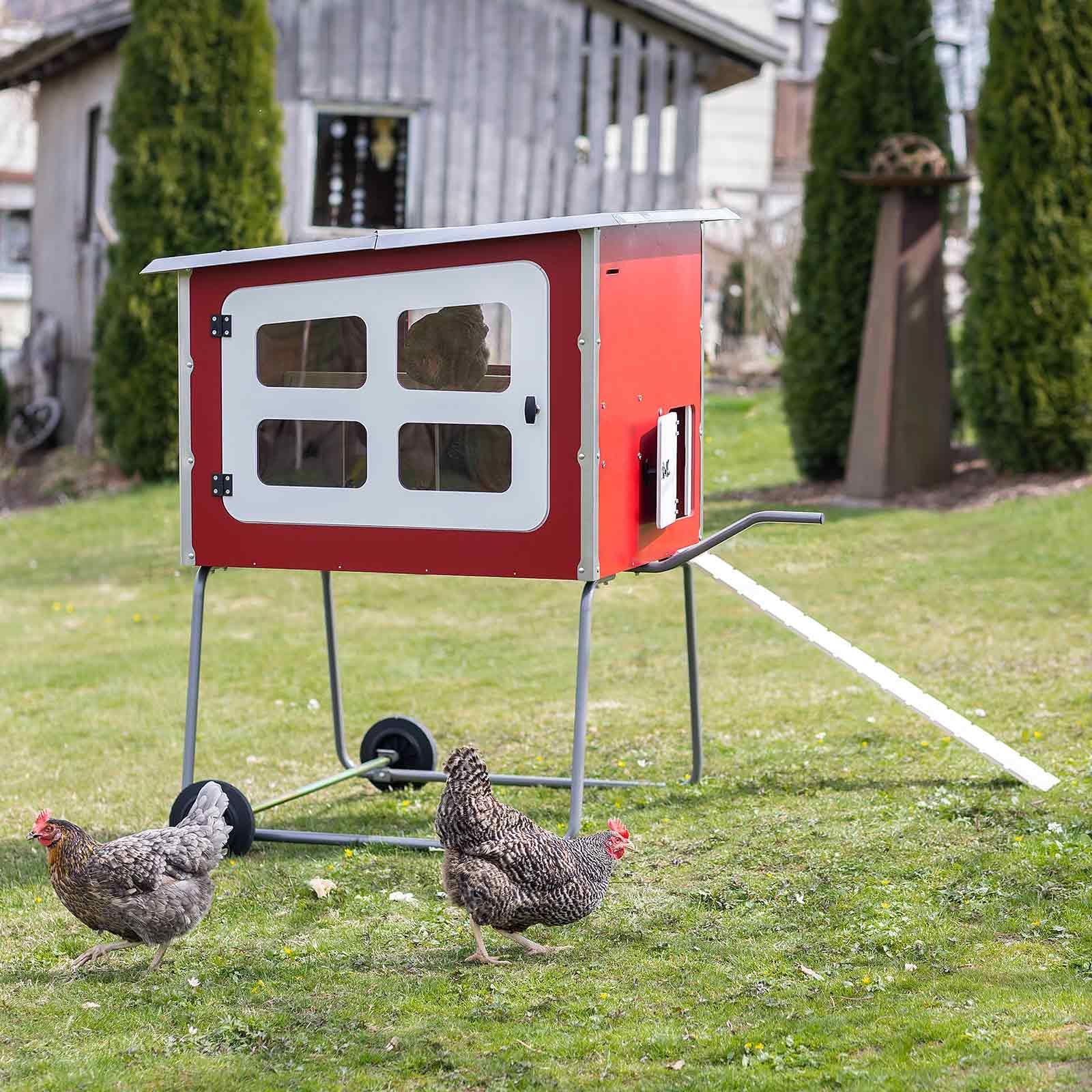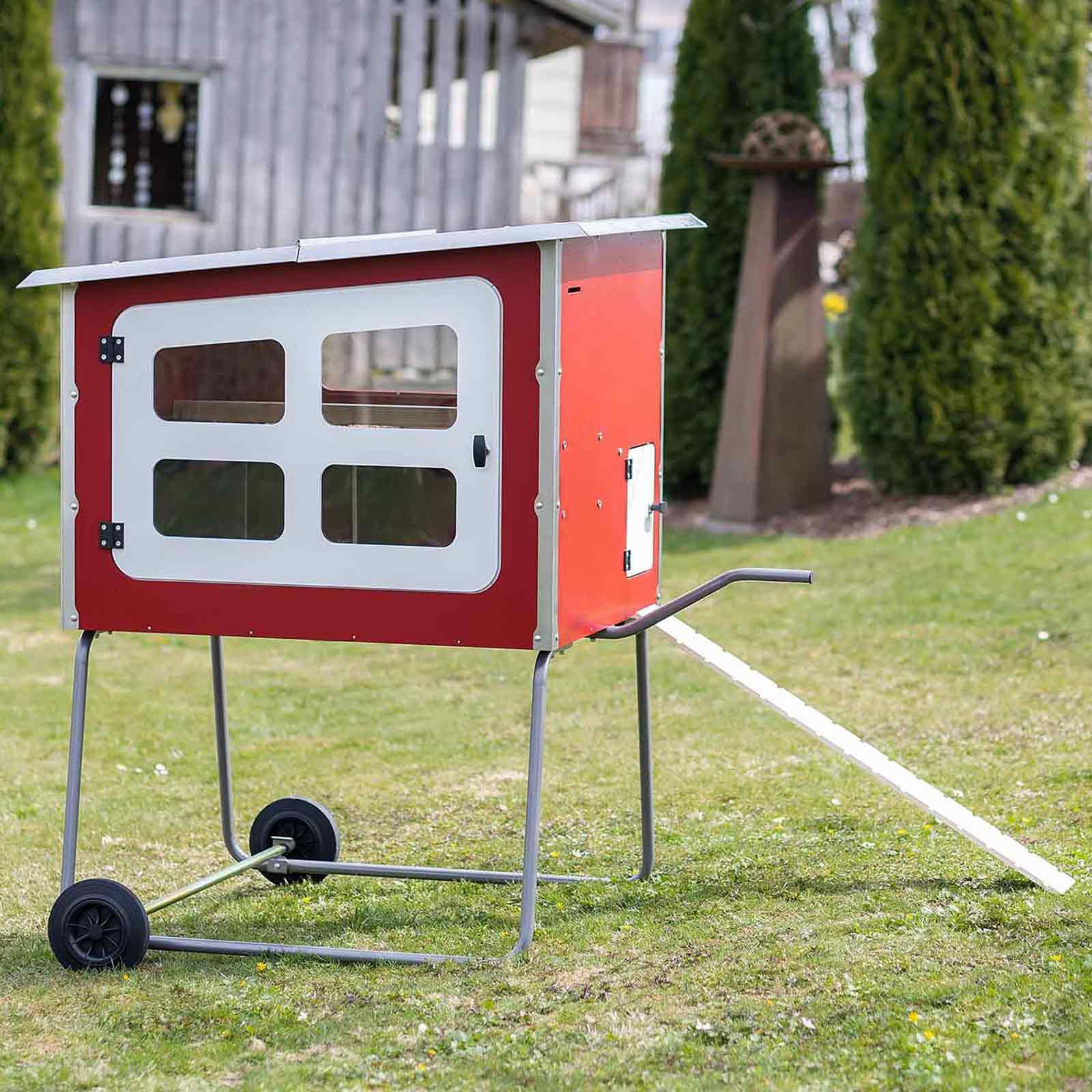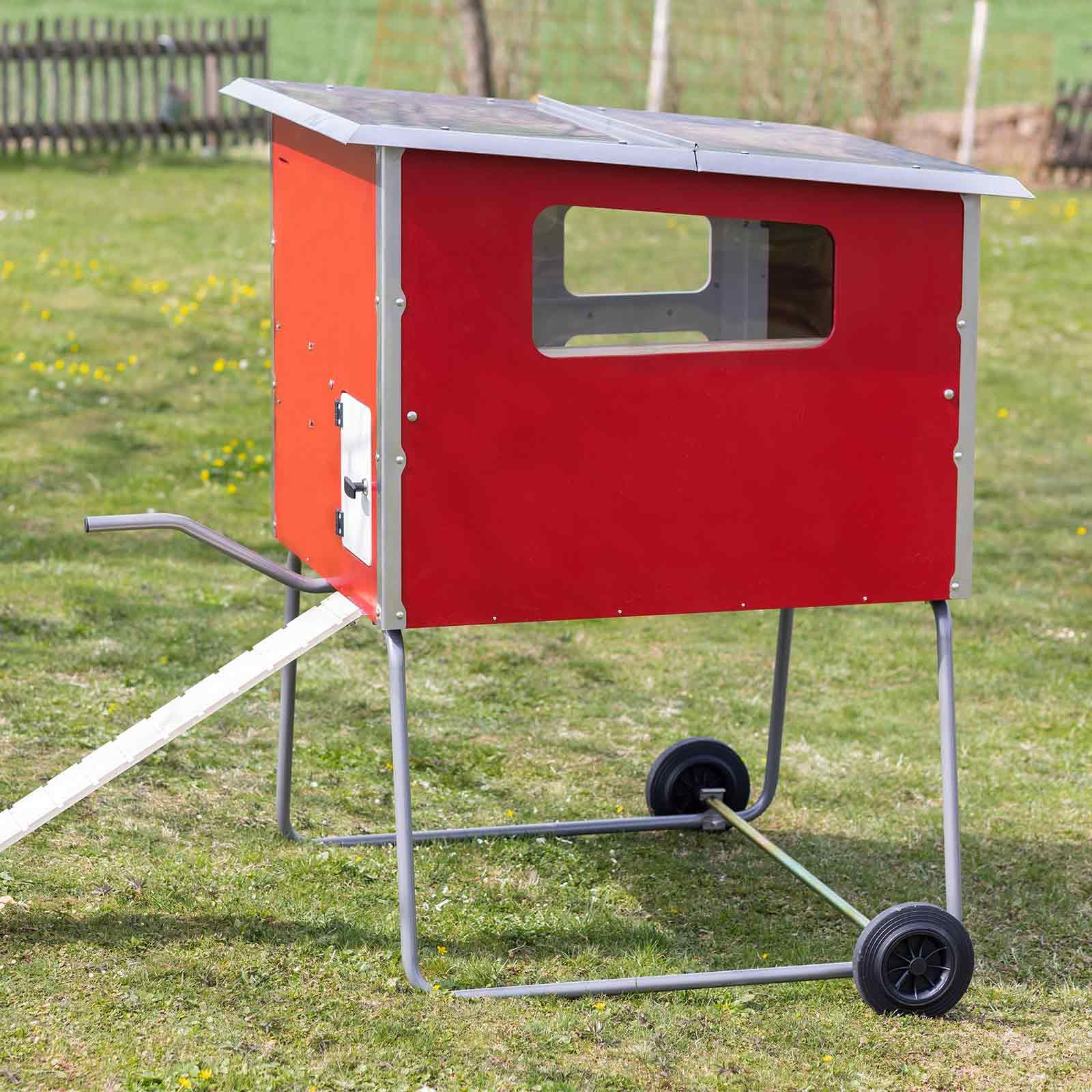 Mobile Coop är utformad för mobil användning. En mycket stabil metallram med två hjul och ett handtag på sidan gör det enkelt att lyfta och flytta hönshuset. Hönshuset "Made in Germany" är utrustat med ett högkvalitativt tak av rostfritt stål. Tack vare den mycket robusta och innovativa konstruktionen med hållbara skruvar och beslag av hög kvalitet är ett permanent hem för dina höns garanterat.