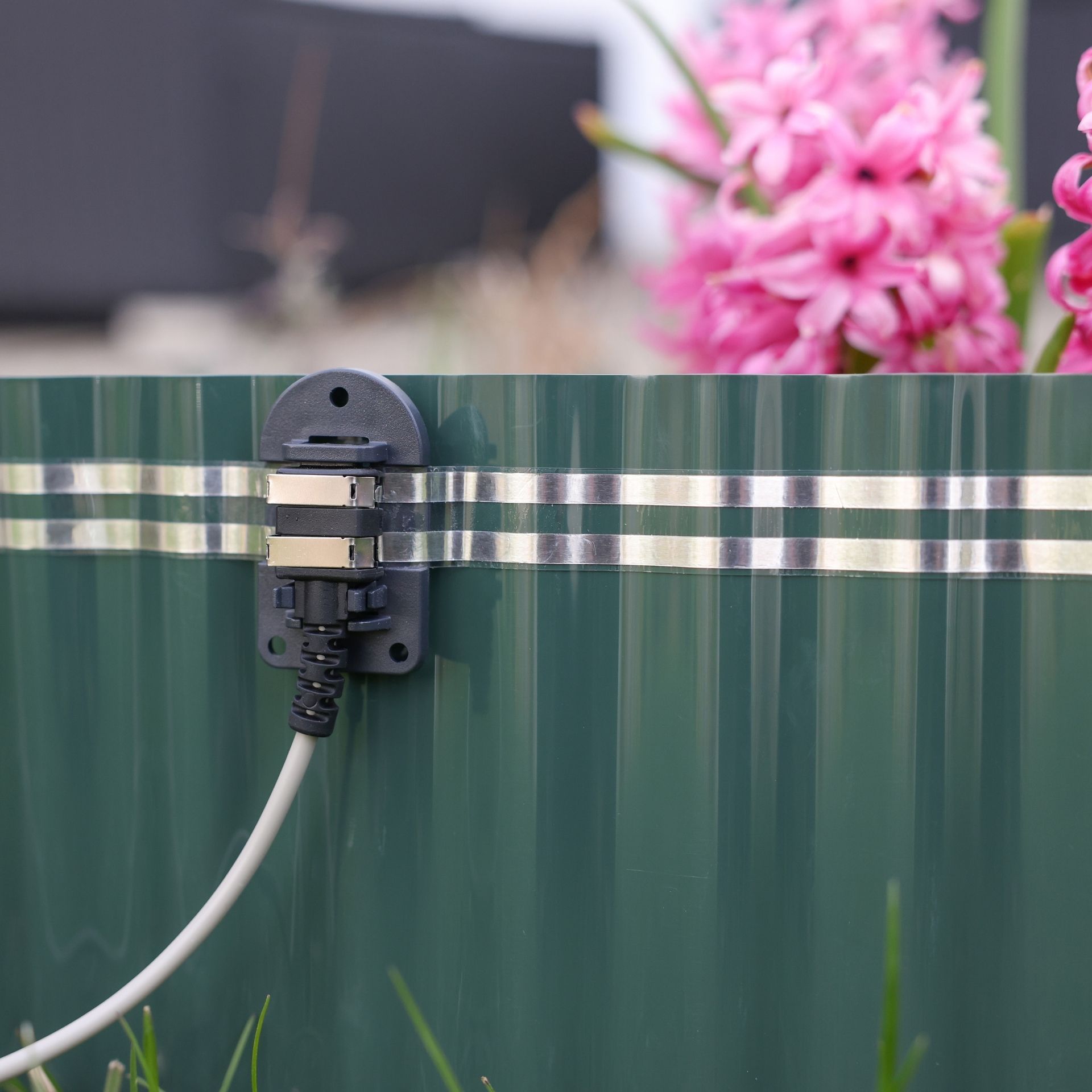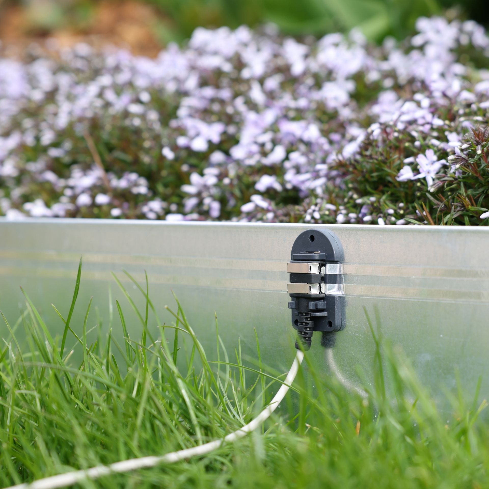 Det krävs inga förkunskaper för att ansluta stängslet till kraftstationen. Staketbandet kan anslutas och strömförsörjas med hjälp av kontaktklämman på strömförsörjningsenheten. Två lysdioder på strömförsörjningsenheten gör det möjligt att övervaka batteriets status och strömförsörjningen på ett säkert sätt. Batteriet räcker till en hel snigelsäsong tack vare den innovativa pulskontrollen!