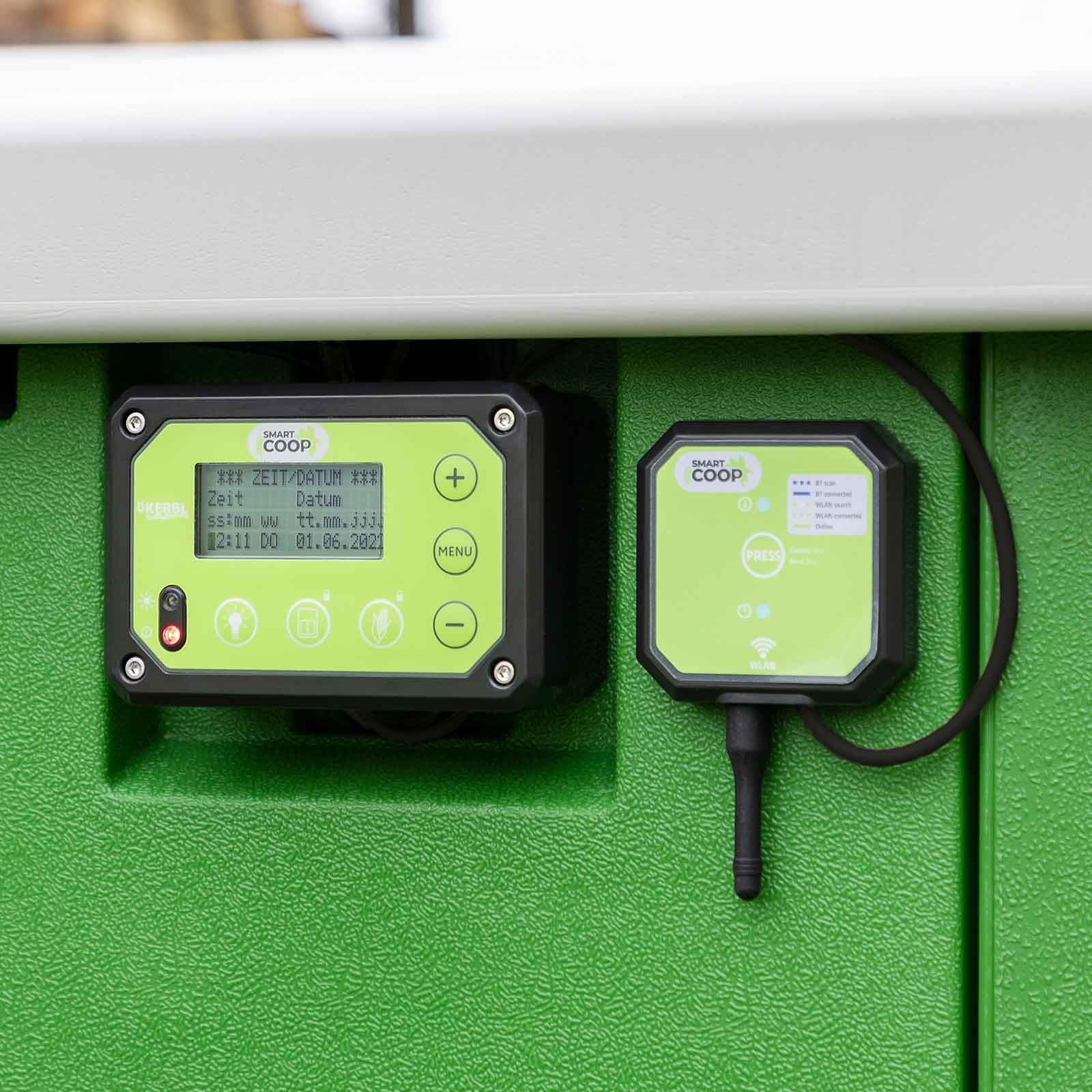 With the WLAN-enabled connectivity module from SmartCoop, controlling the chicken flap, coop lighting, drinker heating, coop ventilation and more is child's play. To do this, you need the SmartCoop app and a connection to the local wifi. In combination with the SmartCoop control system, you then take over full full control over all functions of the system.