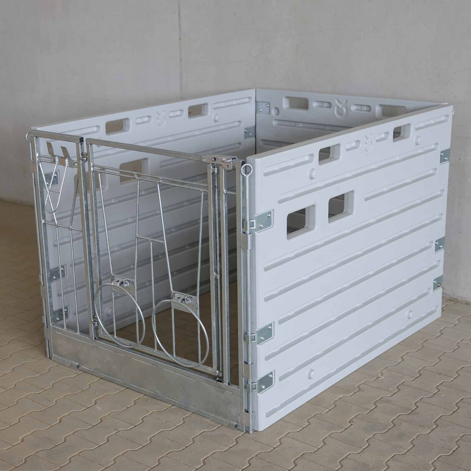 Kalvboxen med en enda box kan friståendeoch kan snabbt och enkelt sättas upp av en person. The 3 paneler och det främre elementet kan enkelt anslutas för att skapa en ny enkel kalvbox. Vid behov kan enskilda boxar också kopplas ihop för grupphållning genom att ta bort en sidopanel och koppla ihop boxarna med låsstängerna.